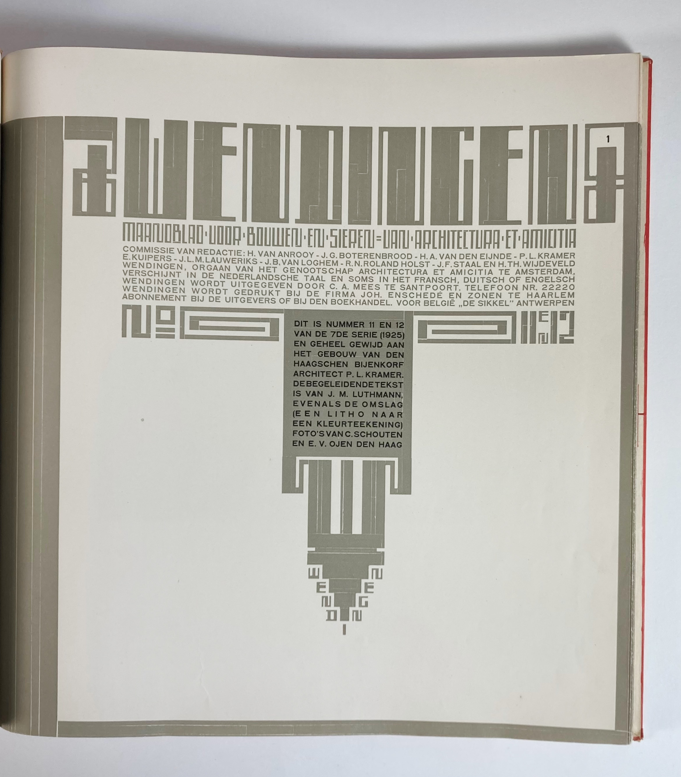 WENDINGEN. Jg. VII, nr. 11/12: LUTHMANN, J.M. Het gebouw v.d. Haagschen Bijenkorf architect P.L. Kramer. Amst., 1925. 4°. Threaded cord obrds. Cover des. by the author.