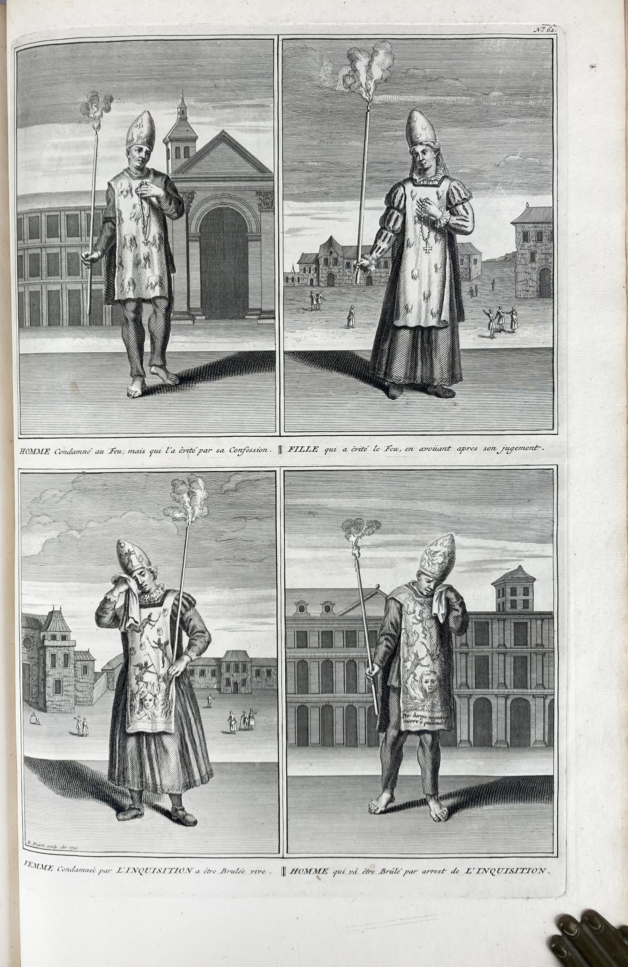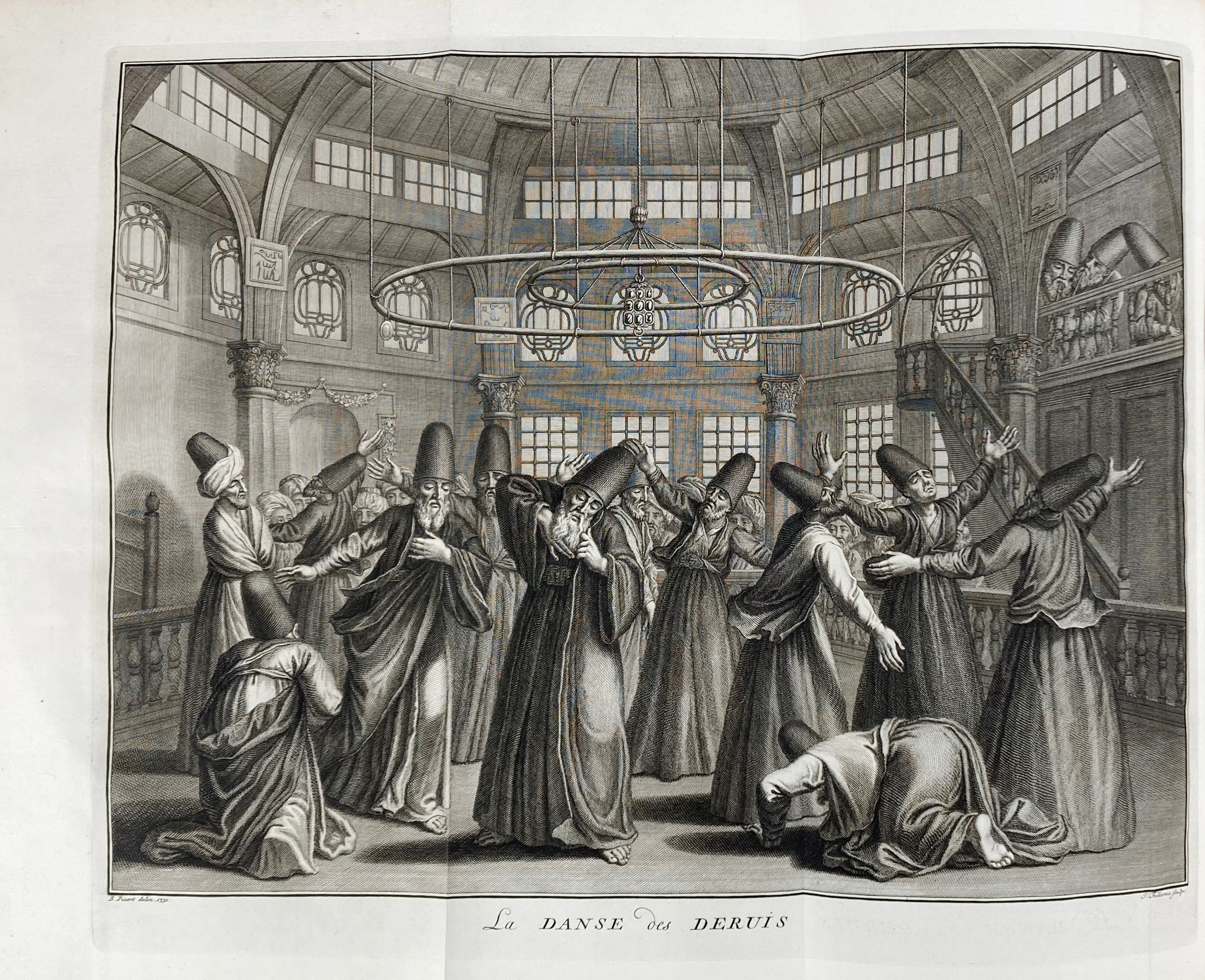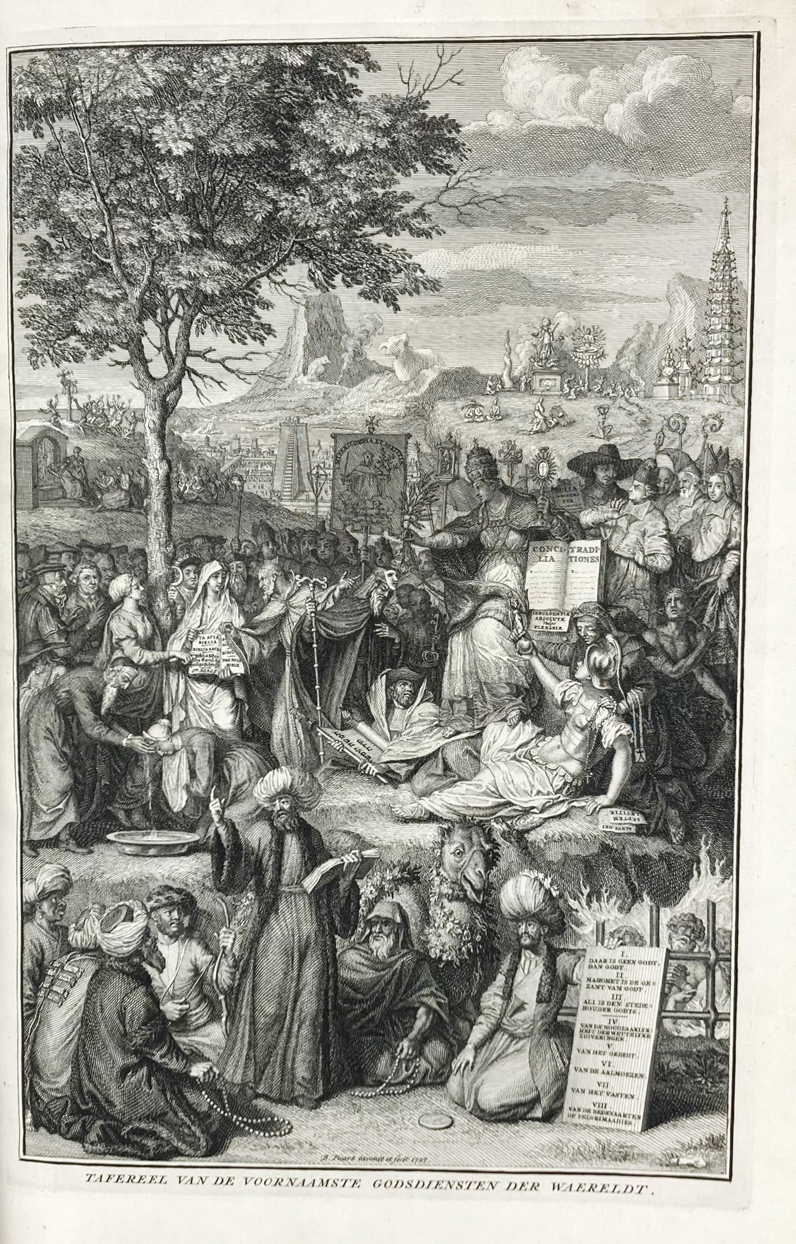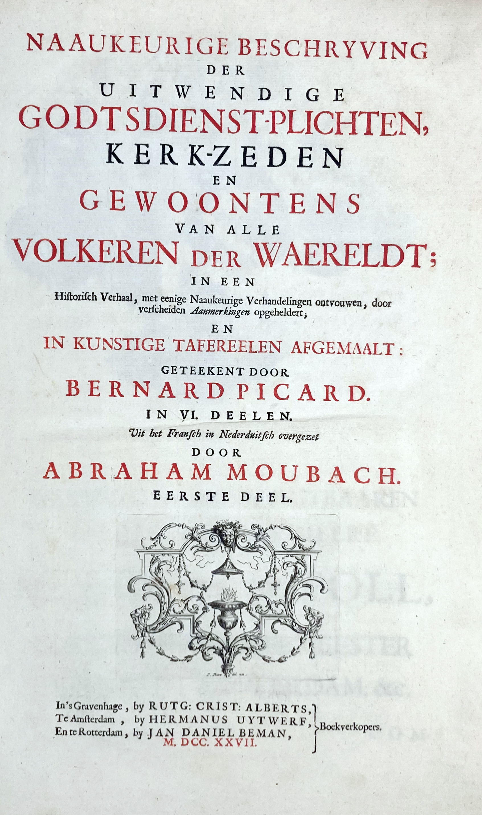 MOUBACH, A. Naaukeurige beschryving der uitwendige godtsdienst-plichten, kerk-zeden en gewoontens van alle volkeren der waereldt. The Hague (etc.), R.C. Alberts, (etc.), 1727-38. 6 vols. W. engr. front., 1 dedicatory engr., sev. engr. headpieces & 224 engr. plates (some fold./double-p.), for the greater part by B. Picard. Fol. Cont. vellum w. raised bands & brown labels w. gilt lettering, blind tooled & blind ruled sides, speckled edges. (Vol. 1: modern h. vellum w. cont. spine laid on, vol. 2 upper joints split, last plate of vol. 6 partly handcold., fine interior condition, bindings sound).