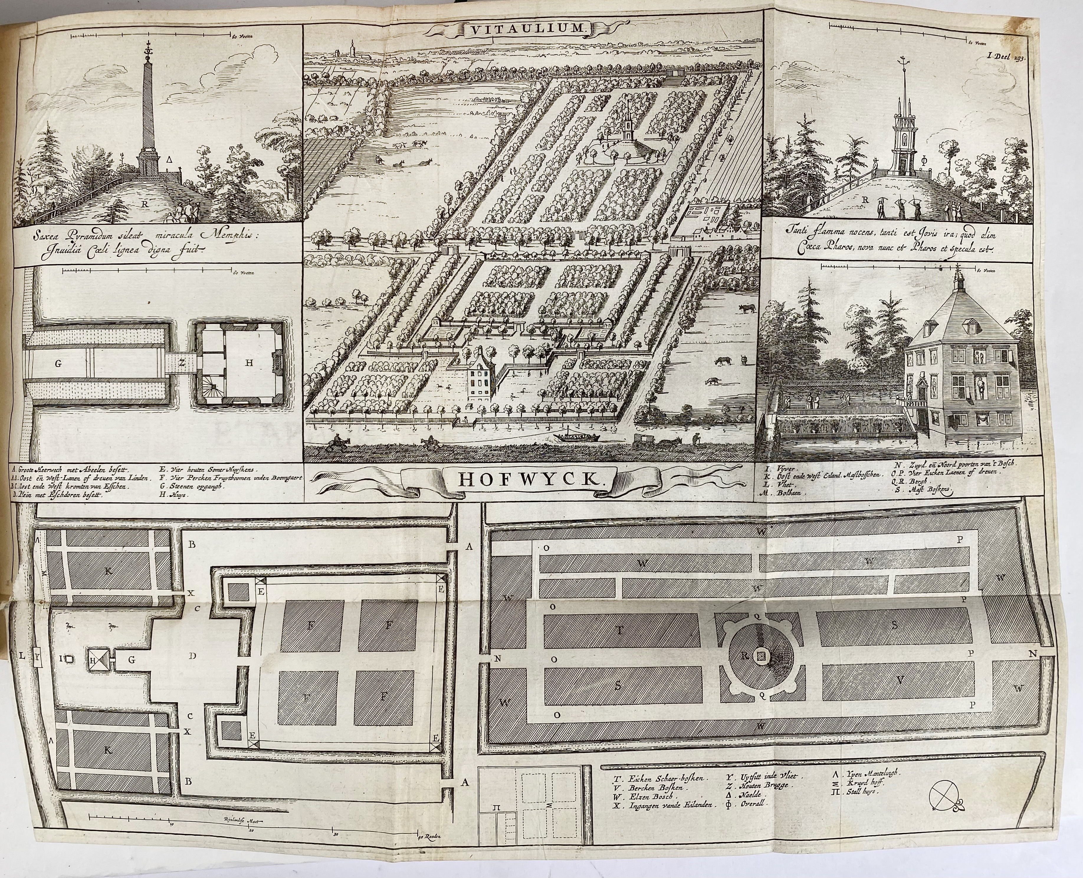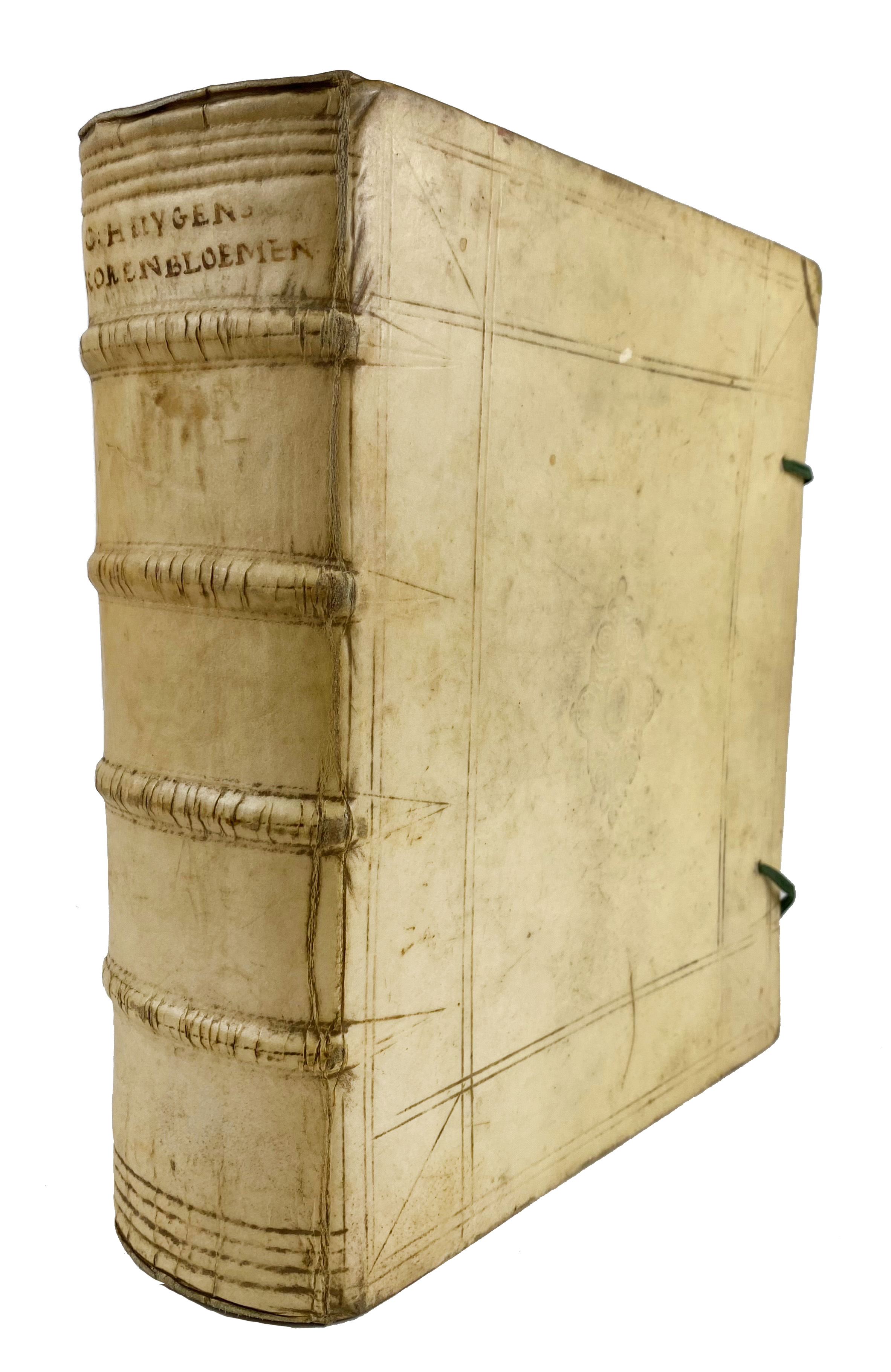 HUYGENS, C. Koren-bloemen. Nederlandsche gedichten. 2e dr. Amst., J. v. Ravesteyn, 1672. 2 in 1 vol. (28), 732; (2), 574 pp. W. engr. front., 1 full-p. portr. by A. Blotelingh, 1 fold. engr. ('Zee-straet') by R. de Hooghe & 1 fold. engr. w. plans & views of 'Hofwyck'. 4°. Cont. blind tooled vellum w. raised bands & ties. (Ties renewed, first 3 lvs. loose, lower outer corner of a few lvs. waterstained, sl. age-toned).