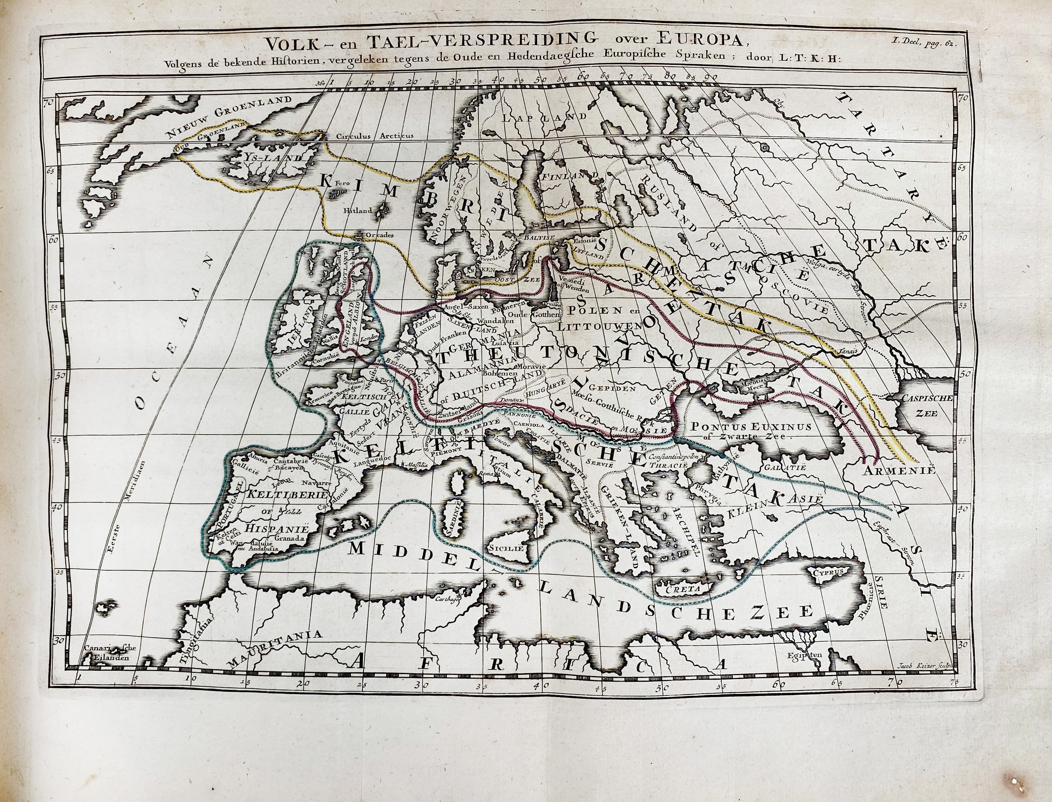 Containing the first scientific etymological dictionary of (a part of) the Dutch language (vol. 2, pp. 103-748). Ten Kate (1674-1731), discovered the so-called sound-shifting in the Germanic languages by investigating the consonant changes almost a century before the German linguist Jacob Grimm laid down his theory on the same subject (which became known as Grimm's law) in 1822. - Claes 191; NNBW V, 295-6: "meesterwerk (...) vlot en zuiver van stijl (...) een der grondleggers van de historisch-vergelijkende taalstudie (...)".€ 150