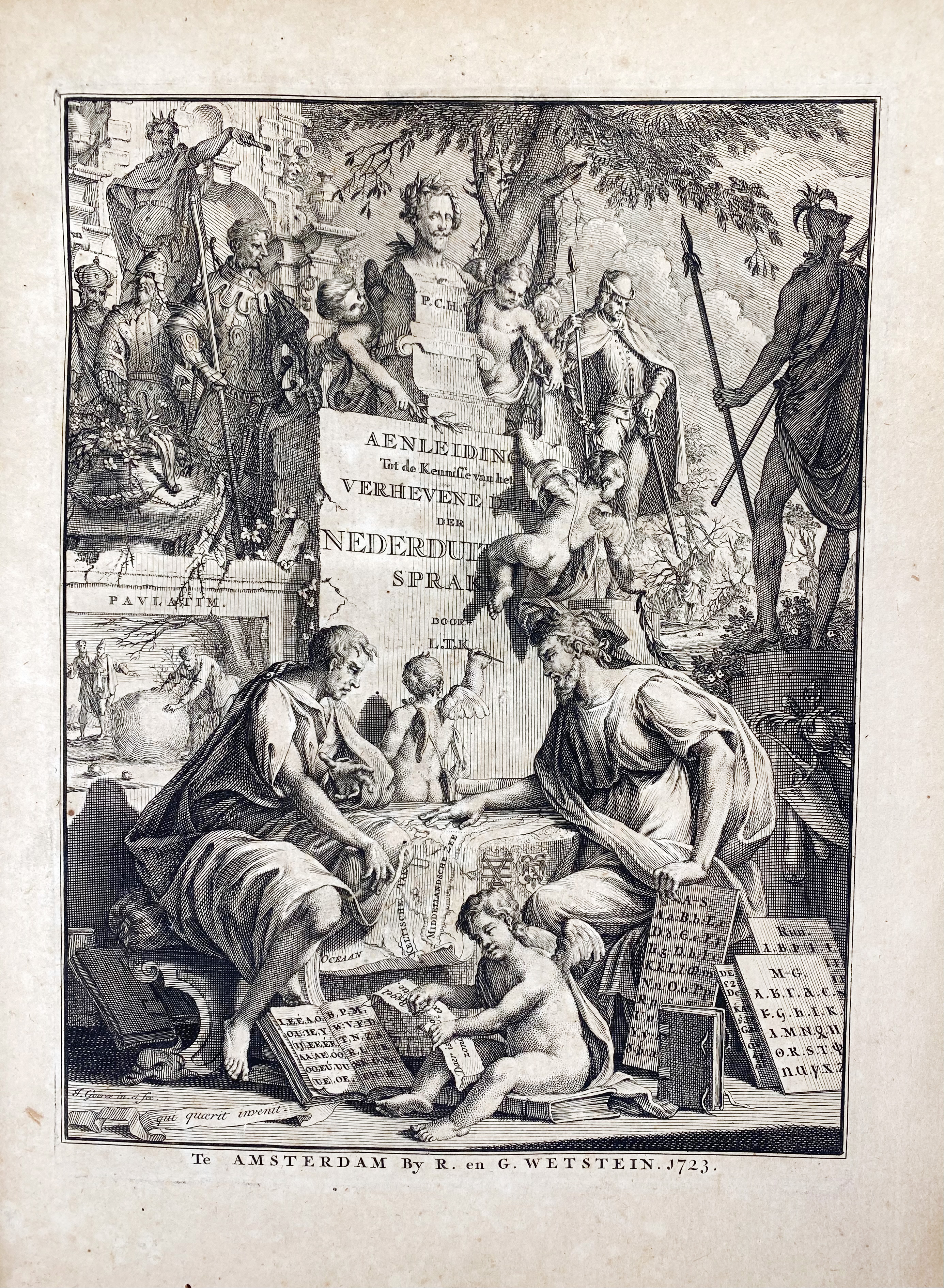 KATE, L. ten. Aenleiding tot de kennisse van het verhevene deel der Nederduitsche sprake. Amst., 1723. 2 vols. (46), 744; (8), 748, (2) pp. W. engr. ti. & 2 engr. headpieces by J. Goeree & 1 fold. map of Europe w. cold. isoglosses. 4°. Cont. blind tooled vellum w. raised bands. (A bit browned/foxed, old name entry on free endpaper, else a fine set).