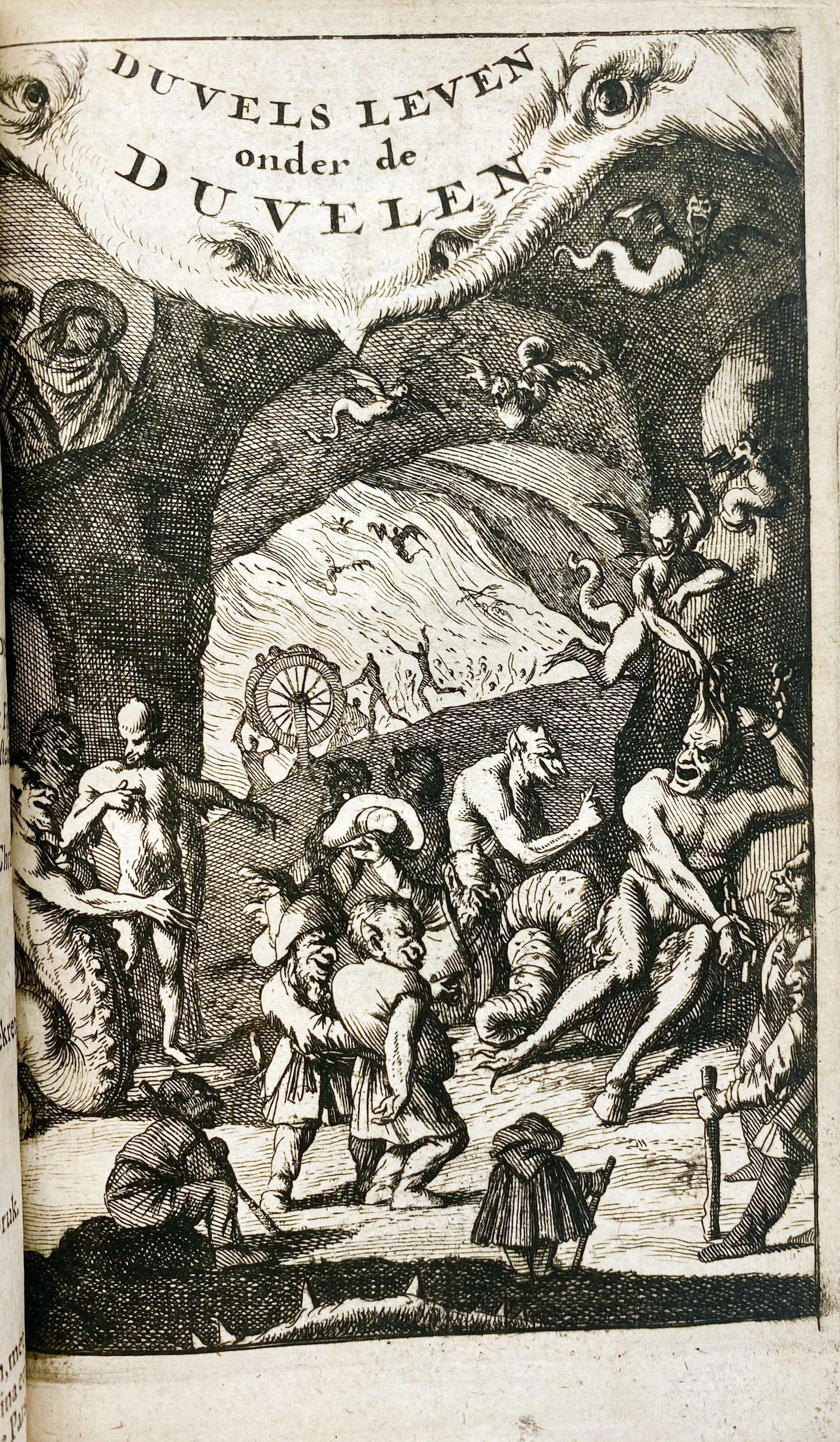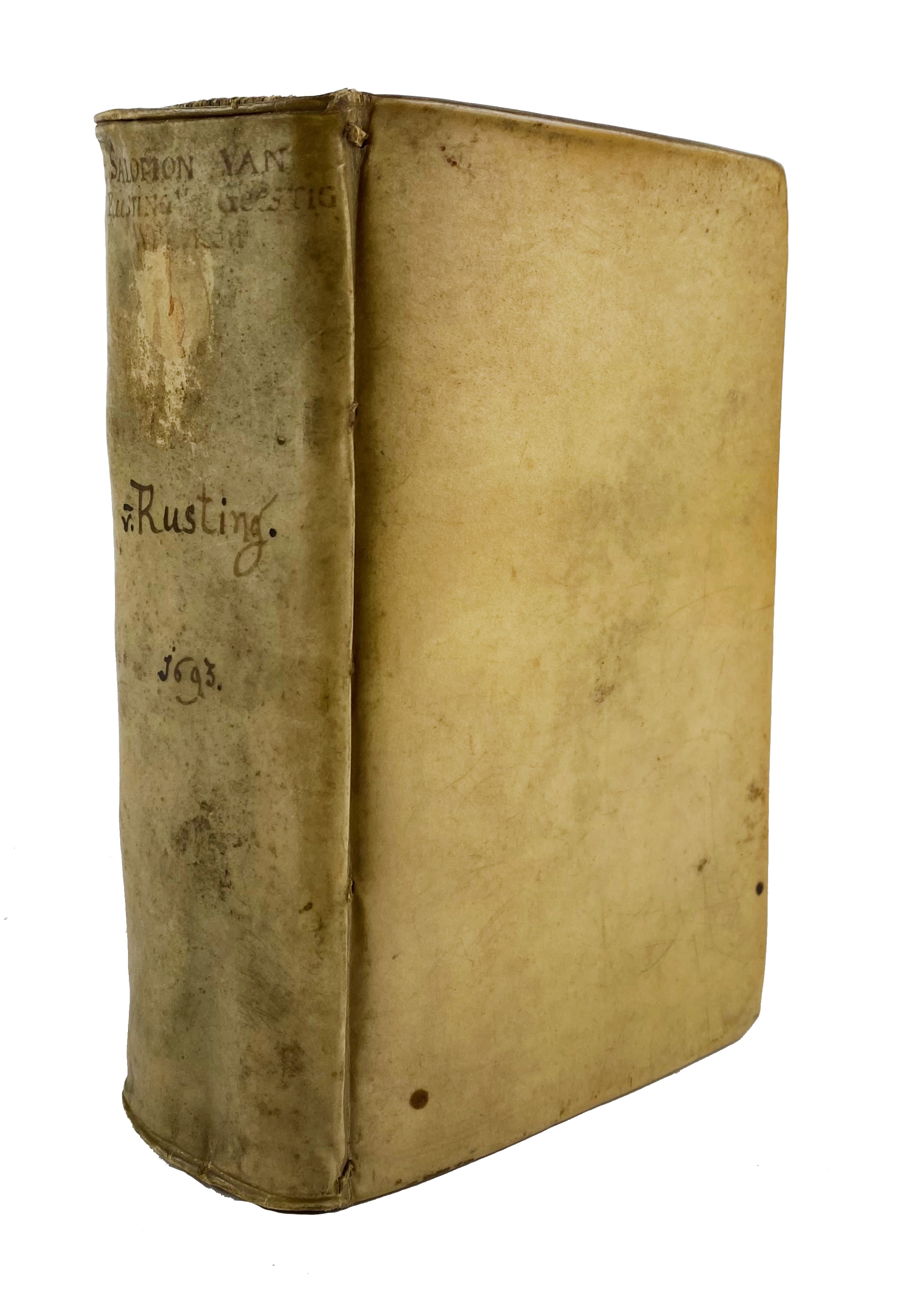 RUSTING, S. v. De vol-geestige werken, Bestaande in Lust en Onlust in den Hemel, Aran en Titus Gemetamorphoseert, Wapenstryt tusschen Ajax en Ulisses, (etc.). Amst., J. ten Hoorn, 1693. (16), 700, (4) pp. W. engr. front. - Bound with: Id. Duvels leven onder de duvelen; ofte duvels dispuyt om 't opper-duvelschap, terwijl den groten opper-duvel (als een boeren hond) aan de keten leyt. Amst., J. ten Hoorn, 1694. 224 pp. W. engr. front. - And: Id. Barbarologia, sijnde de sleutel der grandiloquentia paganismi, ofte boeren-latyn. (&) Toe-gift. Amst., J. ten Hoorn, 1693. 93, (3), 4 pp. W. engr. front. - 3 in 1 vol. Cont. vellum. (Scribbling on free endpaper, a bit browned/foxed in places).