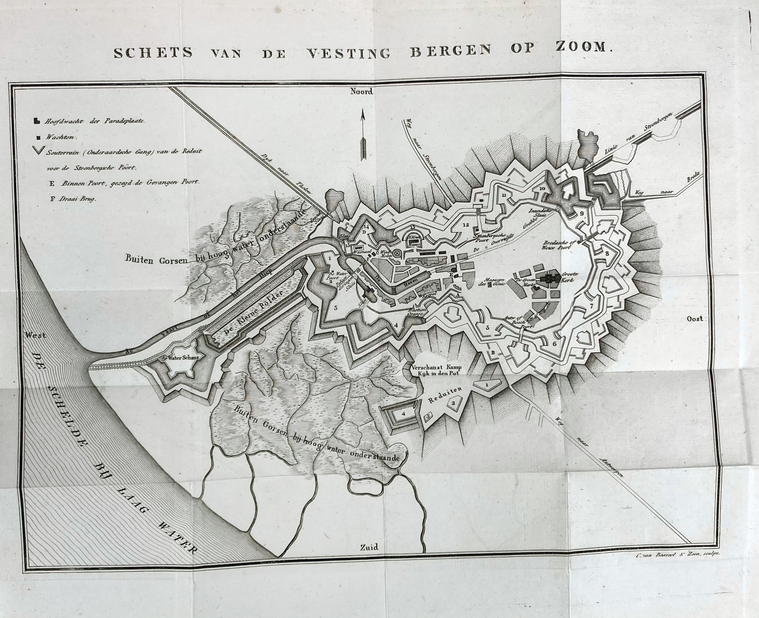 BERGEN OP ZOOM -- (EGGERS, J. v.). Journal du siege de Bergopzoom, en 1747. Amst./Lpz., 1750. (16), 240 pp. W. lge-fold. map, 4 fold. plans & 3 fold. tables. Cont. cf., spine w. raised bands, gilt dec. & red labels, a.e. red. (Spine ends & extremities dam., lge map w. some spots). -- (A.V.J.L.) LEGRAND. Verhaal van de verrassing van Bergen op Zoom, op den 8en en 9en Maart 1814. Uit het Fransch vert. Breda, 1817. (2), 143 pp. W. lge-fold. plan. Cont. hcf., spine w. raised bands & charming gilt dec. (Remains of a ticket on spine, otherwise clean & well-bound). -- J. FAURE. Historie abregée de la ville de Bergen op Zoom, (…) avec une idee du fameux Siège de 1747 (…). The Hague, 1761. xxiv, 336 pp. W. 1 lge-fold. plan. Cont. cf., spine w. raised bands & brown labels, both sides w. gilt tooled coat of arms of the counts of Coblenz. (Upper part of spine loose, joint split, usual signs of age). -- (3).