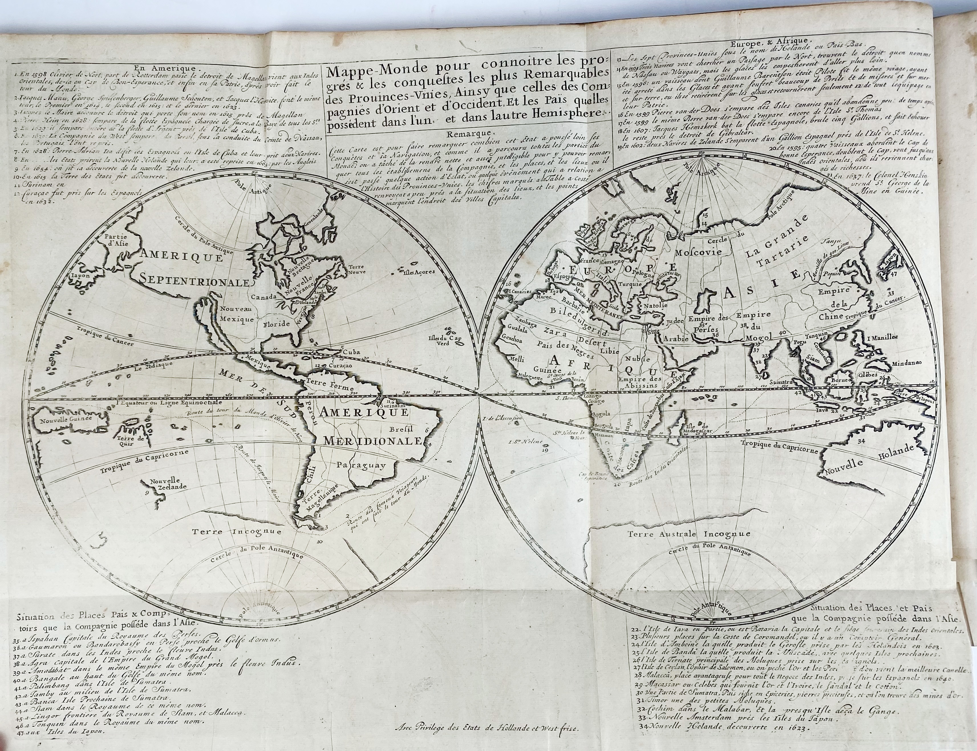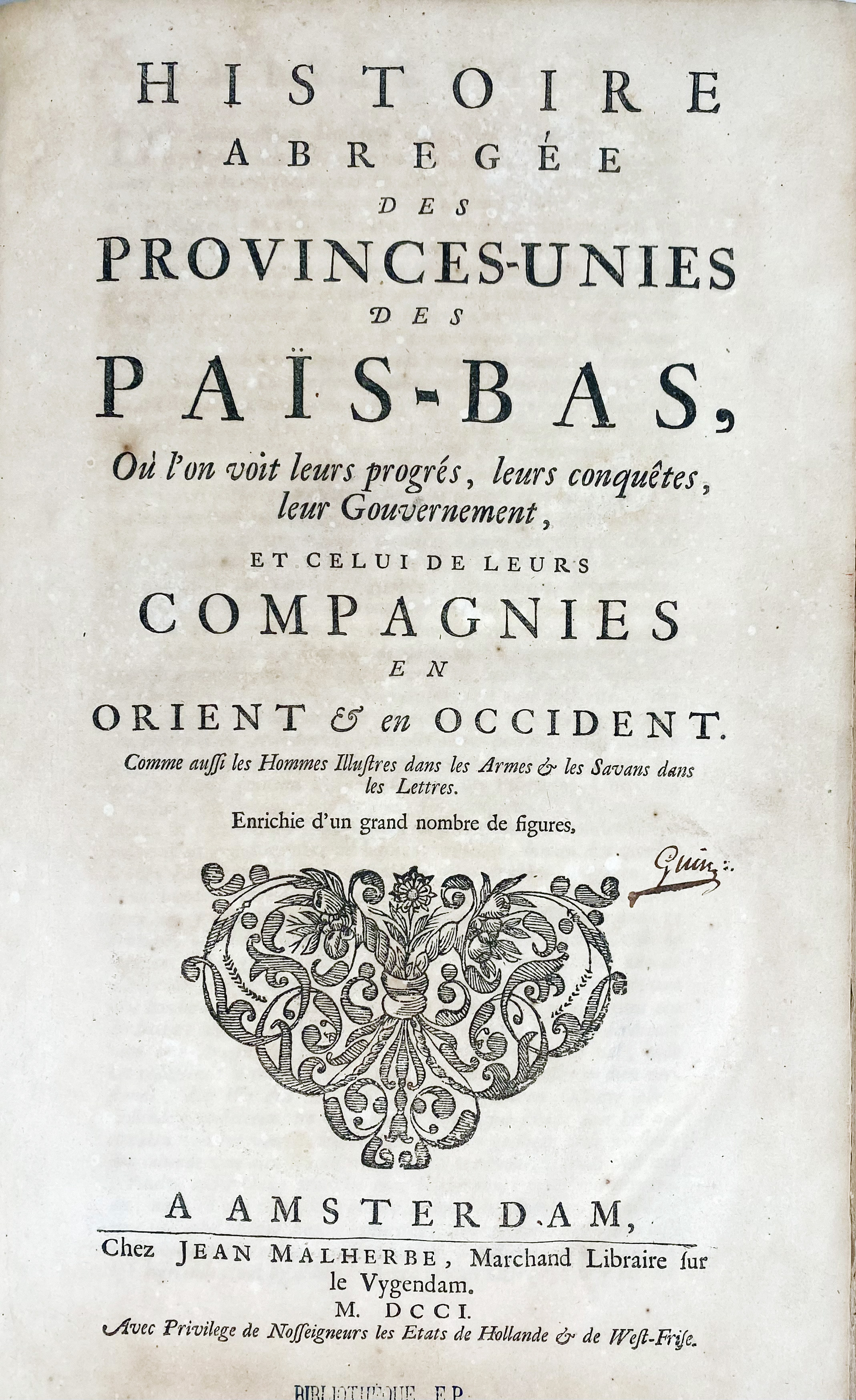 HISTOIRE ABREGÉE des Provinces-Unies des Païs-Bas, où l'on voit leurs progrés, leurs conquêtes, leur gouvernement, et celui de leurs compagnies en Orient & en Occident. Amst., J. Malherbe, 1701. (8), 109, (3) pp. W. fold. engr. map of the Netherlands (rep. on v°), fold. engr. map of the world , 4 fold. engr. plates & 37 full-p. engr. Fol. Fine cont. cf. w. raised bands, richly dec. gilt back & brown label. (Small rep. to top of spine, a bit browned/foxed in places).