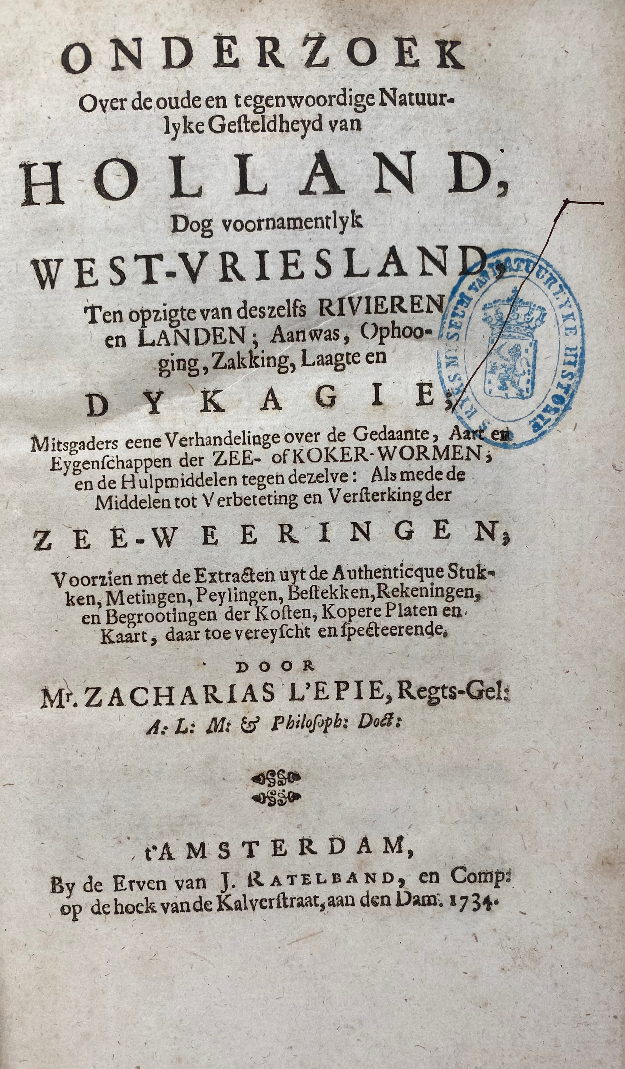 L'EPIE, Z. Onderzoek over de oude en tegenwoordige natuurlyke gesteldheyd van Holland, dog voornamentlyk West-Vriesland, ten opzigte van deszelfs rivieren en landen; Aanwas, Ophooging, Zakking, Laagte en Dykagie; Mitsgaders eene verhandelinge over de gedaante, aart en Eygenschappen der zee- of kokerwormen (...) als mede de middelen tot verbetering en versterking der zee-weeringen (...). Amst., Erve v. J. Ratelband, 1734. (22), (2 blank pp.), 256, (8) pp. W. fold. engr. map & 2 engr. plates (1 fold.). Cont. brds. (Spine rubbed/worn, stamp on ti.).