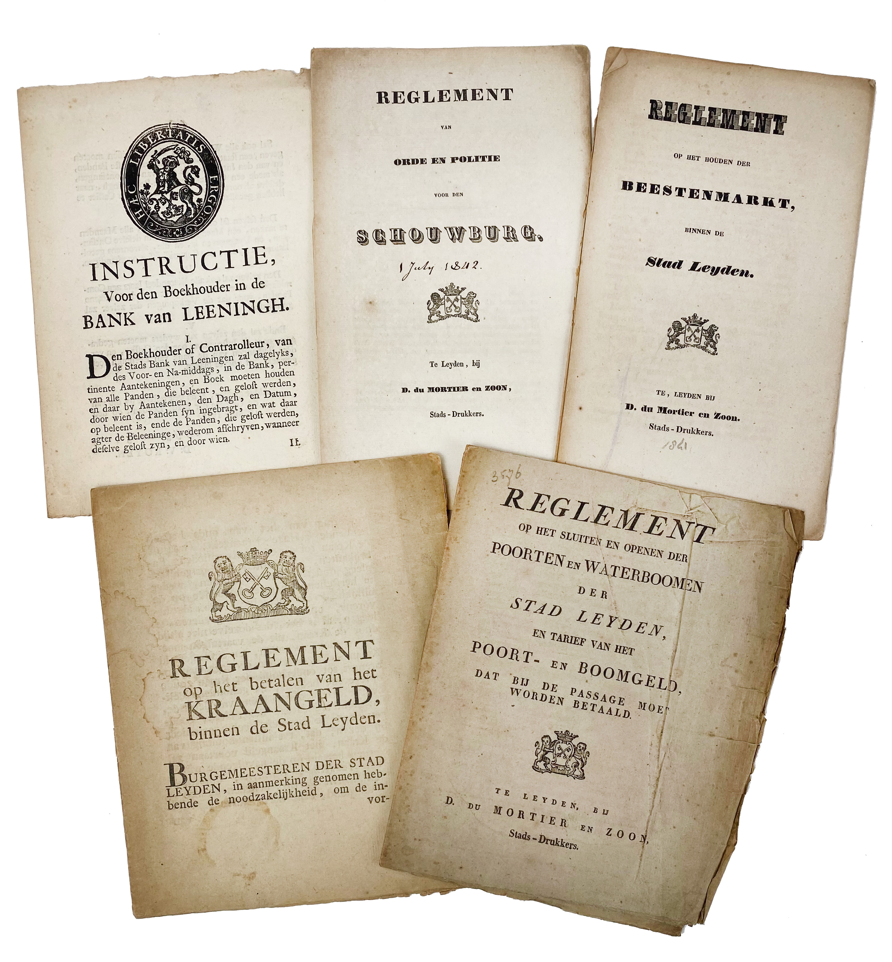 LEIDEN -- KEUREN der Stadt Leyden, geamplieert ende gerenoveert: mitsgaders octroyen, privilegien & handvesten, den selven stede gegeven; Zijnde noch daer bygevoegt de laetste keuren vande Wees-kamer (...) als mede de wetten & statuten v.d. Universiteyt ende de ordonnantie van 't collegium Theologiæ aldaer. Amst., J. Hendricksz., 1657. (8), 285, (27) pp. 4°. Wrps. (A bit stained in places). Overvoorde 2353. -- Added: 5 municipal regulations concerning 'kraangeld' (1817), 'het sluiten en openen der poorten en waterboomen' (1824), 'op het houden der beestenmarkt' (1841), 'orde en politie voor den schouwburg' (1842), 'instructie voor den boekhouder in de bank van leeningh'. -- (6).