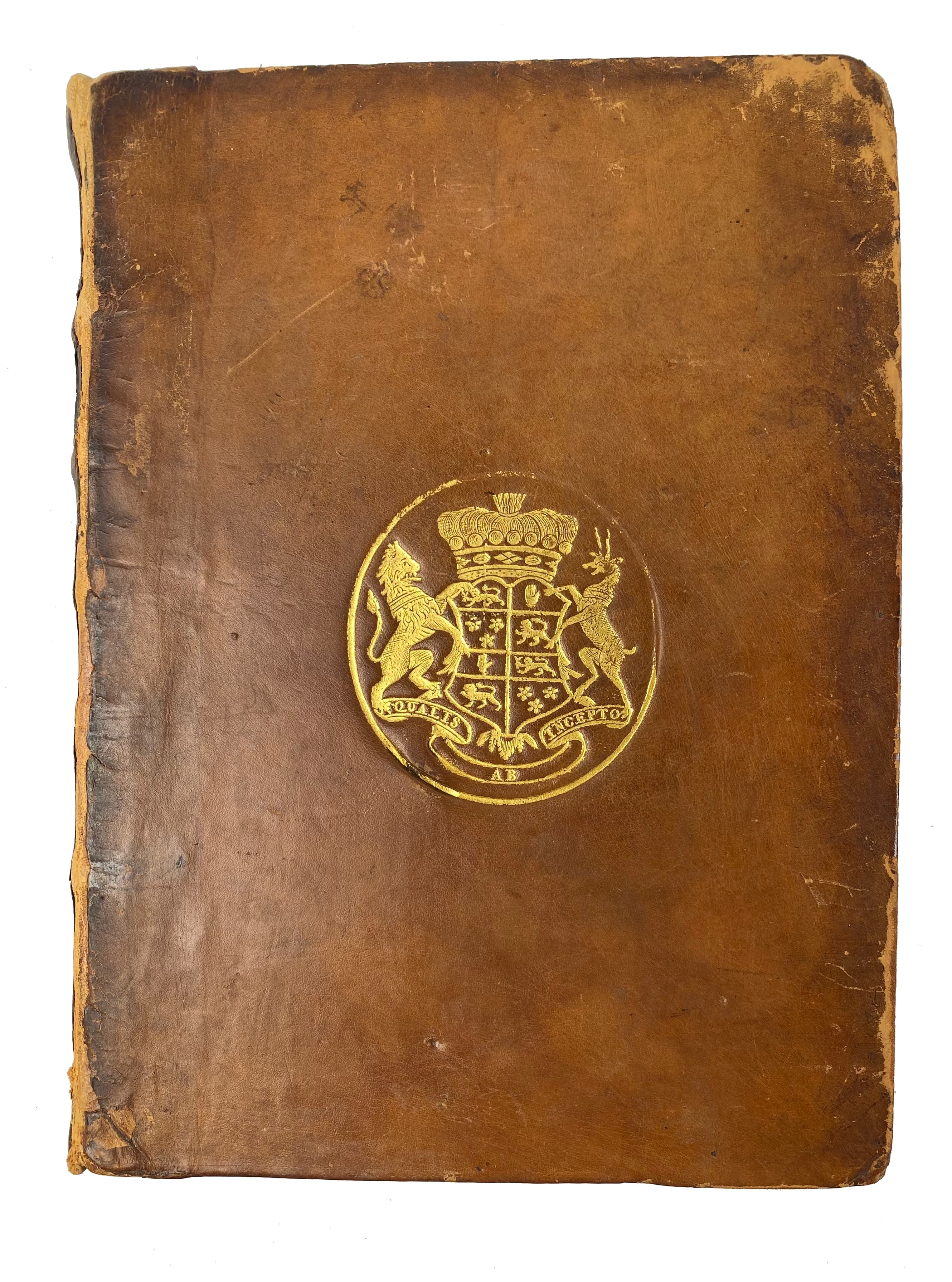 MENDOZA, B. de. Comentarios de lo sucedido en las Guerras de los Payses Baxos, desde el año de 1567 hasta el de 1577. Madrid, P. Madrigal, 1592. (8), 336, (12) lvs. W. engr. map, 4 o. text-engrs. & sev. woodcut initials. 4°. Old cf. w. raised bands with coat of arms (Hamilton?) on both sides. (Rebacked w. use of old spine, corners bumped, old annot. on ti., inner margin ti-p. rep. w. mending tape, lower margin a bit stained at the beginning, a few lvs. at the end stained).