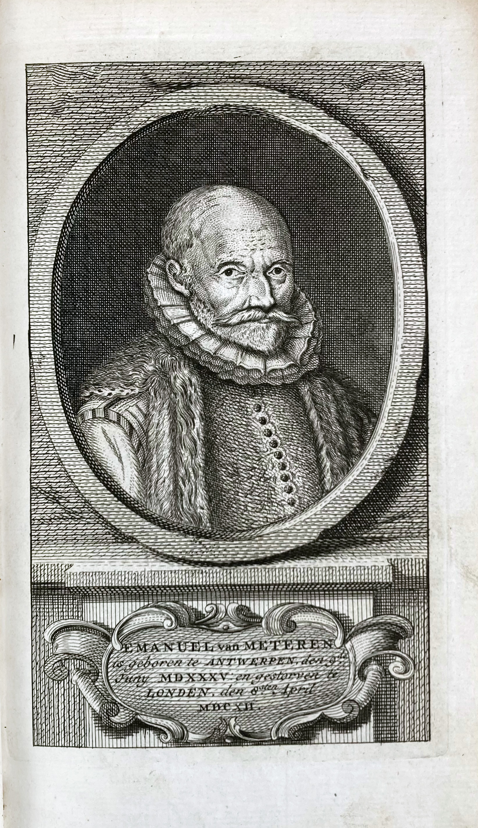METEREN, E. v. Historie van de oorlogen en geschiedenissen der Nederlanderen, en der zelver naburen: beginnende met den jare 1315, en eindigende met den jare 1611. 3e dr. Amst., S.J. Baalde, 1786. 10 vols. W. engr. title-p. & 84 engr. portr. (including front.-portr. of the author). Cont. hcf. w. gilt dec. & lettering on spine. (Most vols. w. wear to extremities, ex libris stamp on title-pp. "volks leesinrichting", vol. 7 w. moderate waterstains).