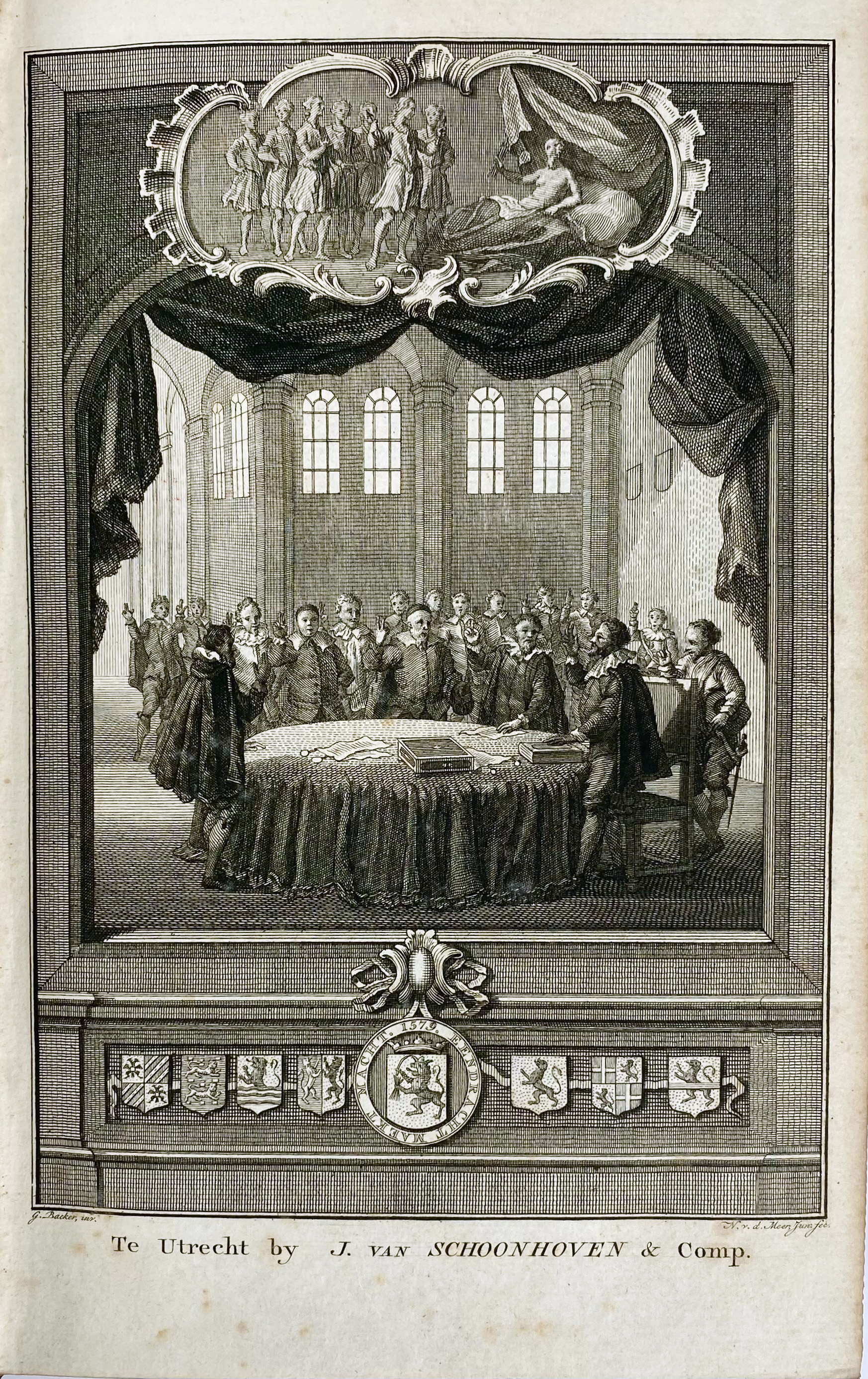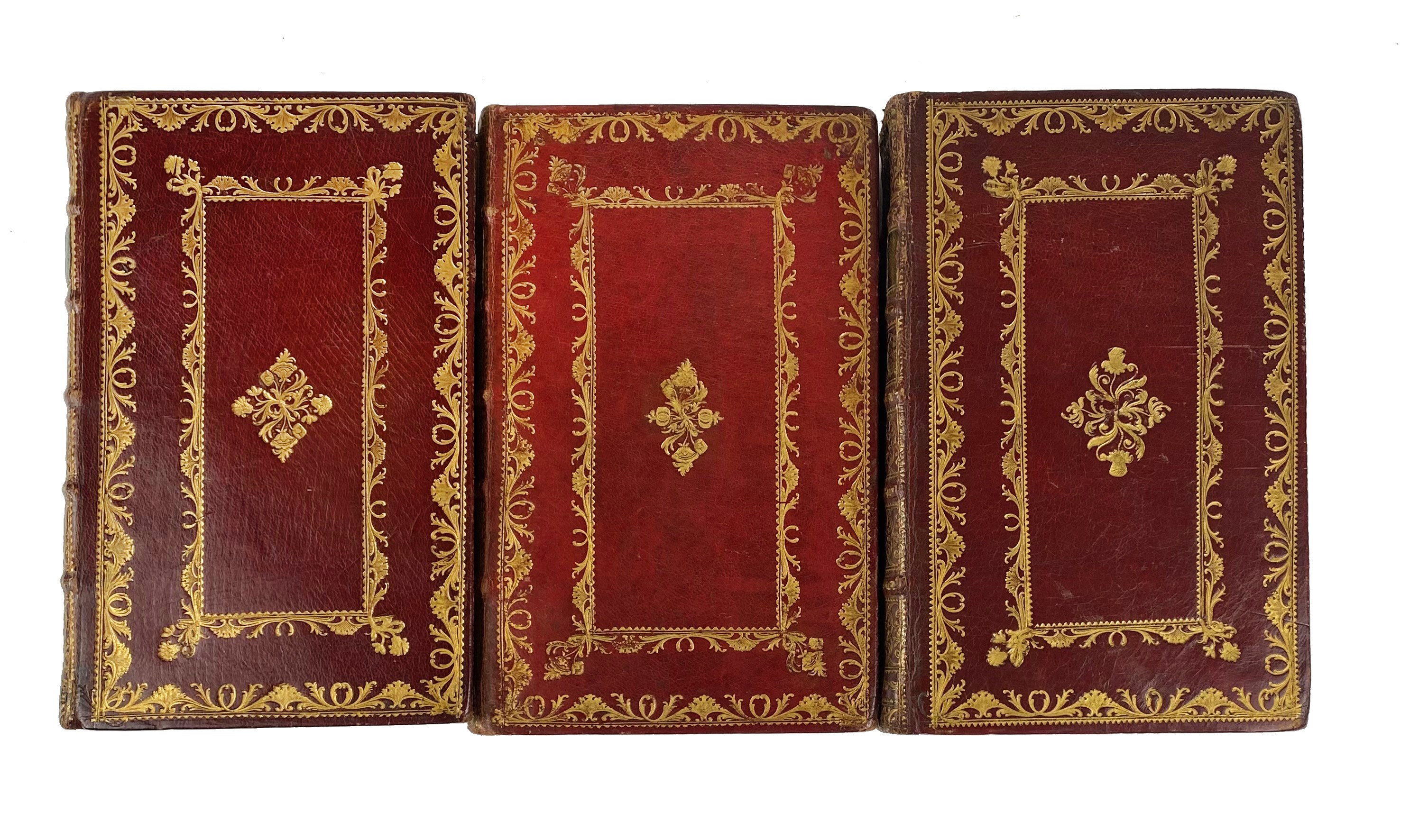 PAULUS, P. Verklaring der Unie van Utrecht. Vooraf gaat de vertaling van 't Lat. werk van Mr. N. Bondt, (…). Utr., J. v. Schoonhoven & Comp., 1775-(77). 3 (of 4) vols. W. fine engr. front. by N. v.d. Meer. Beautiful cont. full red cf. w. raised bands, richly dec. gilt backs, gilt floral central ornaments on all sides, surrounded by double gilt dec. borders, gauffered gilt edges. (Binding vol. 2 sl. different).