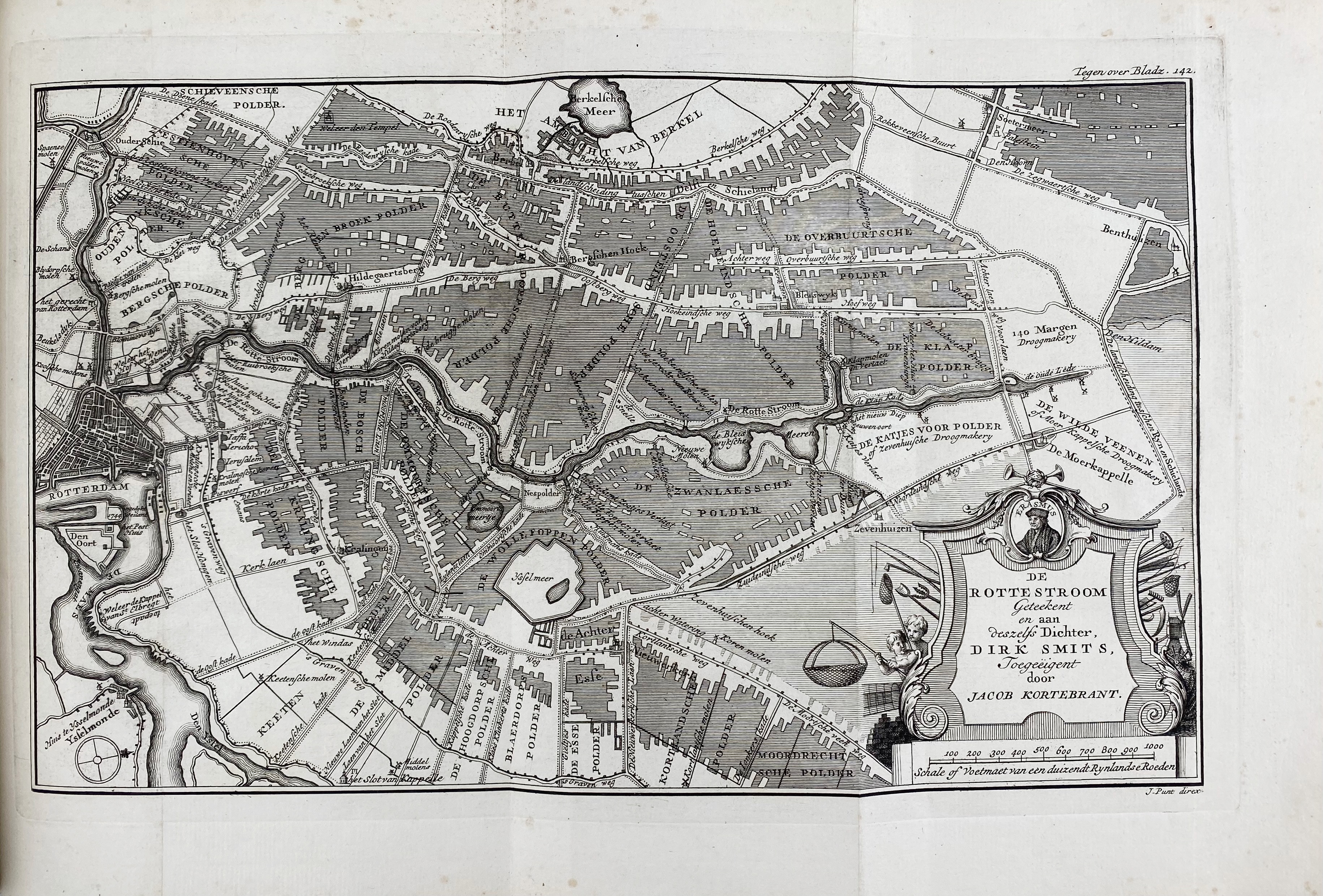 ROTTERDAM -- SMITS, D. De Rottestroom. Rott., Ph. Losel, (a.o.), 1750. (52), 179, (3) pp. W. fine engr. front., ti.-vign. & engr. dedicat. headpiece, 1 engr. portr. of Willem Carel Hendrik Friso, 3 allegorical full-p. engr. & 1 fold. map of "De Rottestroom", all by J. Punt. 4°. Cont. blind tooled vellum. (Front cover a bit stained, sl. age-toned, but else a fine copy w. ample margins).