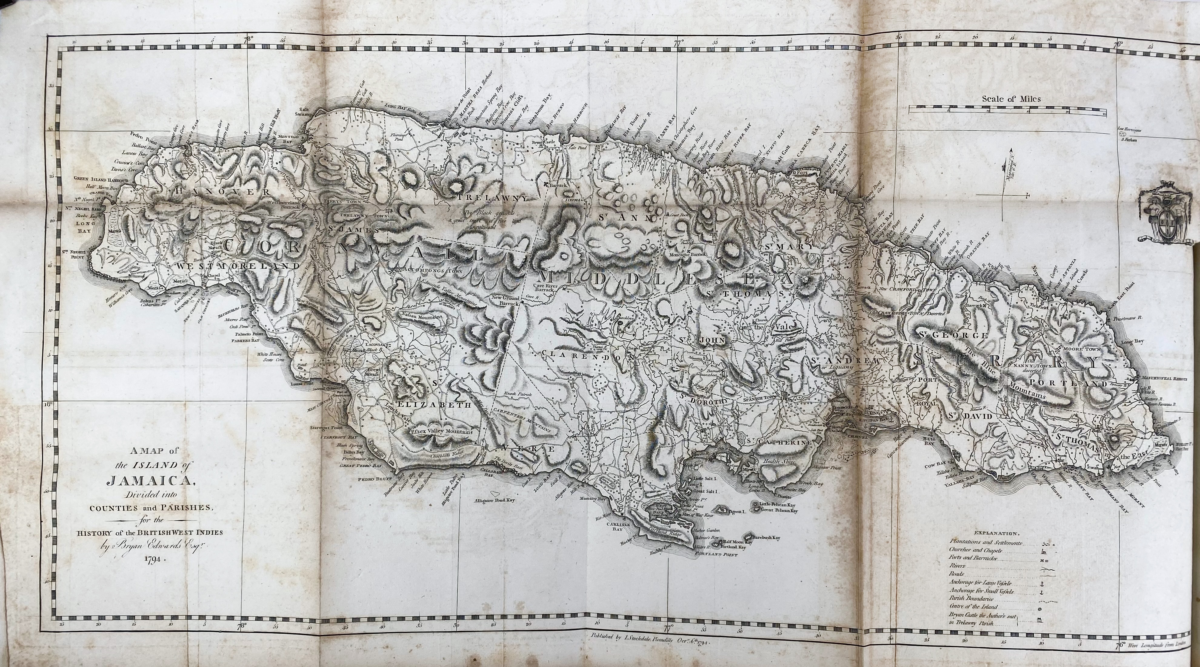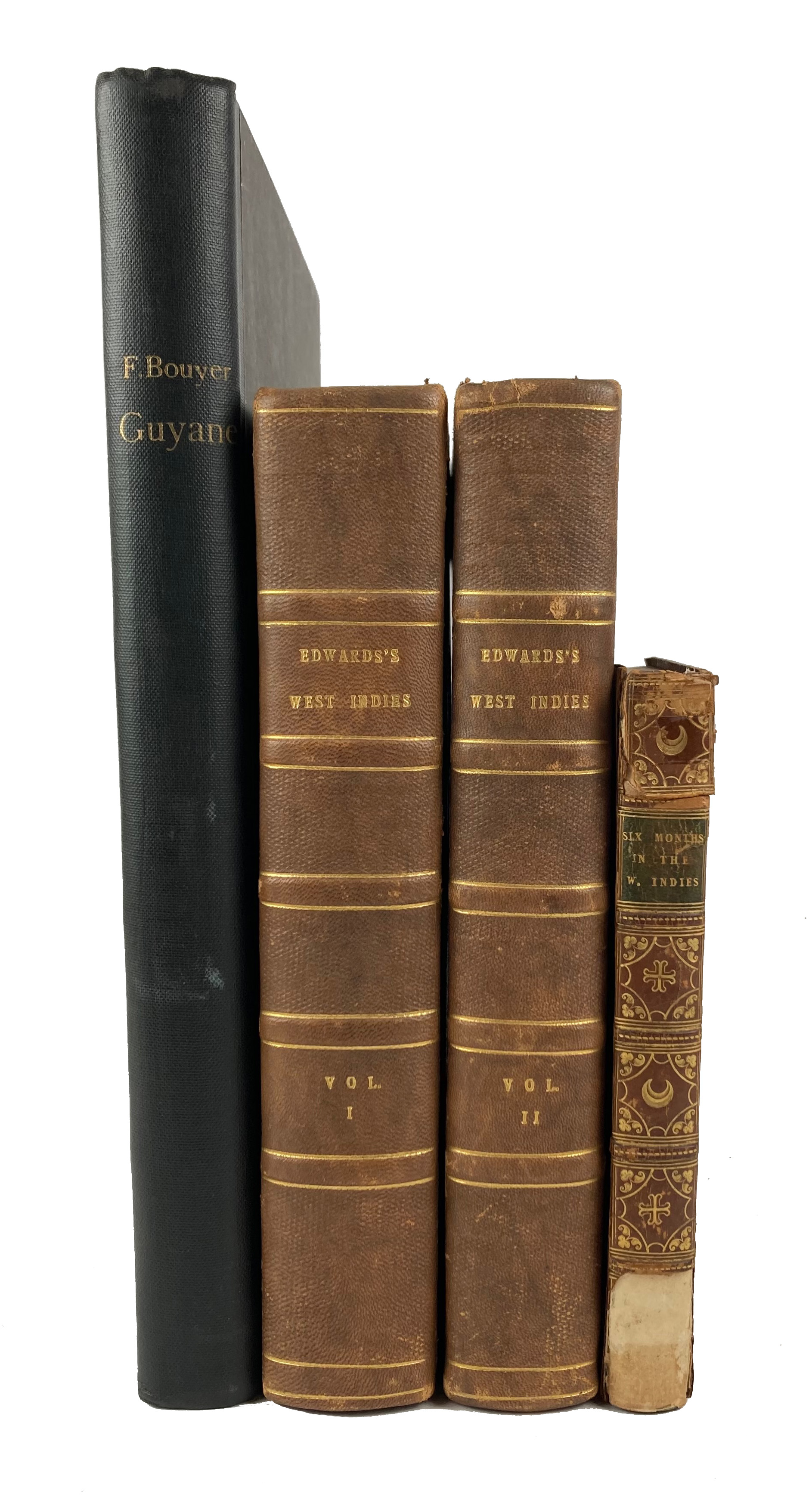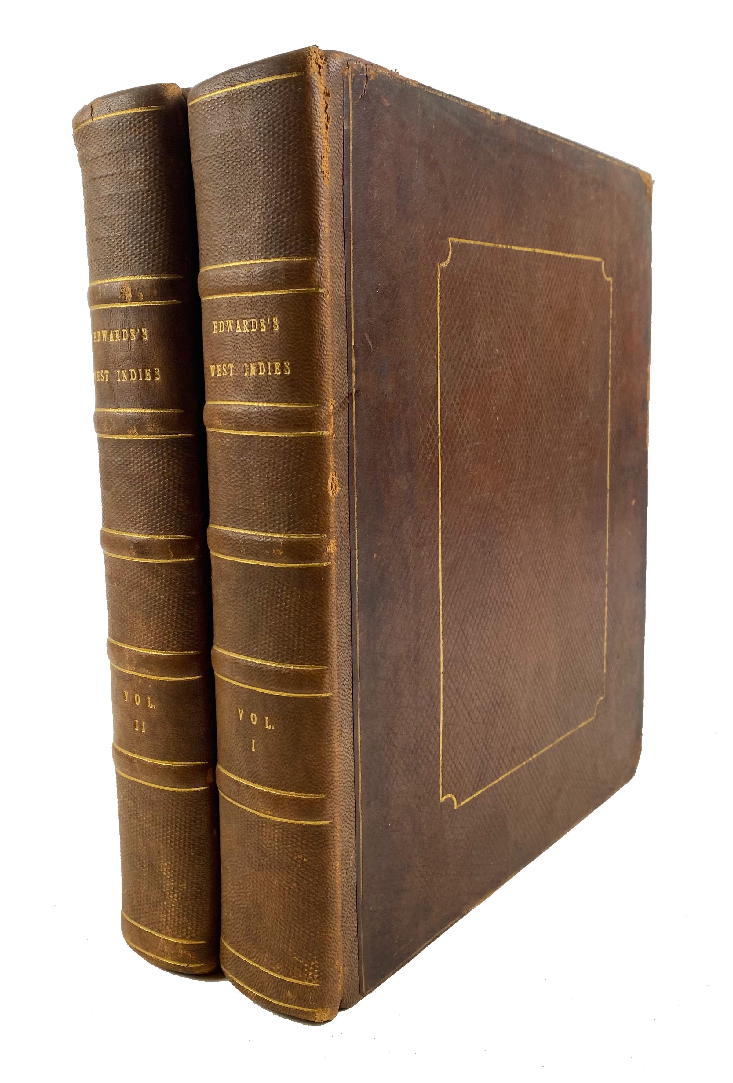 WEST INDIES -- EDWARDS, B. The history, civil and commercial, of British Colonies in the West Indies. 2nd ed. Lond., printed for J. Stockdale, 1794. 2 vols. liv, 494; (2), 520, (1) pp. W. 2 engr. fronts., large fold. general map in 2 sections, 8 engr. maps (1 folding of Jamaica), & 5 engr. plates. 4°. Cont. English cf. binds., blue sprinkled edges. (Rebacked in brown mor., corners bumped/worn, fold. maps torn & partly repaired on central fold, plates and maps a bit foxed and dustsoiled, some stains & yellowing). -- And 2 o. (4).