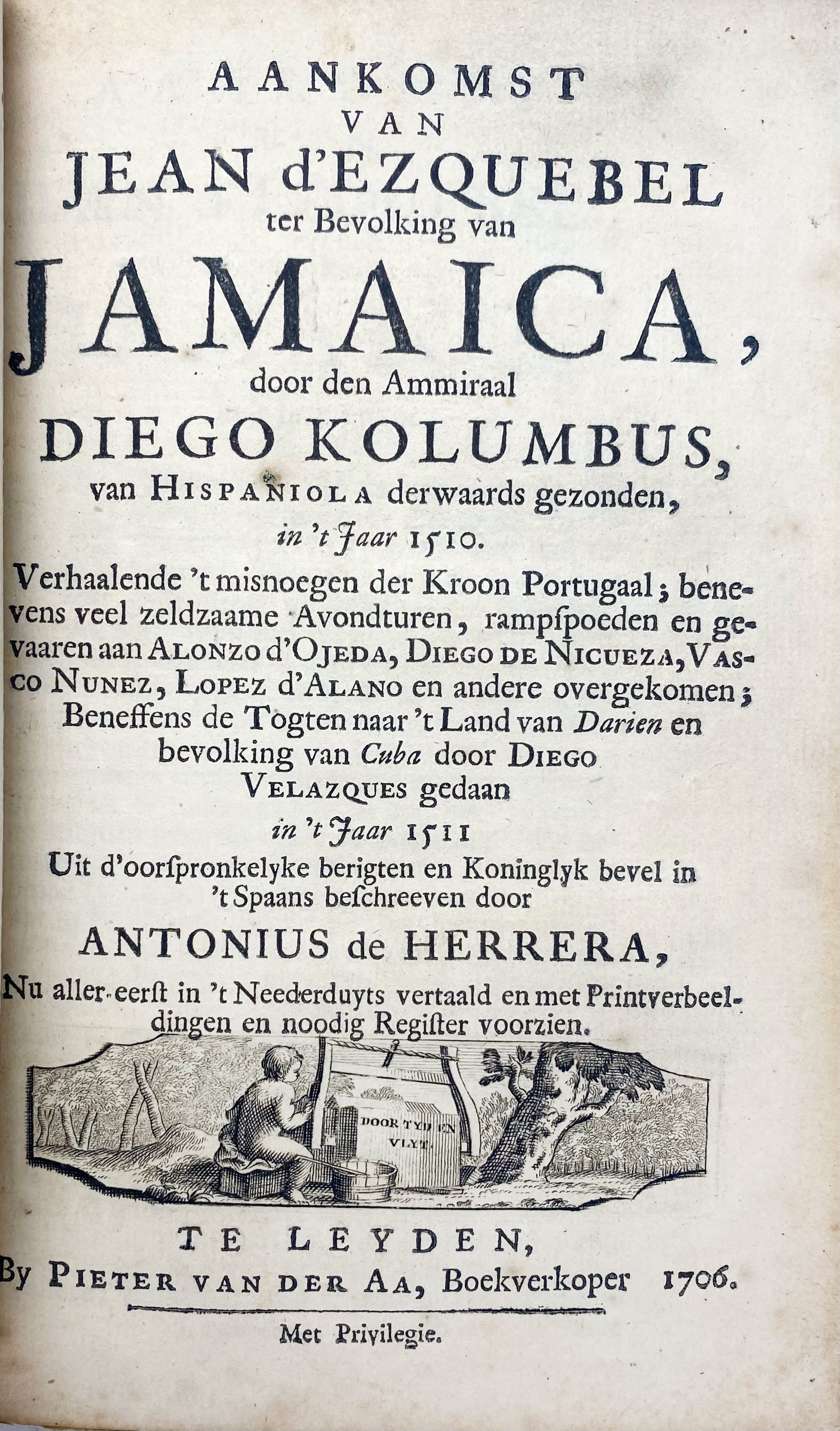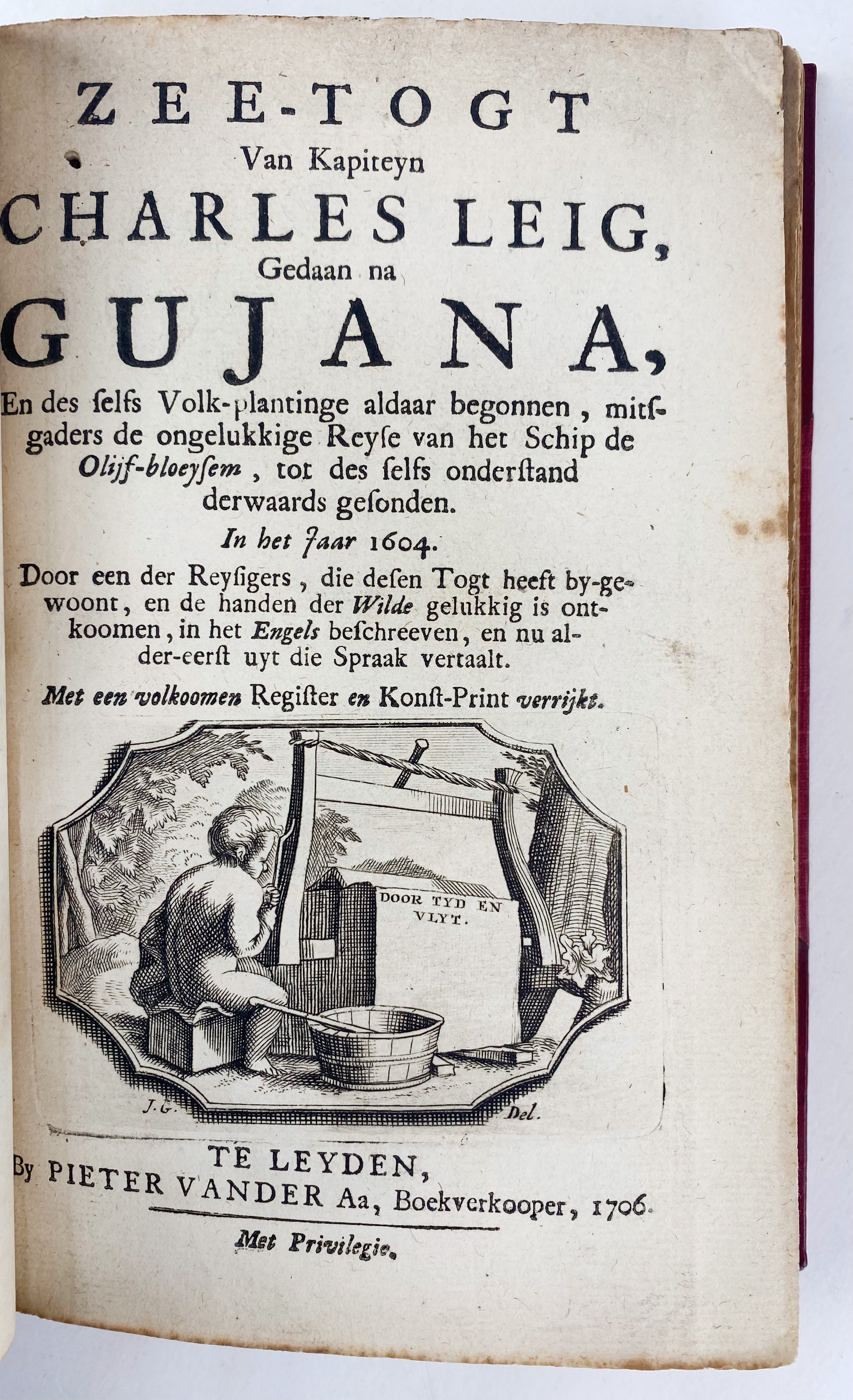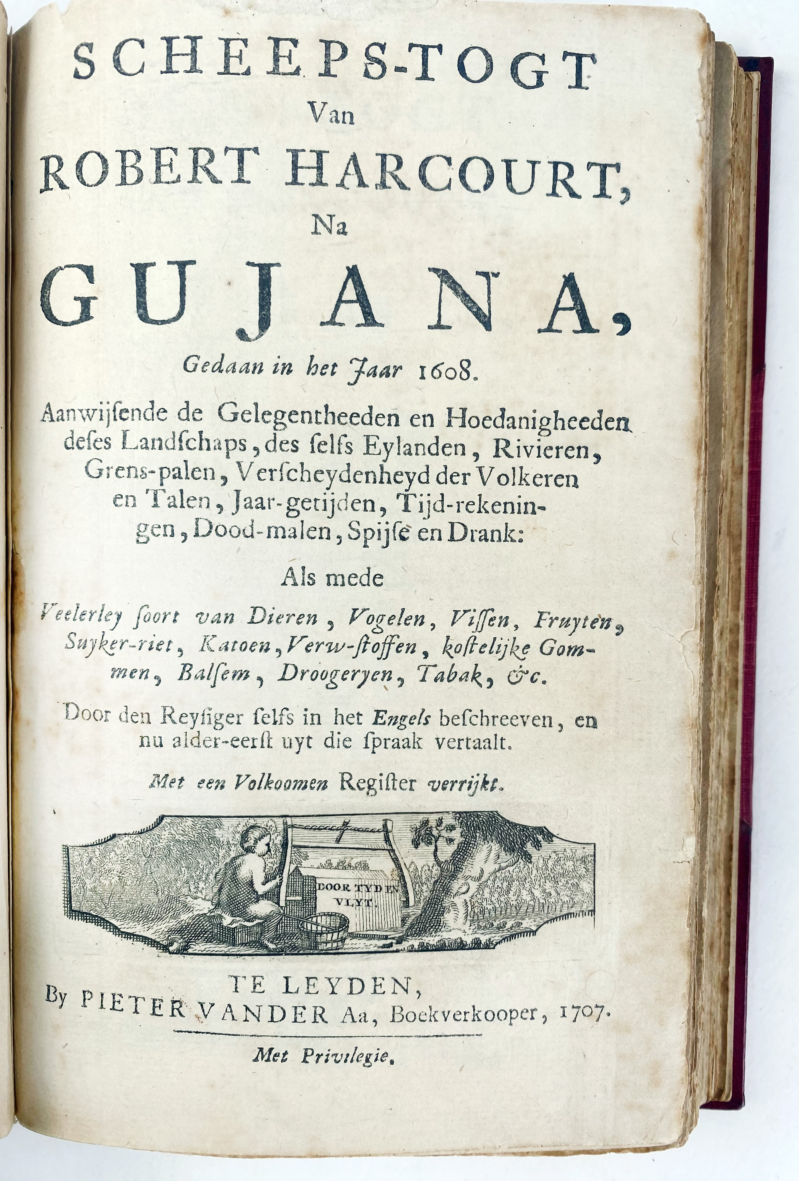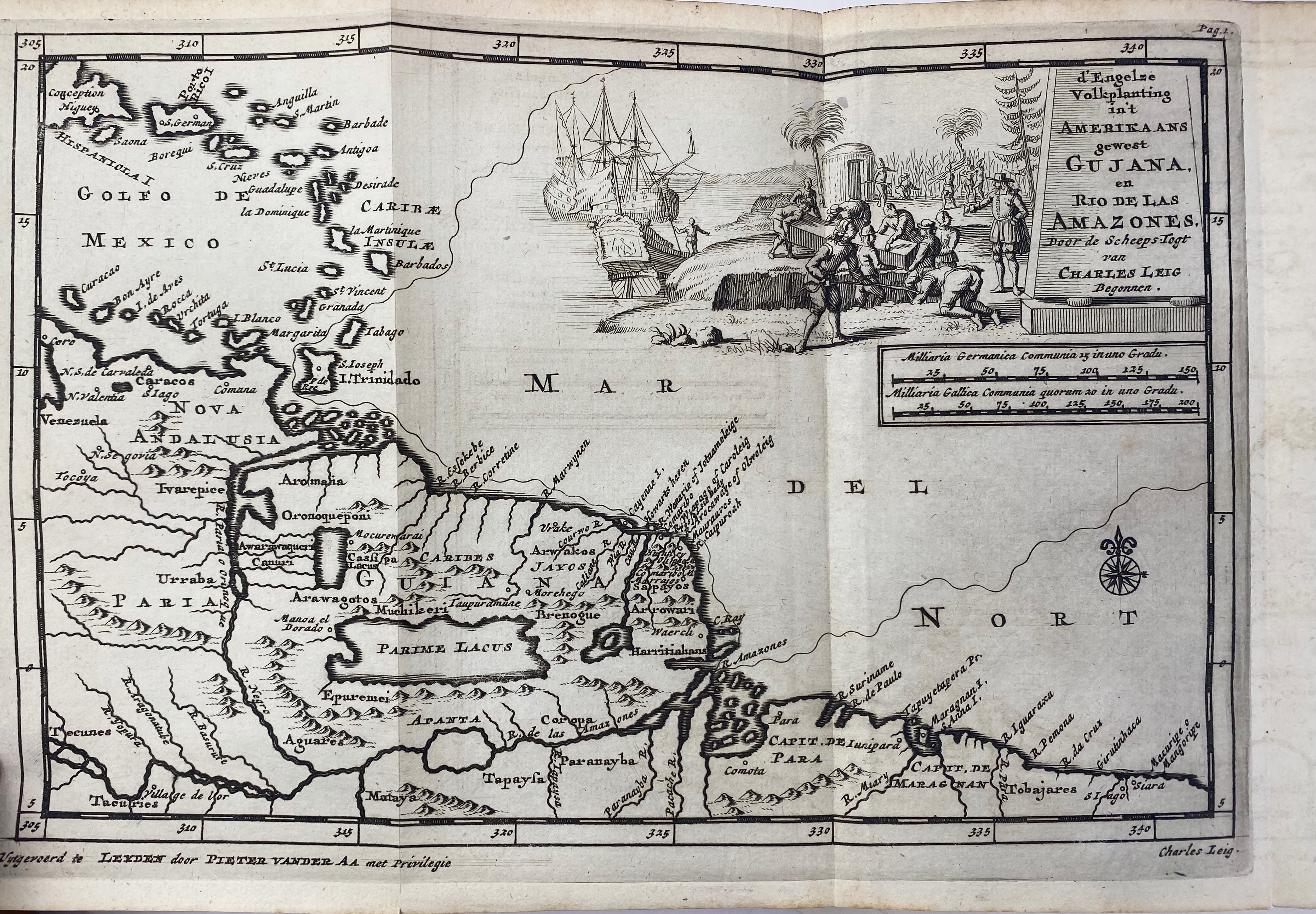 WEST INDIES -- HERRERA, A. de. Aankomst van Jean d'Ezquebel ter bevolking van Jamaica, door den Ammiraal Diego Kolumbus, van Hispaniola derwaards gezonden, in 't jaar 1510. (…) nu aller-eerst in 't Neederduyts vertaald en met printverbeeldingen en noodig register voorzien. - Bound after: R. HARCOURT. Scheeps-togt van Robert Harcourt na Gujana, gedaan in het jaar 1608. Aanwijsende de gelegentheeden en hoedanigheeden deses landschaps, (…). - And: C. LEIGH. Zee-togt van Kapiteyn Charles Leig, gedaan na Gujana, en des selfs volk-plantinge aldaar begonnen, mitsgaders de ongelukkige reyse van het schip de Olijf-bloesem, tot des selfs onderstand derwaards gesonden. In het jaar 1604. - Leyden, v.d. Aa, 1705-06. 3 works in 1 vol. 144; 44; 40 pp. W. 6 fold. engr. plates & 2 fold. engr. maps of Guyana. Sm-8°. Bound in later, very fine red h. mor. extra w. raised bands & gilt lettering and lining. Bound by Morley, Oxford. (Two tiny holes in the Leig(h) map, some light spotting, but generally a clean and good copy).