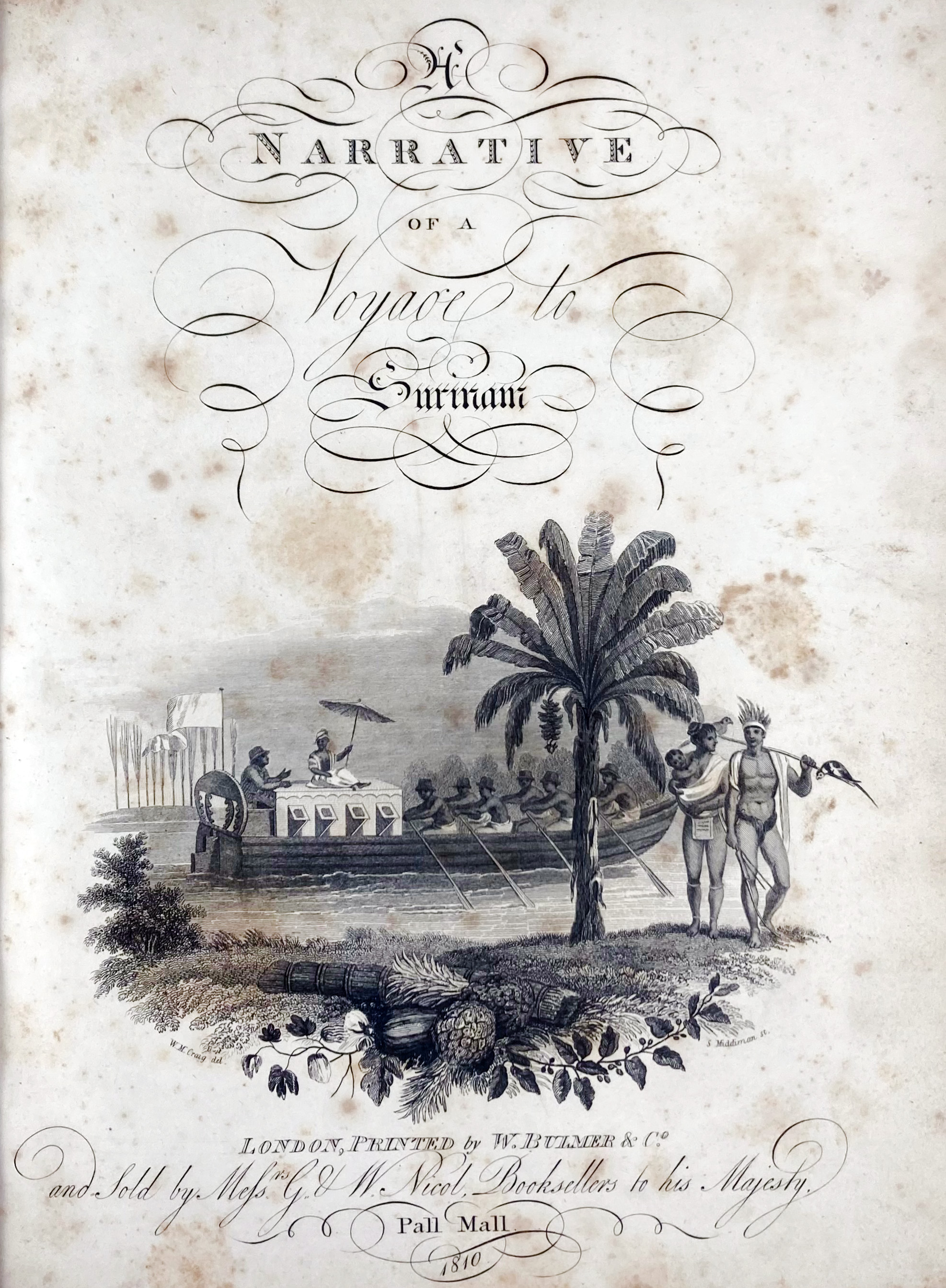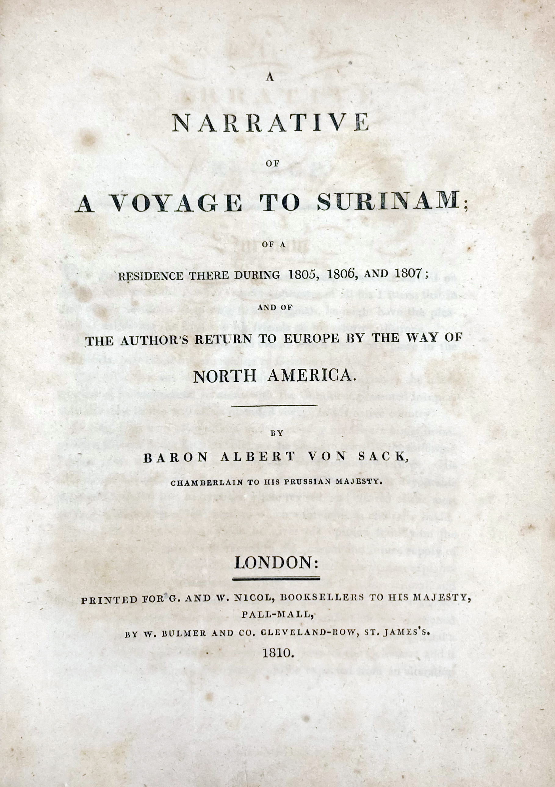 WEST INDIES -- SURINAM -- SACK, A. v. A Narrative of a Voyage to Surinam; of a Residence there during 1805, 1806, and 1807; and of the Author's Return to Europe by the way of North America. Lond., W. Bulmer, 1810. x, (2), 282 pp. W. steel-engr. front., steel-engr. ti., map of Surinam and 1 full-p. steel-engr. plate dep. "a proposed easy method for the Negroes to sow cotton". 4°. Later cl. (Spine gone, upper side attached precariously, yellowing/off-setting throughout).