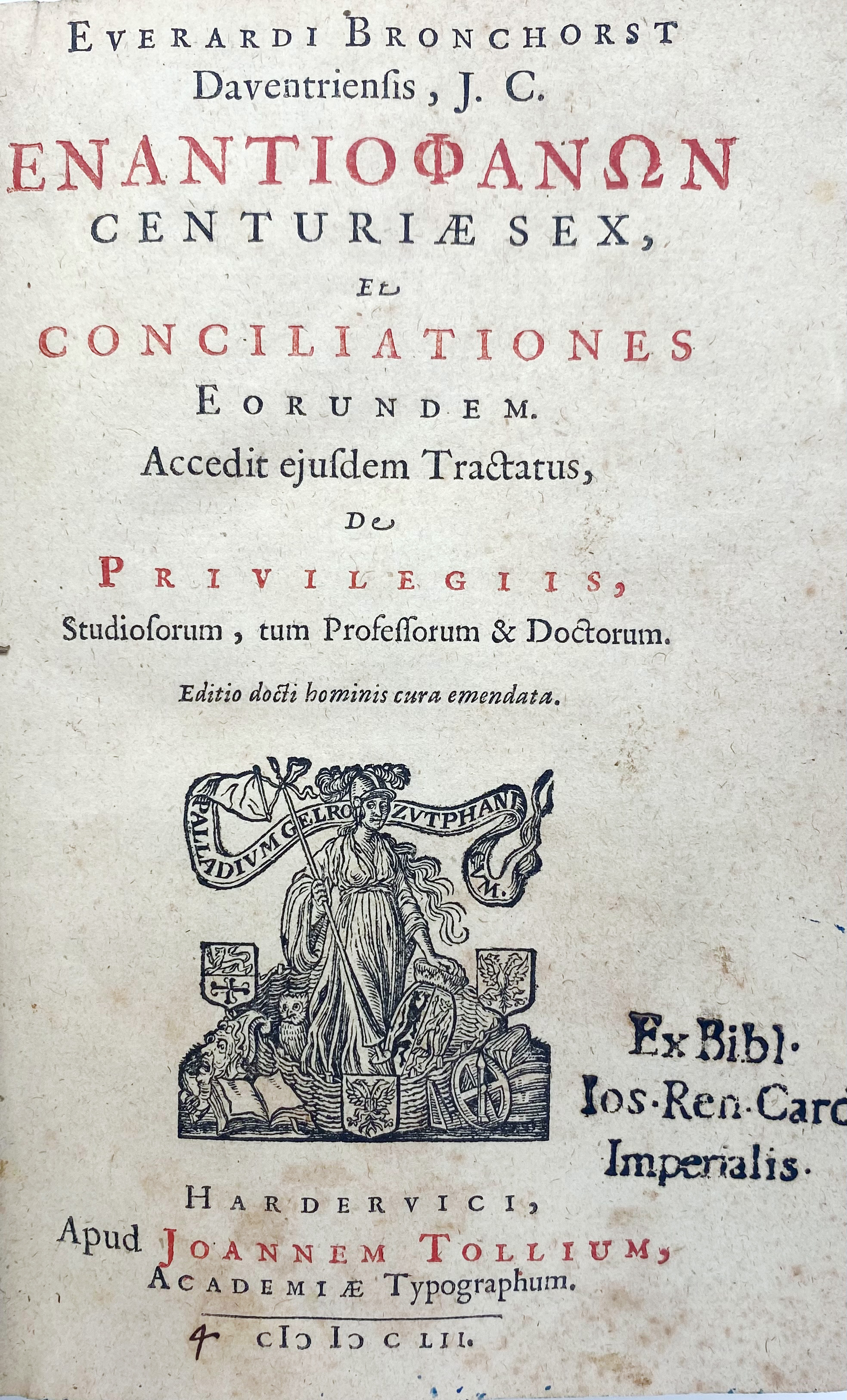 BRONCHORST, E. Enantiophanoon centuriæ VI & conciliationes eorundem. Acc. ejusdem tractatus, De privilegiis studiosorum, tum professorum & doctorum. Harderwijk, J. Tollius, 1652. (44), 845 (recte 835) pp. Later h. vellum. (Upper margin cut, stamp on ti., a bit browned).