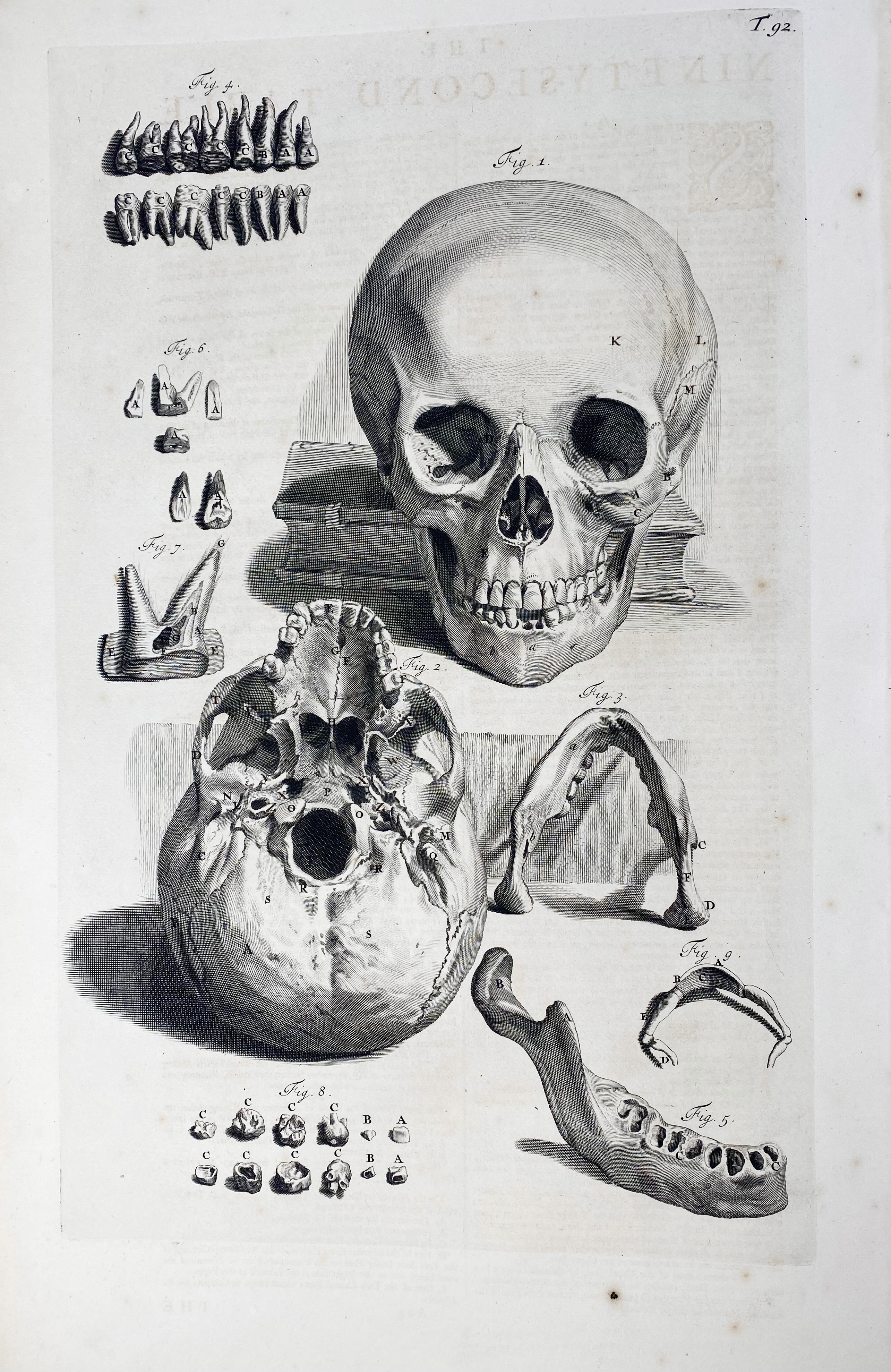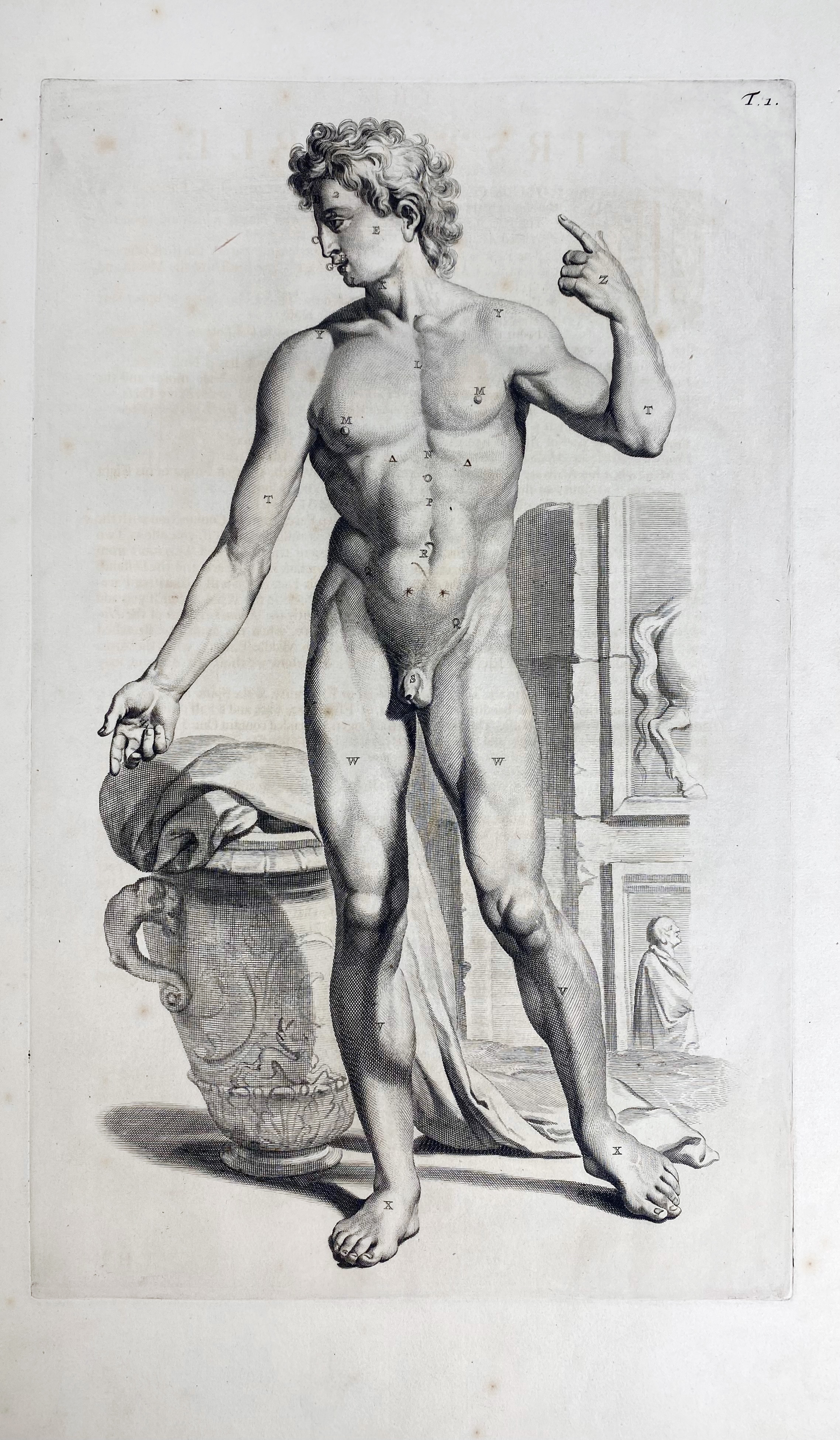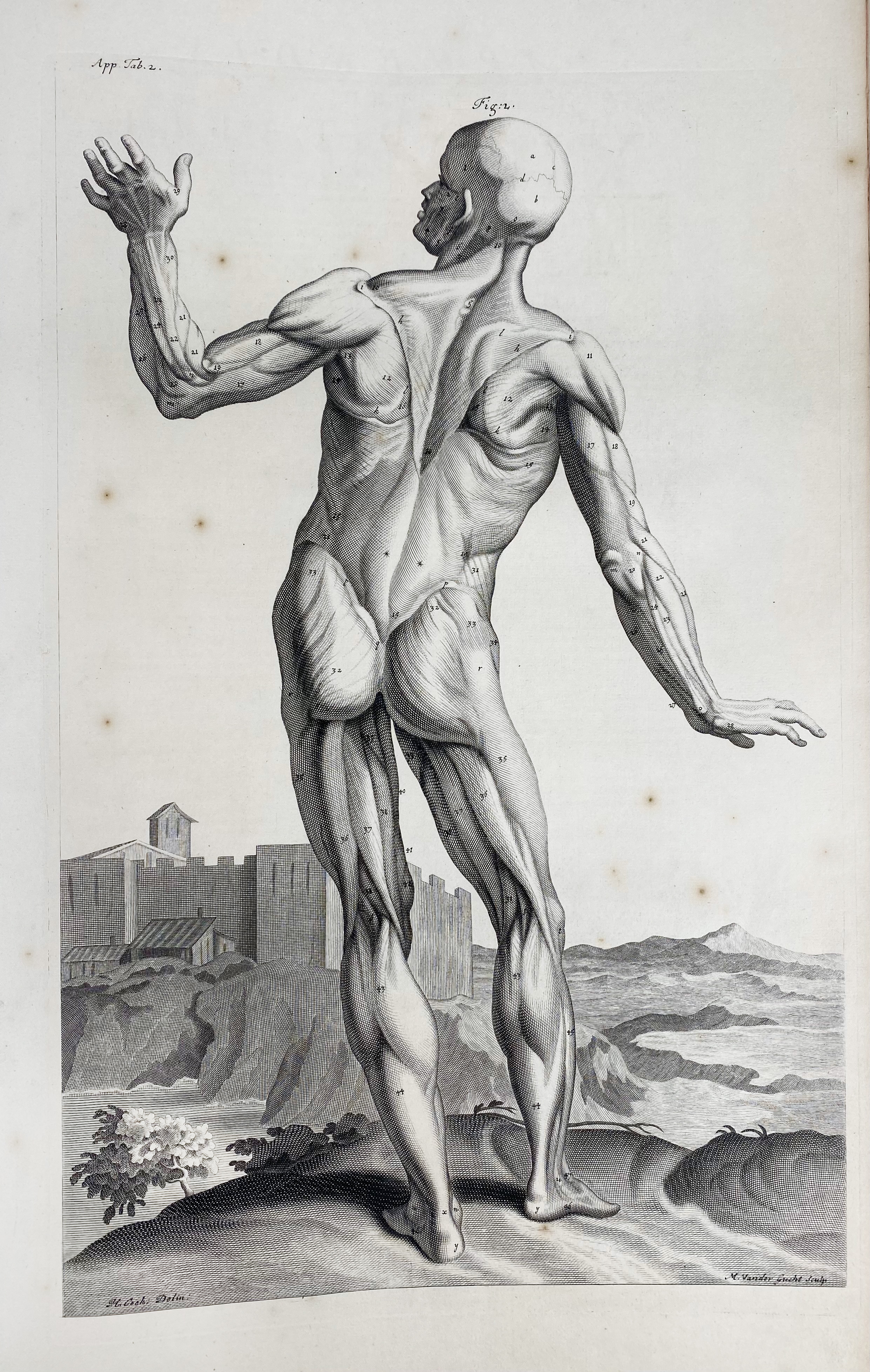 G-M 385.1: "The most elaborate and beautiful of all 17th century English treatises on anatomy and also one of the most extraordinary plagiarisms in the entire history of medicine. Cowper purchased sets of the van Gunst copperplates used to illustrate Bidloo's book and issued them under his own name with an English text and a new illustrated appendix. For the frontispiece Cowper had a small printed flap with his own name pasted over Bidloo's own engraved title and name." The nine new plates that Cowper commissioned, drawn by Cooke and engraved by van der Gucht, include front and back views of the entire musculature. - Heirs of Hippocrates 723.9; Welcome II, 401.€ 3000