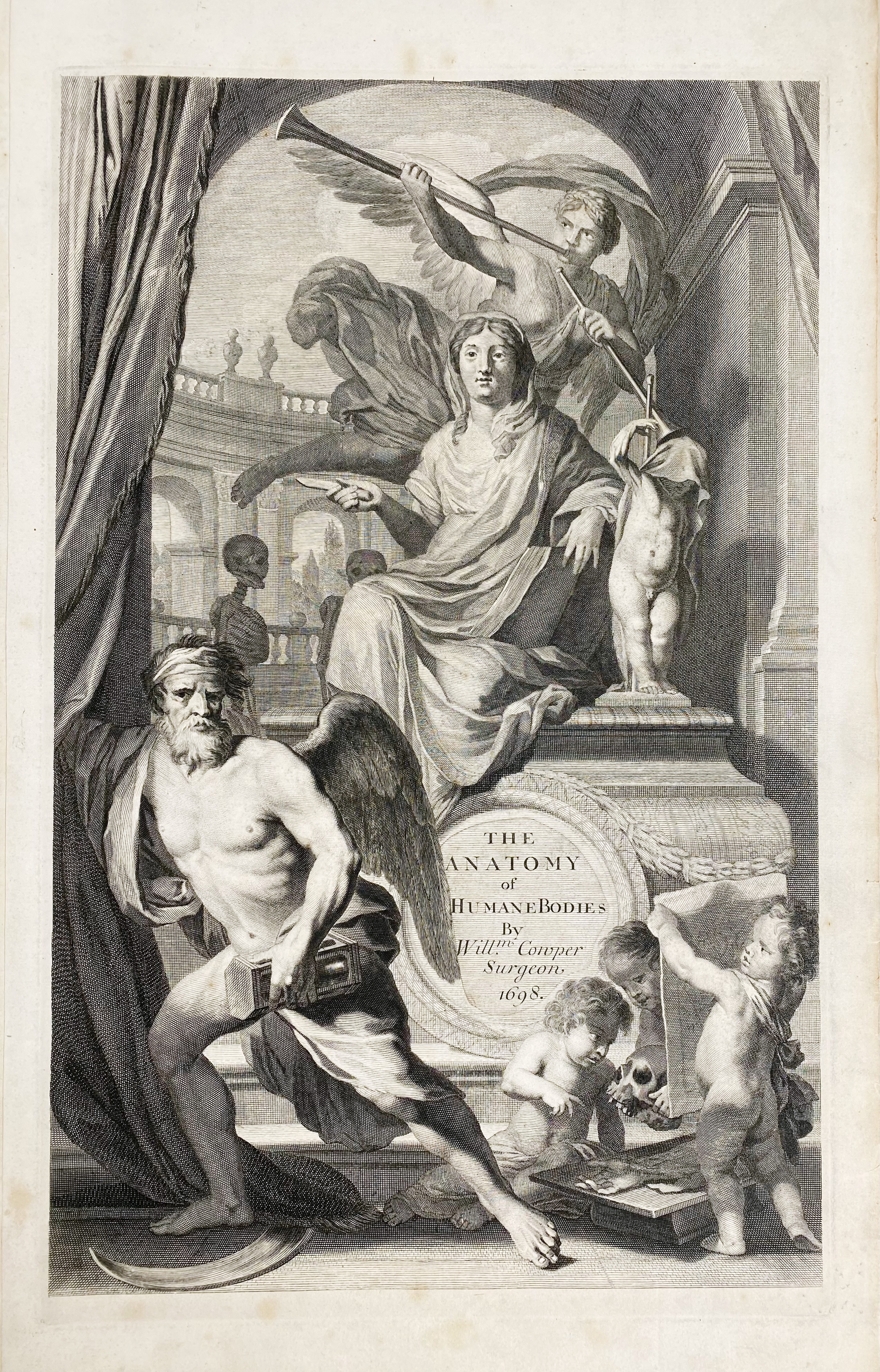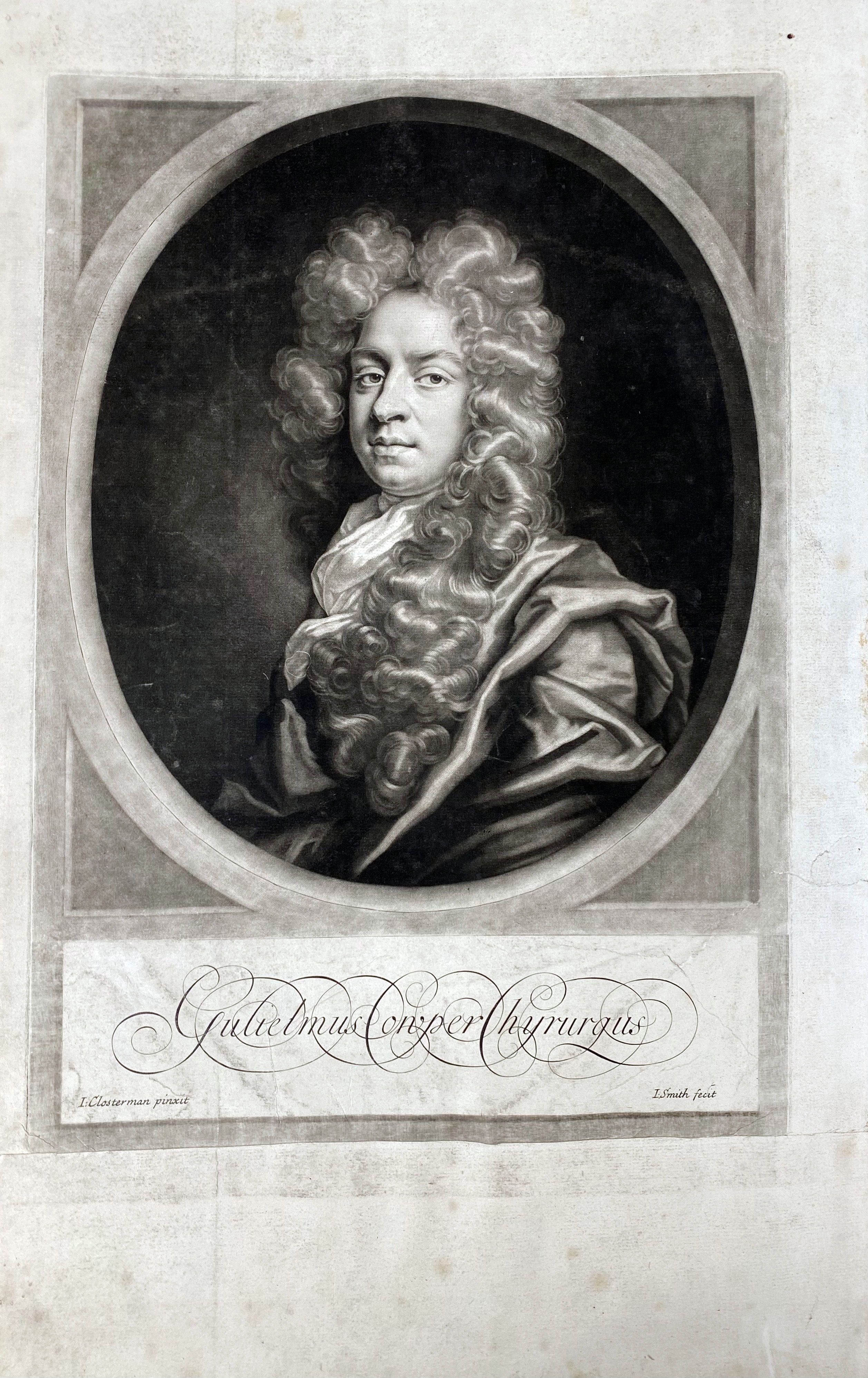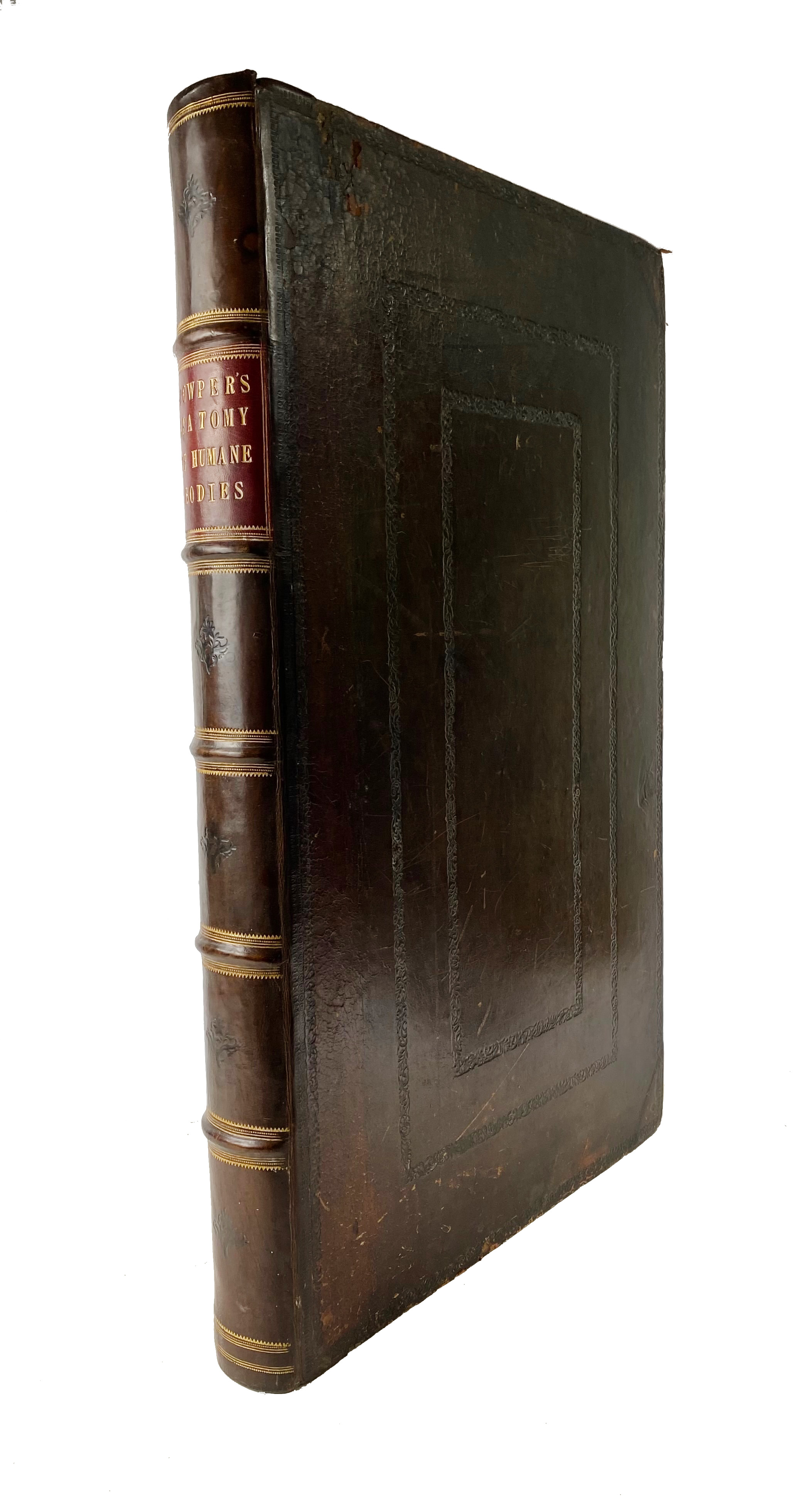 ANATOMY -- COWPER, G. The Anatomy of Humane Bodies (…) to which is added, an Introduction, explaining the Animal Oeconomy, with a copious index. Oxford, printed at the Theater, for S. Smith and B. Walford, 1698. W. mezzotint front.-portr. of the author, allegorical engr. title with pasted-on English title in cartouche as usual, 2nd engr. title w. lge vign., 114 engr. anatomical plates (2 folding, of which one printed on two joined sheets), for the greater part after drawings by G. de Lairesse. Lge-fol. Cont. blind tooled cf. (Skilfully rebacked in antique style mod. cf. w. red label, all lvs. and plates mounted on stubs, mezzotint portr. laid down, lower sheet of plate 10 a bit dam. and laid down, closed tear in dedication lvs., fore-edge of some plates cut short, sl. foxed/browned).
