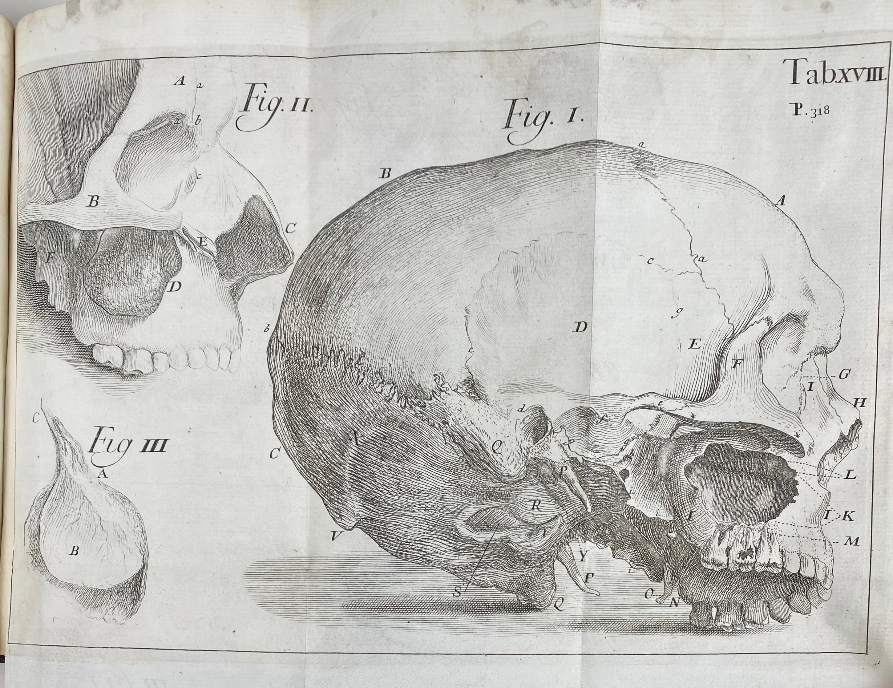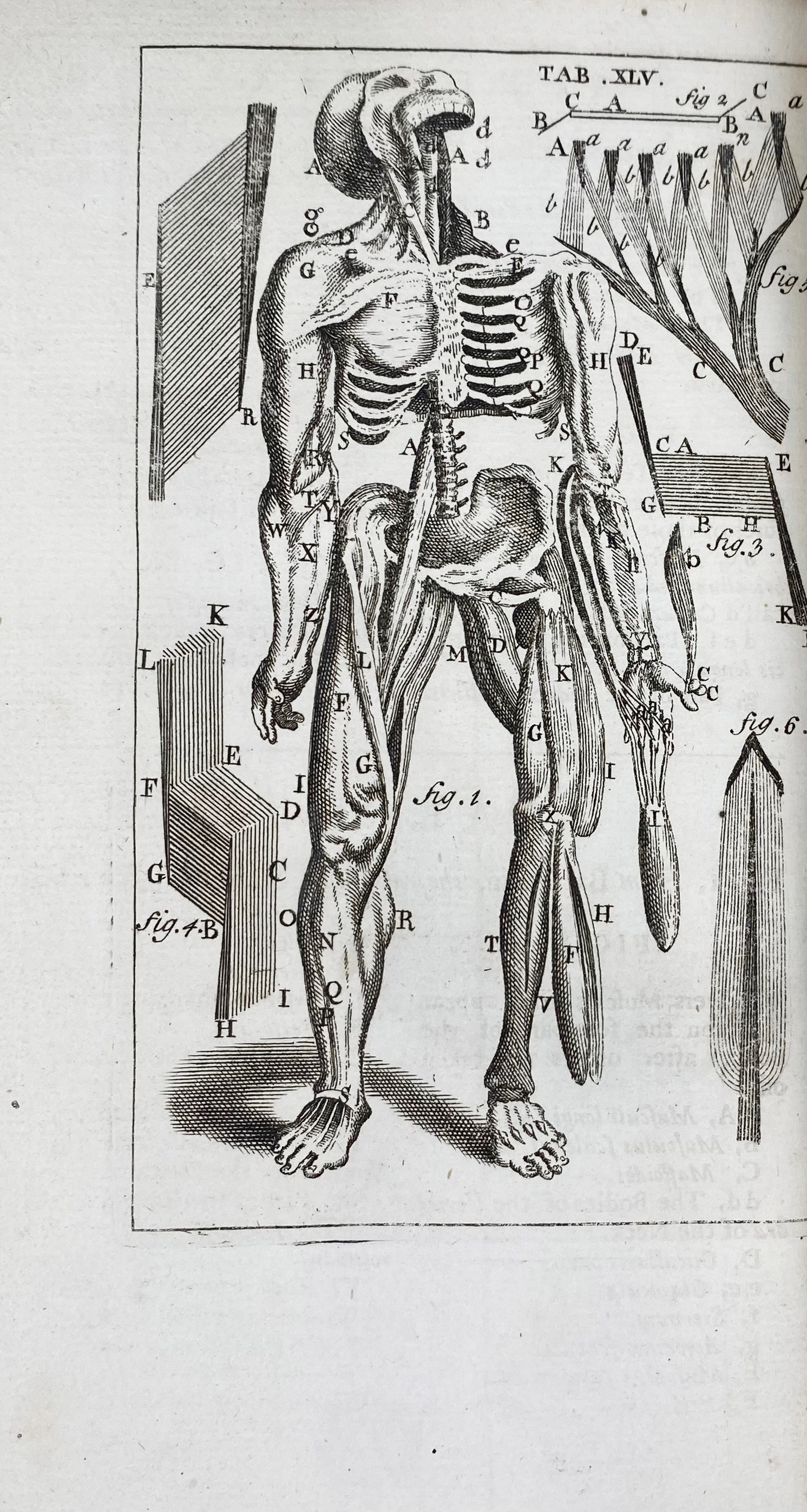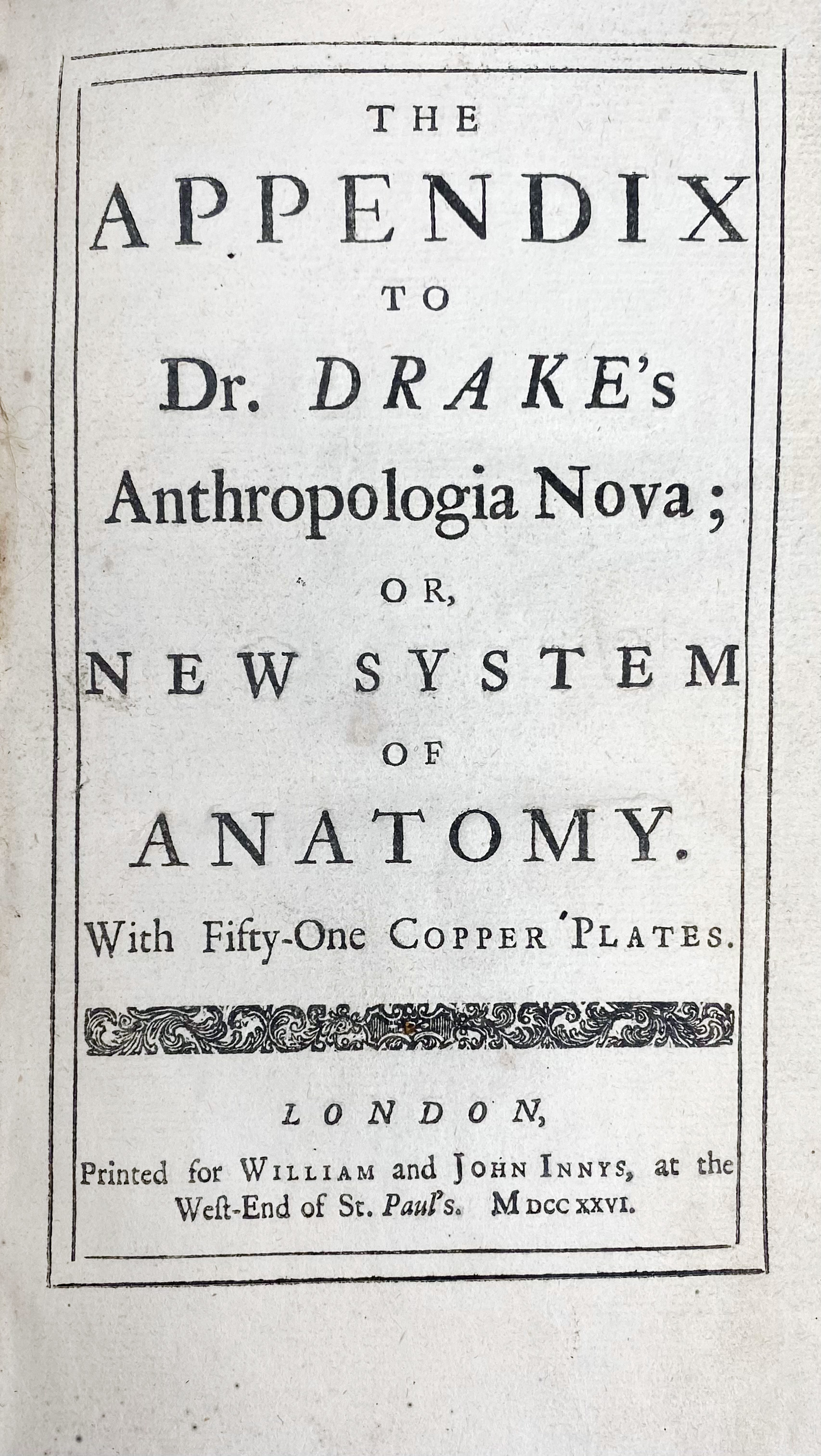 ANATOMY -- DRAKE, J. Anthropologia Nova: or, a New System of Anatomy. Describing the Animal Oeconomy, and a Short Rationale of Many Distempers Incident to Human Bodies. 3rd ed. w. additions. (&) The appendix. - Lond., 1726-27. 3 vols. xii, (4), 188; (4), 189-448, (16); (2), 95, (1) pp. W. engr. front.-portr. & 83 fold. engr. plates. Mod. cf. (vol. 1-2) & cont. panelled cf. (Extremities vol. 3 a bit dam., but interior good and clean; vol. 1-2: w. small stamps, severely waterstained throughout, in places a bit moulded).