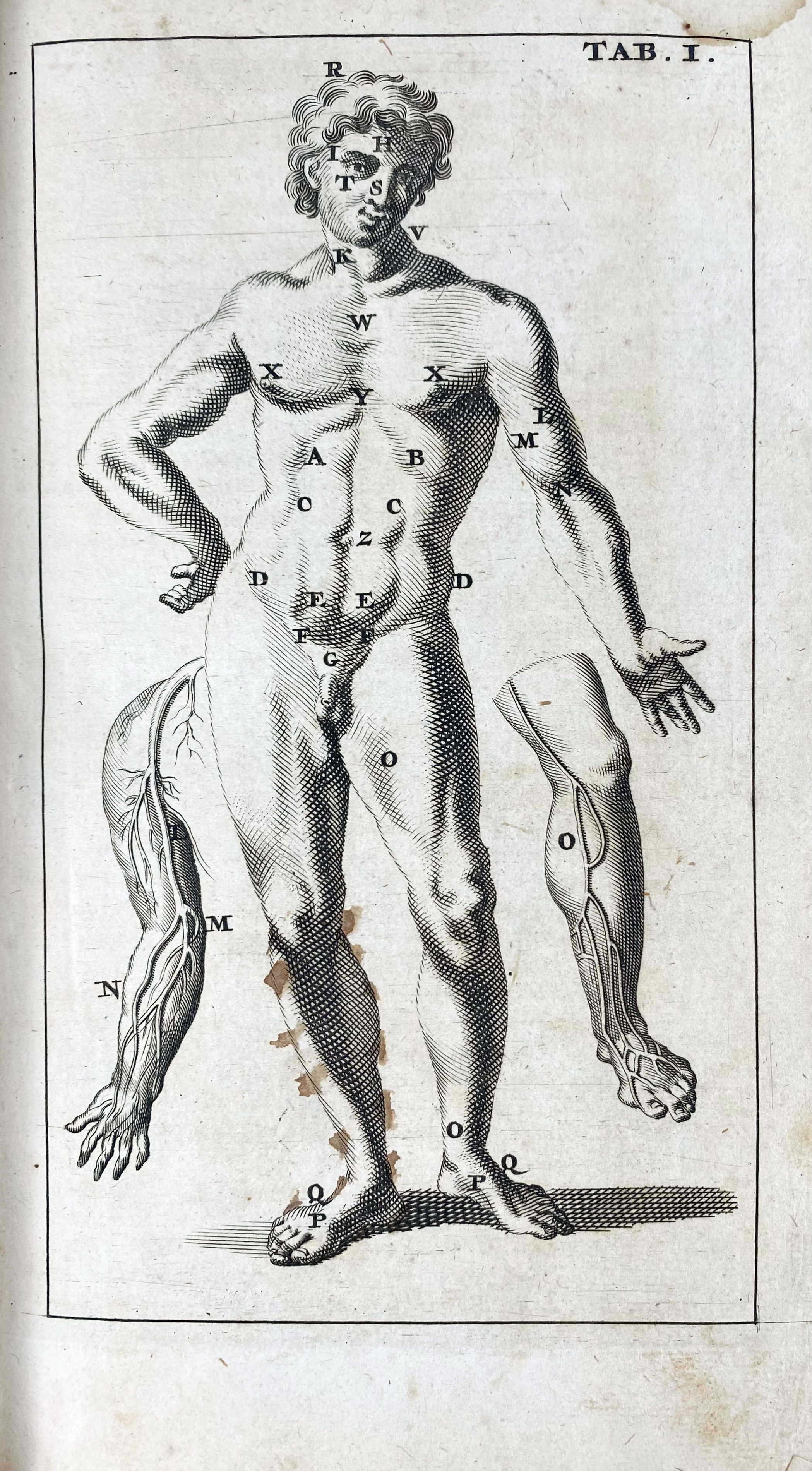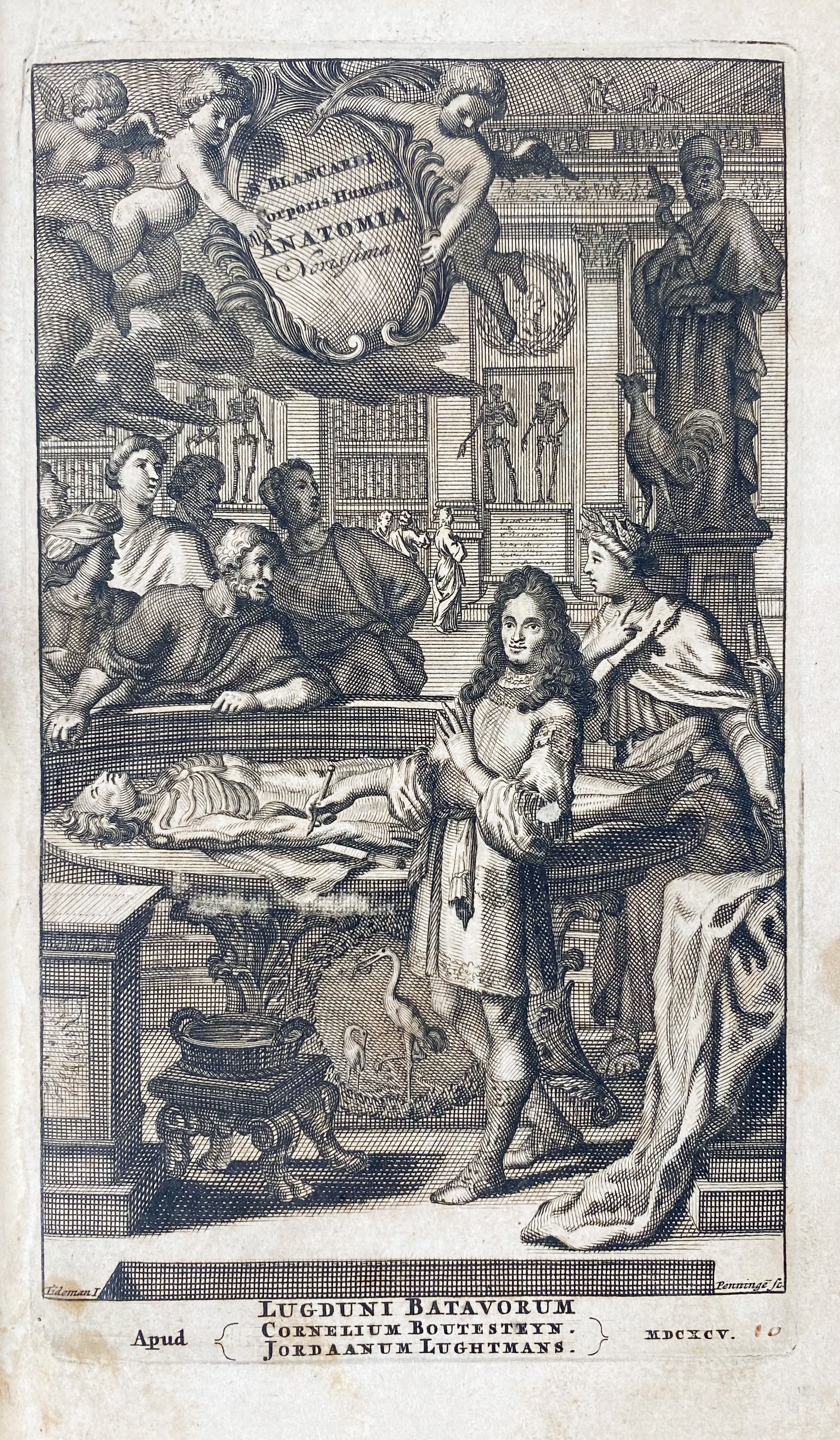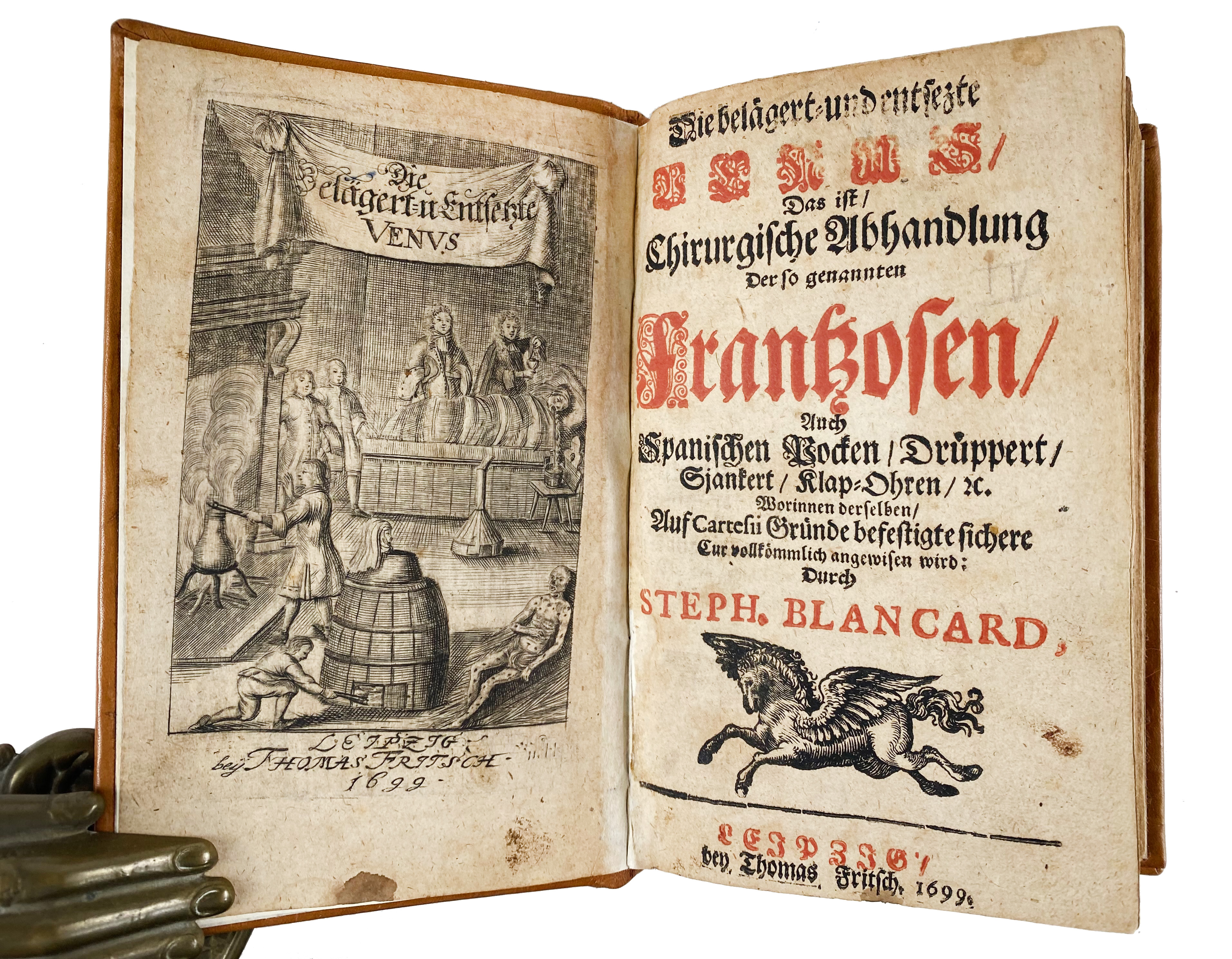 BLANKAART, S. Anatomia Reformata, sive concinna corporis humani dissectio, ad neotericorum mentem adornata. Ed. nov. (...) Acced. ejusdem autore Balsamatione. Leyden, C. Boutestein, J. Luchtmans, 1695. (14), 759 (= 769), (15) pp. W. engr. title showing the anatomical theatre at Leyden, engr. portr. depicting the author, 84 full-p. engr. Cont. vellum. (Foxing). -- Added: Id. Die belägert- und entsetzte Venus, das ist, Chirurgische Abhandlung der sogenannten Frantzosen, auch Spanischen Pocken (…). Lpz., Th. Fritsch, 1699. (6), 530, (6) pp. W. engr. ti. & 8 engr. plates. Mod. cf. (Severely browned/foxed). -- (2).