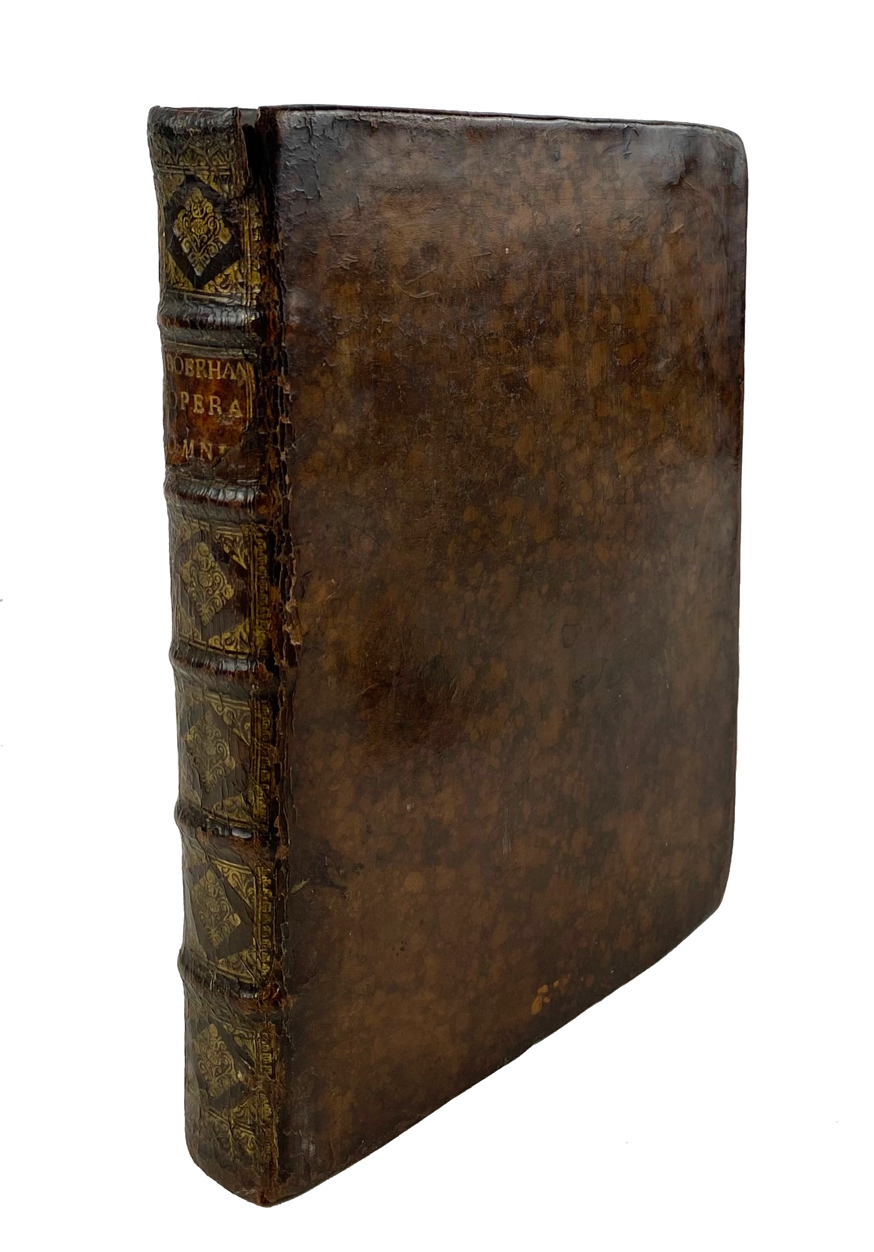BOERHAAVE, H. Opera omnia medica complectentia. Venice, L. Basilius, 1735. 8 parts in 1 vol. (16), 493, (3) pp. 4°. Cont. mottled cf. w. raised bands, dec. gilt back & brown label. (Tear in top of spine, first free endpaper gone, old name entry on ti., bookplate on paste down, sl. foxing).