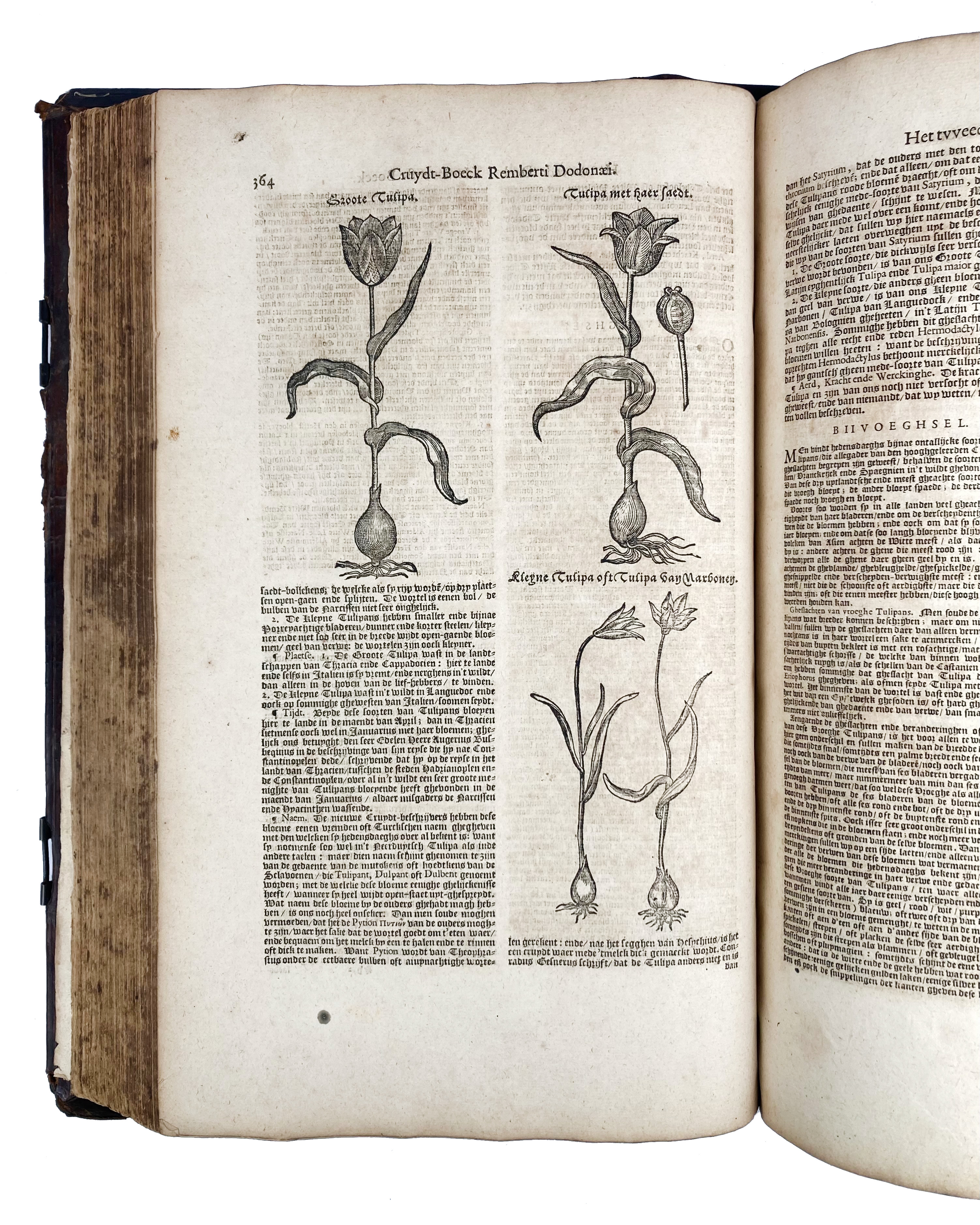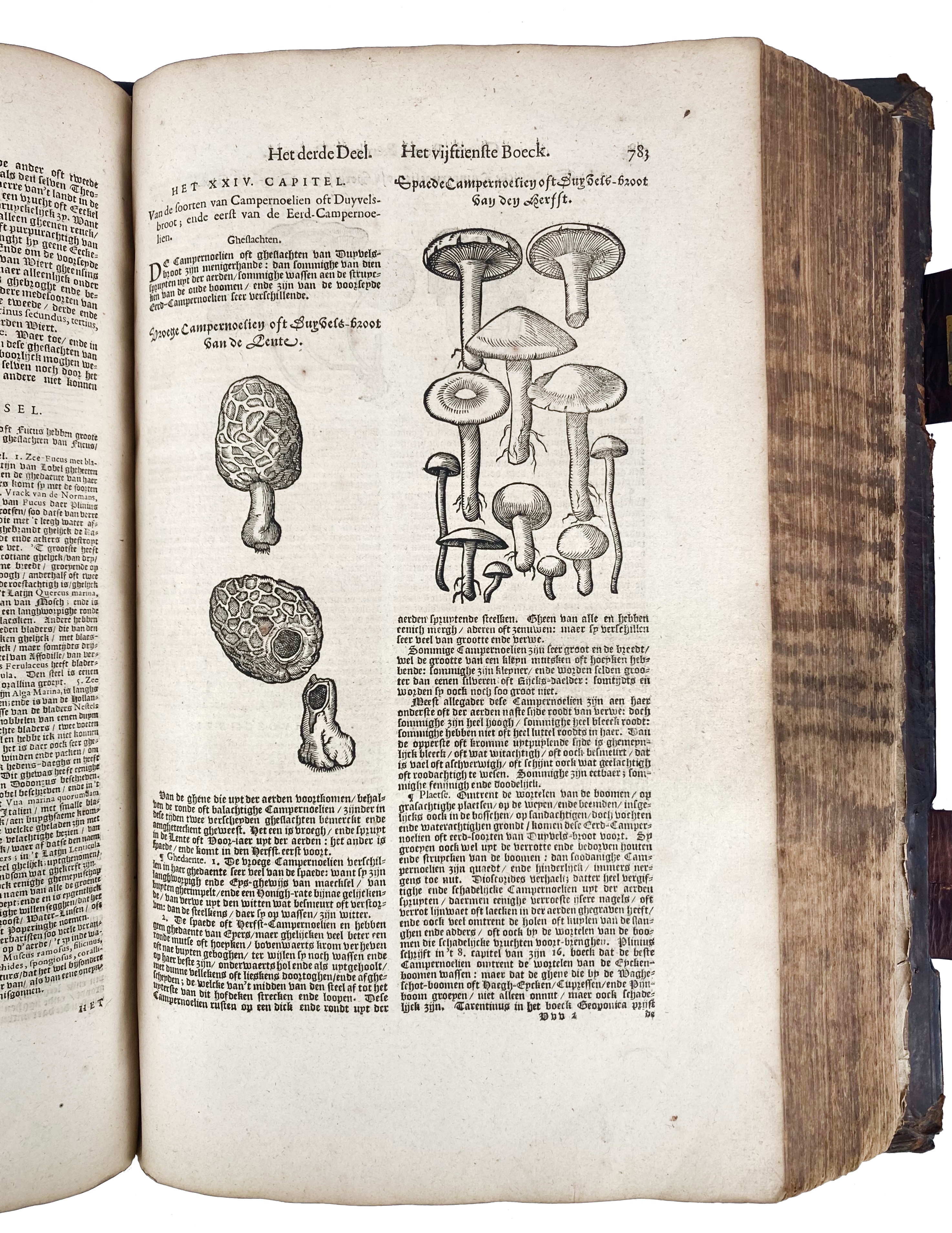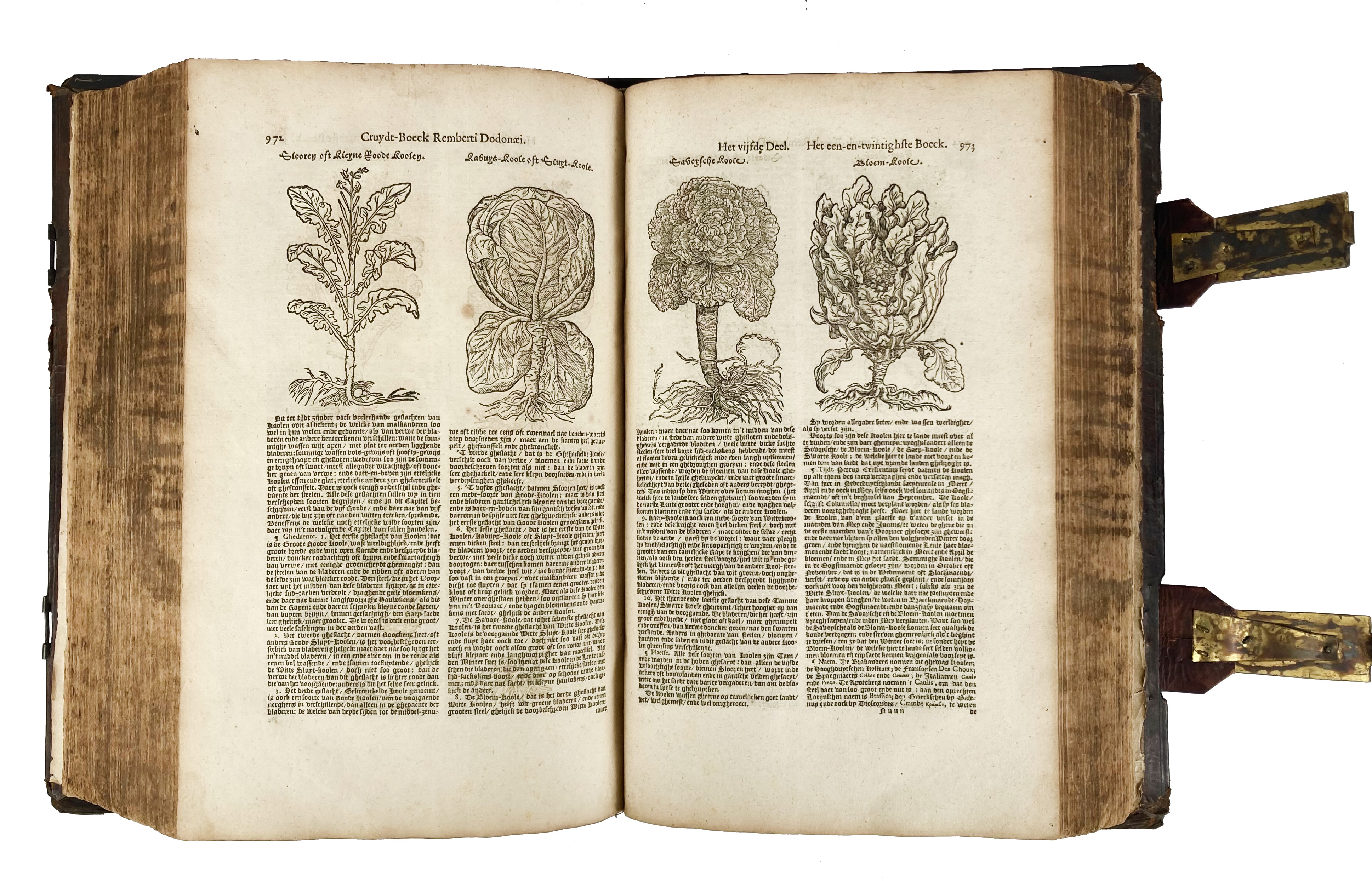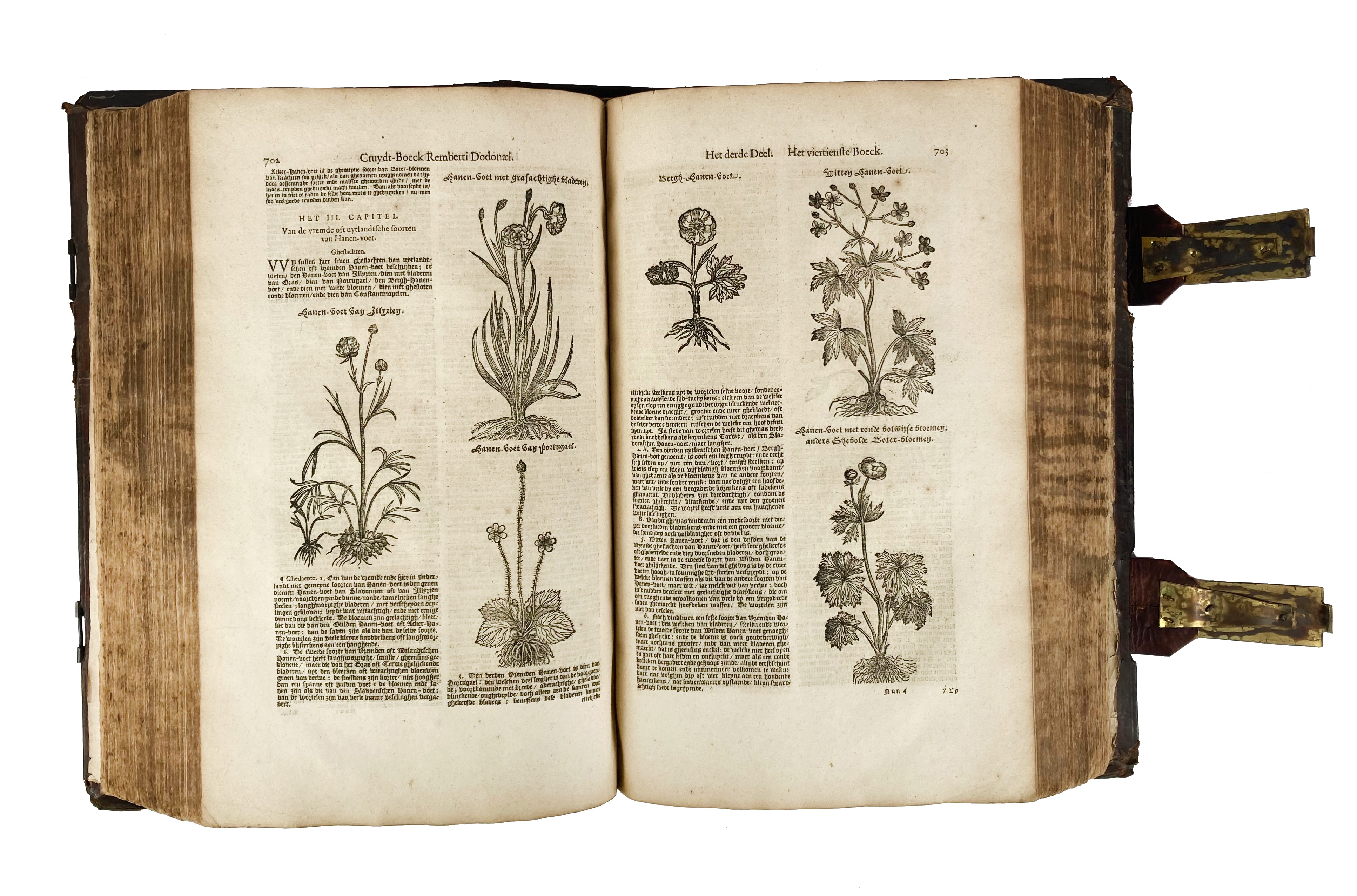 BOTANY -- DODONÆUS (DODOENS), R. Cruydt-boeck volghens sijne laetste verbeteringhe: Met bijvoeghsels achter elck Capitel, uyt verscheyden Cruydt-beschrijvers: Item, in 't laetste een Beschryvinghe vande Indiaensche ghewassen, meest ghetrocken uyt de schriften van C. Clusius. Nu wederom v. nieuws oversien en verb. Antw., Plantijnsche Druckerije v. Balth. Moretus, 1644. (36), 1492, (60) pp. W. fine engr. title and more than 1450 woodcuts in text. Fol. Cont. blind tooled cf. panel binding over wooden brds., partly beveled upper and lower edges, brass boss on the front side, w. brass clasps. (Skillfully rebacked w. use of old spine, p. 495 w. tear of c. 10 cm into the page (no loss of text or image), last leaf of the table of contents carefully repaired w. paper, w. some loss of text at the inner margin, apart from some age-toning a very well-preserved and lovingly repaired copy).