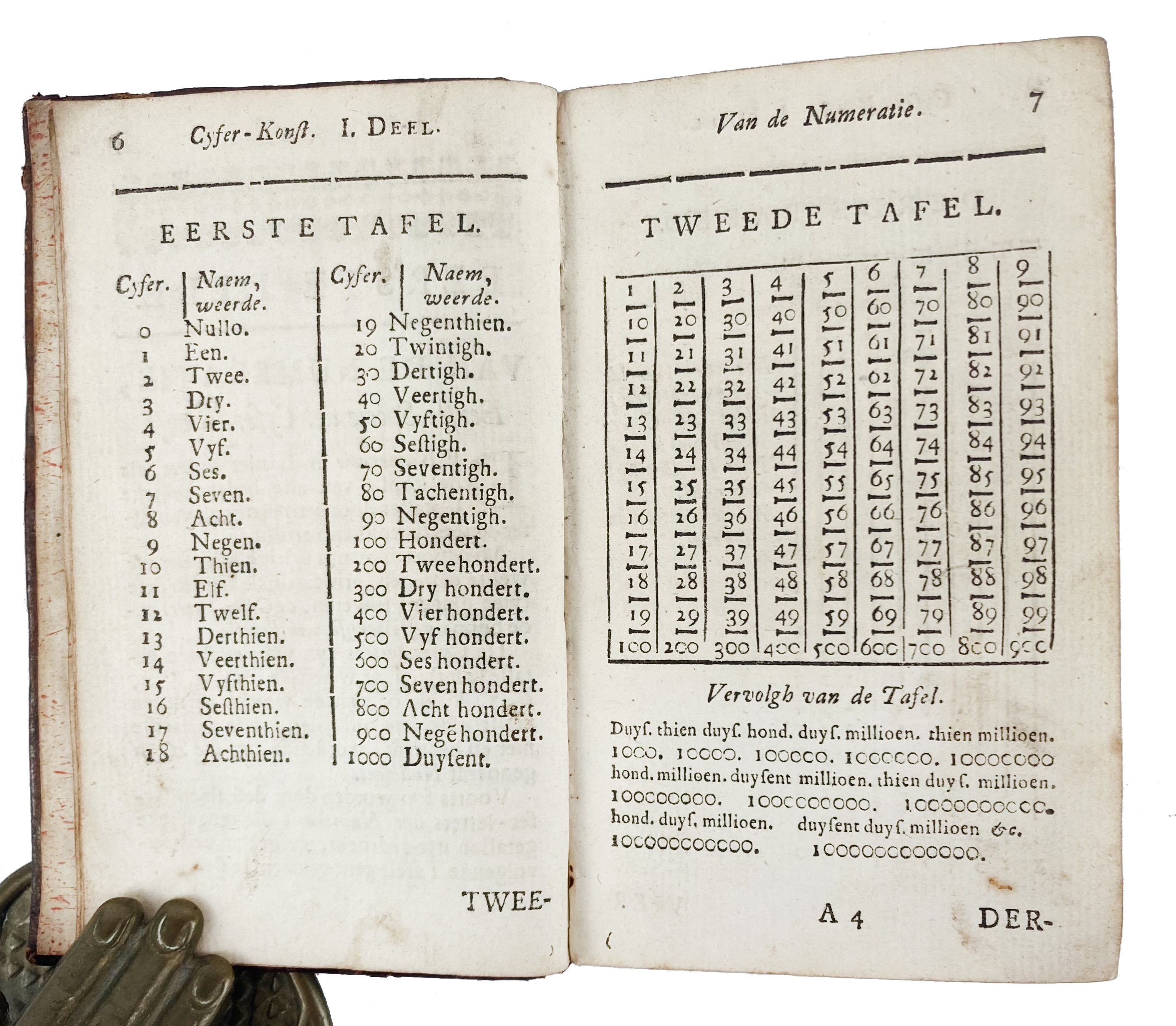COURT, P. la. Inleydinge tot de cyfer-konst waer in de hooft-specien Arithmetices grondelyck ende seer klaer worden uyt-geleyt. Den laetsten Dr. verm. & verb. Bruss., Wed. J. Vleugaert, 1744. (2), 233, (8) pp. 12°. Cont. cf., spine w. raised bands & gilt dec., speckled edges. (Wear to spine ends, joints split but holding, some yellowing on title-p.).