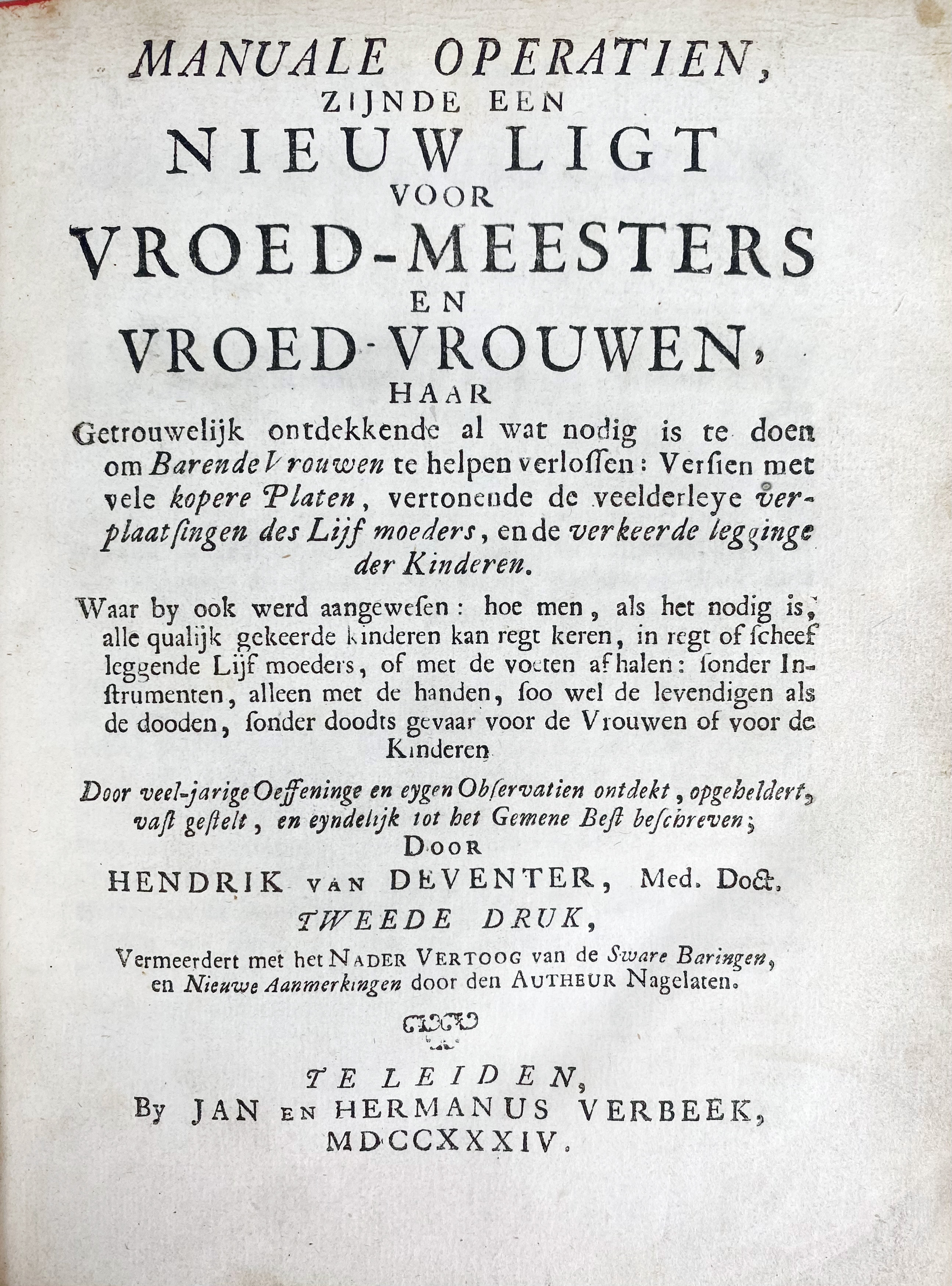 DEVENTER, H. v. Manuale operatien, zijnde een nieuw ligt voor vroed-meesters en vroed-vrouwen, haar getrouwelijk ontdekkende al wat nodig is te doen om Barende Vrouwen te helpen verlossen (...). 2e dr. Leyden, J. & H. Verbeek, 1734. (20), 363, (27), 351-465, (11) pp. W. fold. engr. front.-portr., 36 (fold.) plates. 4°. Cont. cf. w. raised bands, richly dec. gilt back, gilt borders on both sides. (Joints split, top of spine a bit dam., some plates a bit torn, outer margin faintly stained at the end, some foxing).