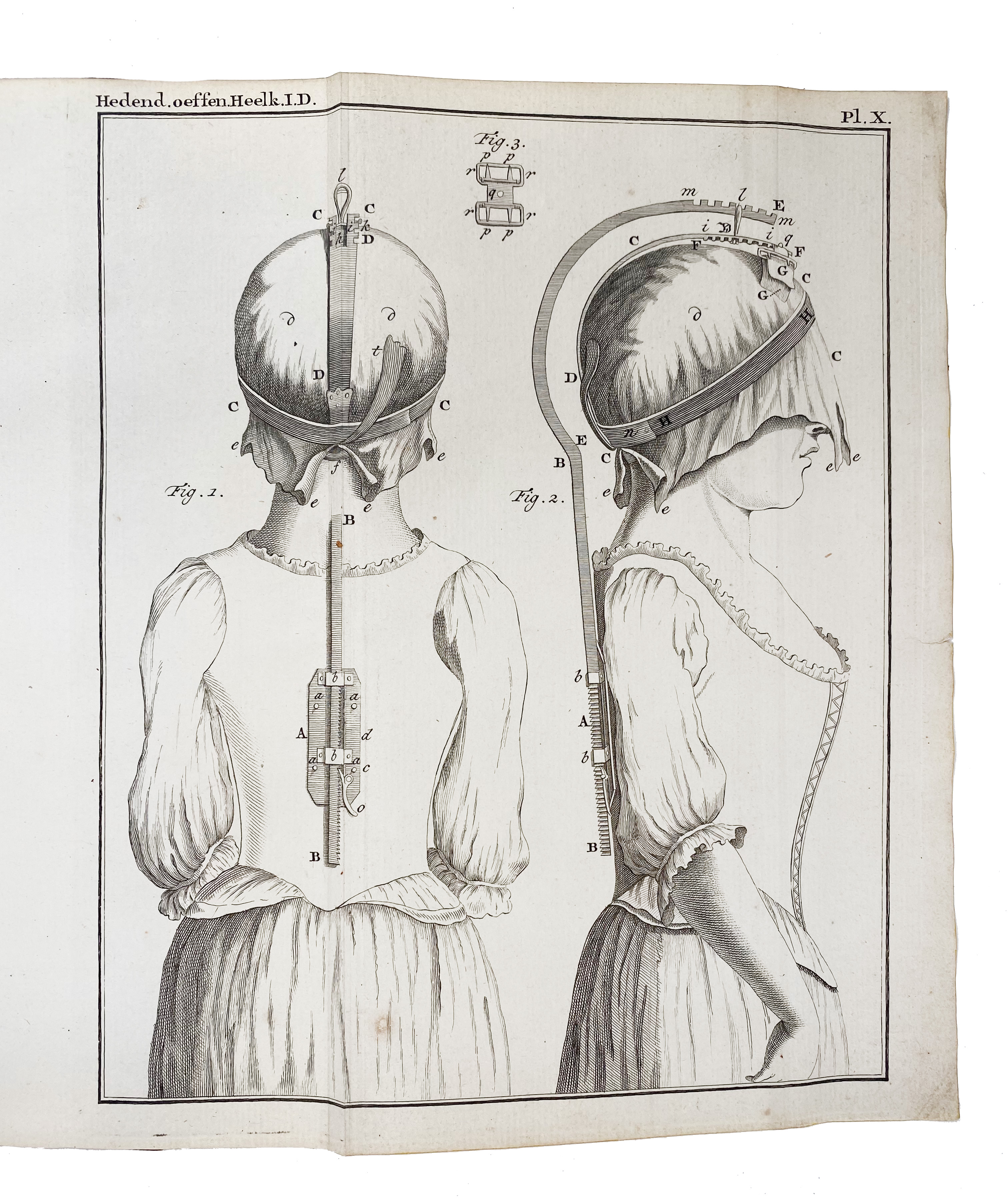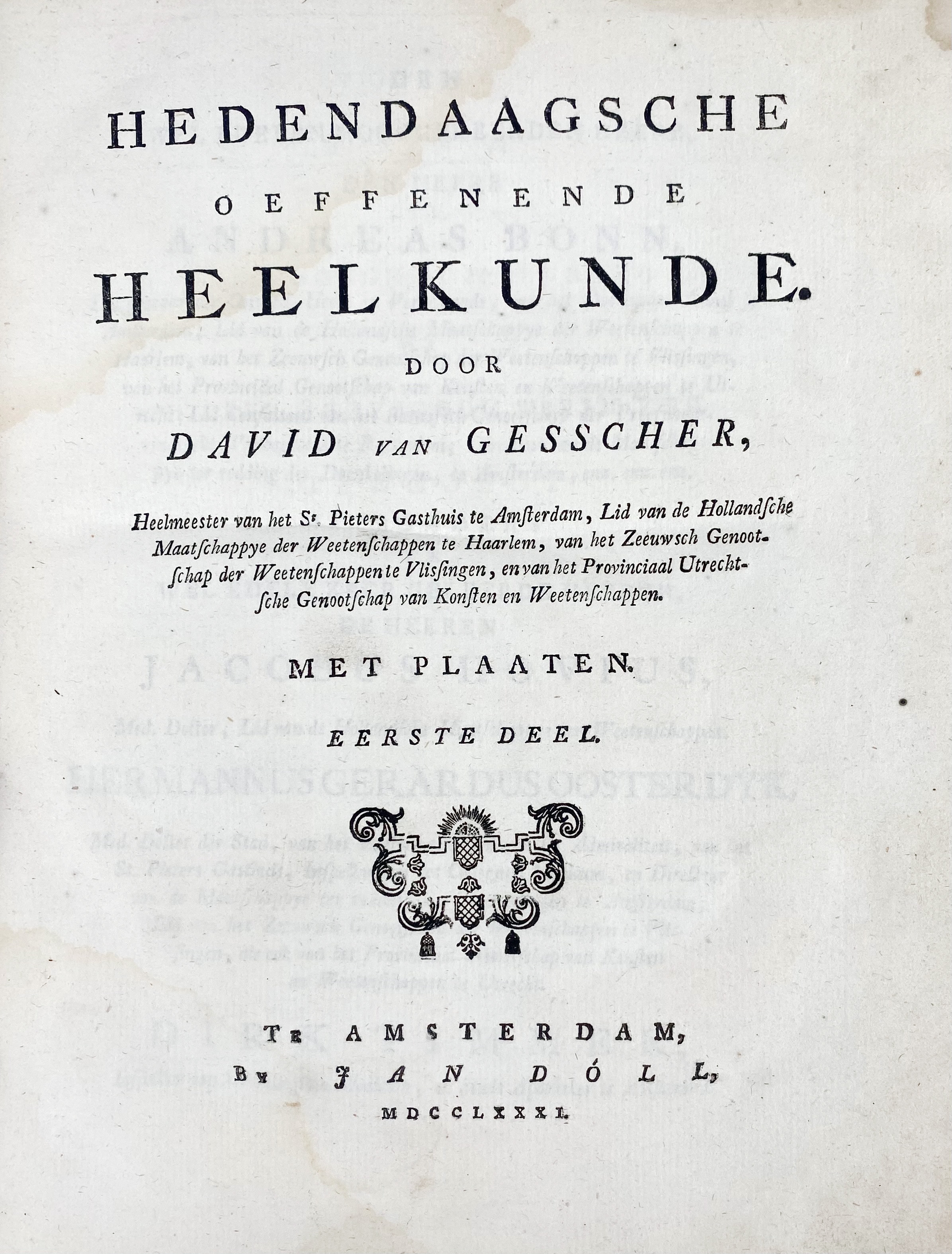 GESSCHER, D. v. Hedendaagsche oeffenende heelkunde. Amst., J. Dóll, 1781. 3 vols. (2), viii, viii, (4), 456; (8), 366; (4), 392 pp. W. 40 fold. engr. plates. 4°. Cont. hcf. w. dec. gilt backs & red labels. (Portr. lacks, some sm. dam. to spines, waterstained in places).