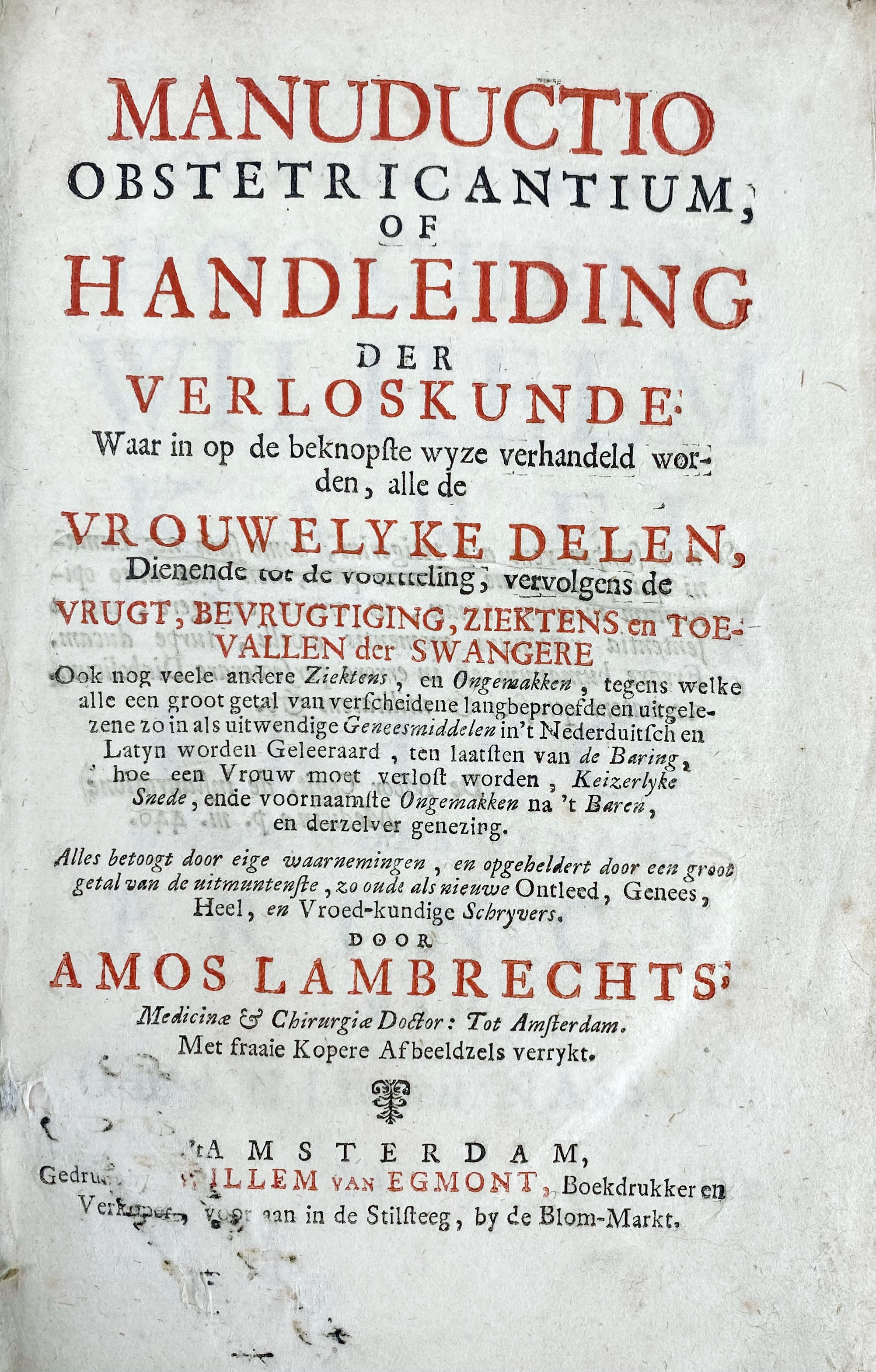 GYNAECOLOGY & OBSTETRICS -- LAMBRECHTS, A. Manuductio obstetricantium, of handleiding der verloskunde. Waar in op de beknopste wyze verhandeld worden, alle de vrouwelyke delen, dienende tot de voortteling, vervolgens de vrugt, bevrugting, ziektens en toevallen der swangere. Amst., W. v. Egmont, (1731). (24), 268, (6), (10) pp. W. 5 engr. fold. plates. Cont. h. vellum extra, uncut. (Stamp removed from ti. causing some minor dam., a few marg. stains, sl. age-toned).