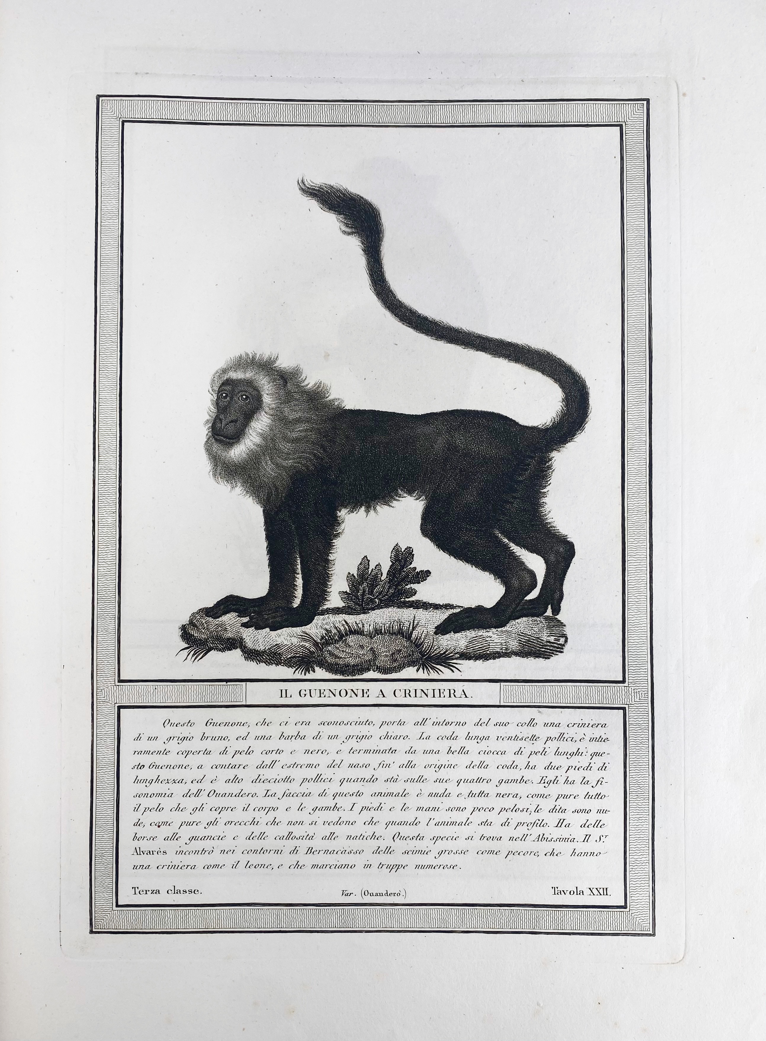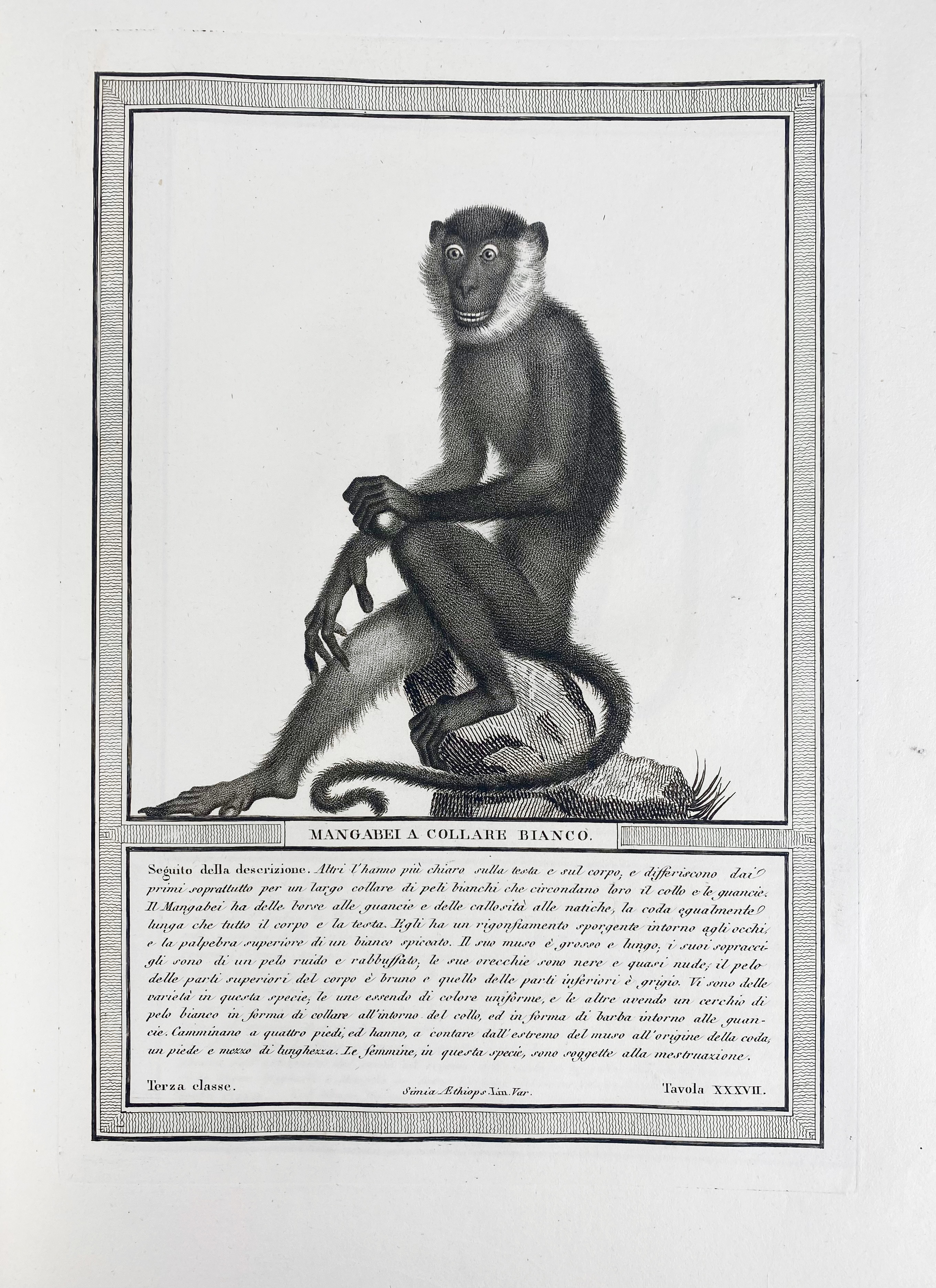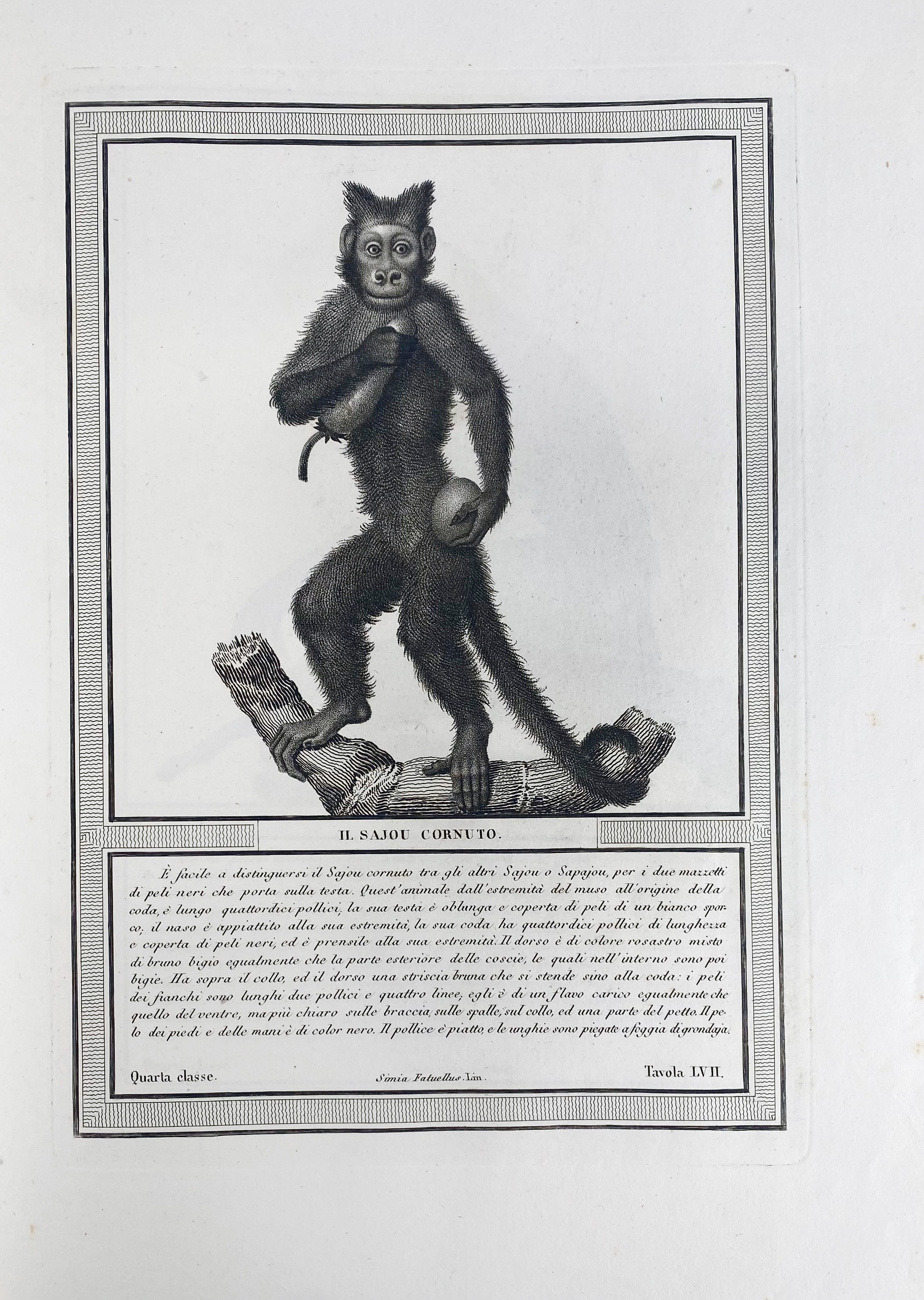 A splendidly illustrated monograph on apes and monkeys by the talented French painter Nicholas Henri Jacob (1782-1871). Second, entirely Italian edition with 85 beautiful stipple-engraved plates, made by Luigi Rados after Jacob's drawings, with printed captions in French and German on each plate. The book discusses species of apes, and monkeys from both the Old and New Worlds. The text gives details on their origin, habits, etc. Three of the first 6 plates, which are separately numbered, but also in Roman numerals, show comparisons between the human and ape skeleton and fetuses, and even these are thought-provoking, if not charming. The second volume, is entirely in Italian and deals exclusively with the makis (Lemuroidea) of Madagascar, not including true monkeys. - Rare. Nissen ZBI, 2080; Wood, p. 402.