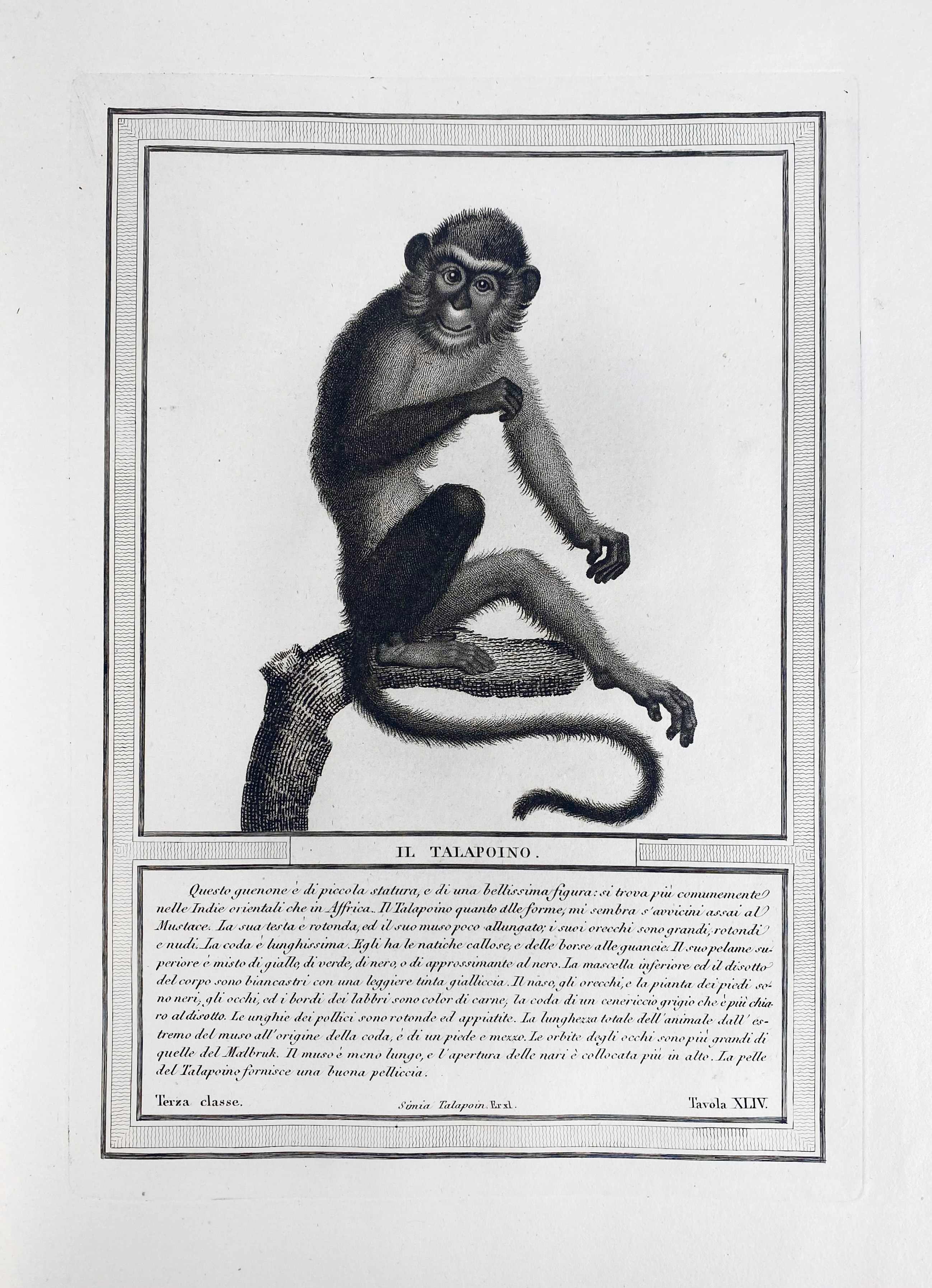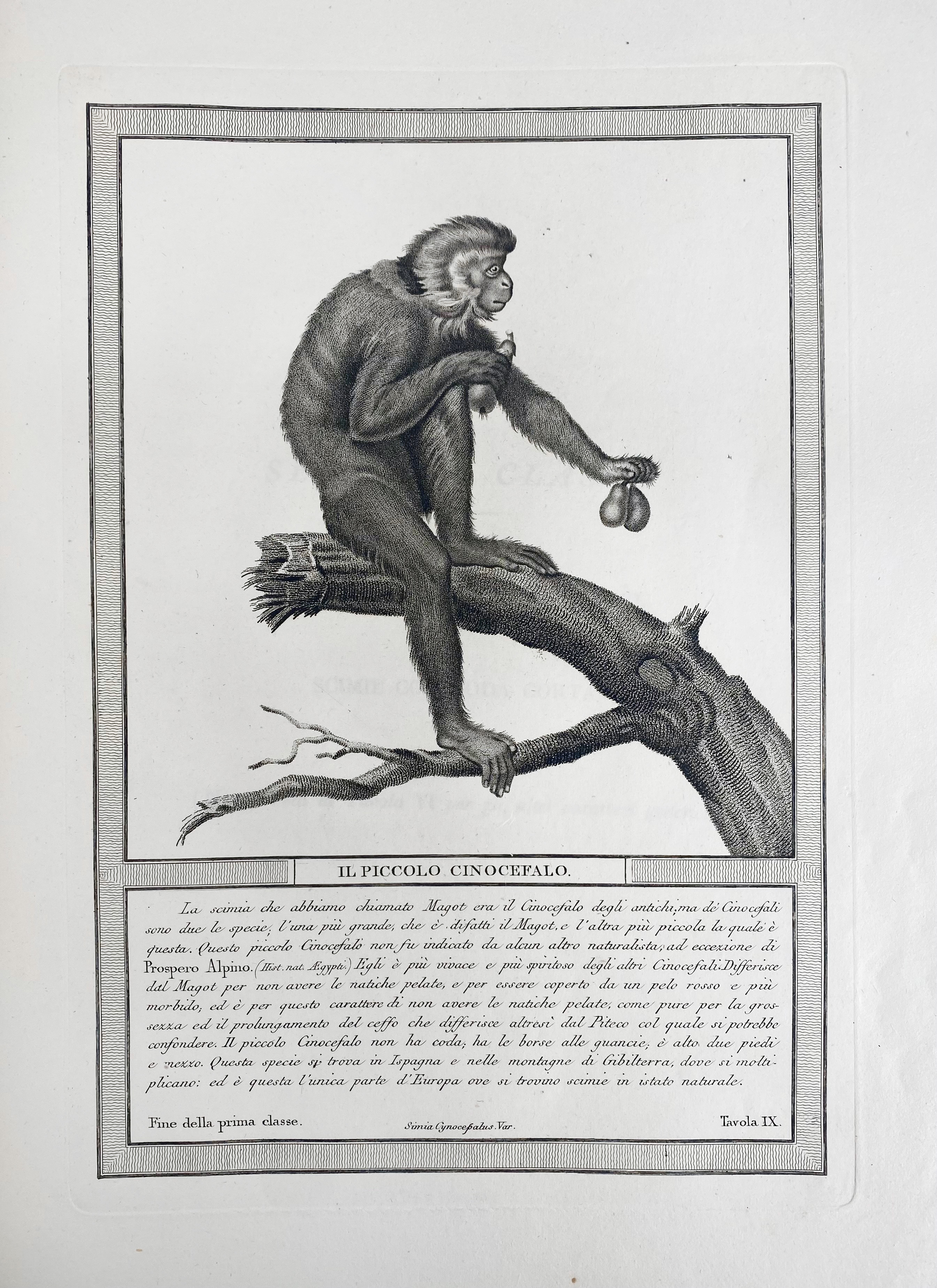 (JACOB, N.H.). Storia naturale delle scimie e dei maki, disposta con ordine da P. Hugues. Milano, P. Hugues, 1822. 2 in 1 vol. Vol. 1: Engr. ti. in sepia, 6 engr. plates (I-VI), & 70 (I-LXX) fine stipple-engr. plates of apes and monkeys, each with descriptive captions in Italian & 20 engr. plates w. notes and index (LXXI-LXXXVIII & 1-2), w. 5 letterpress section-ti. & introd. leaf for each section. Vol. 2: Engr. ti. ("Dei lemuriani ossia maki propriamente detti"), & 3 engr. introd. lvs. (1-4), W. 15 engr. plates & 1 engr. index leaf (I-XVI), w. 4 letterpress section-ti. & introd. leaf for each section. Fol. Cont. h. vellum, untrimmed. (Very fine complete and clean copy, apart from some minor foxing spots, w. ample margins).