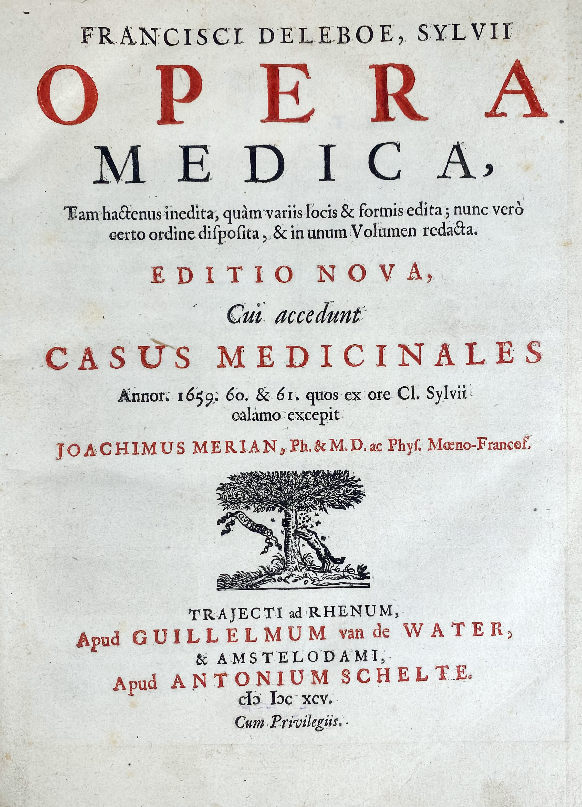 LE BOË, Fr. de (Sylvius). Opera medica. Ed. nova cui acced. casus medicinales (…) excepit J. Merian. Utr./Amst. G. v.d. Water/A. Schelte, 1695. (8), 934, (26), 85, (9) pp. W. engr. fold. front.-portr. of the author. 4°. 19th c. hcf. w. black label, & mottled edges.