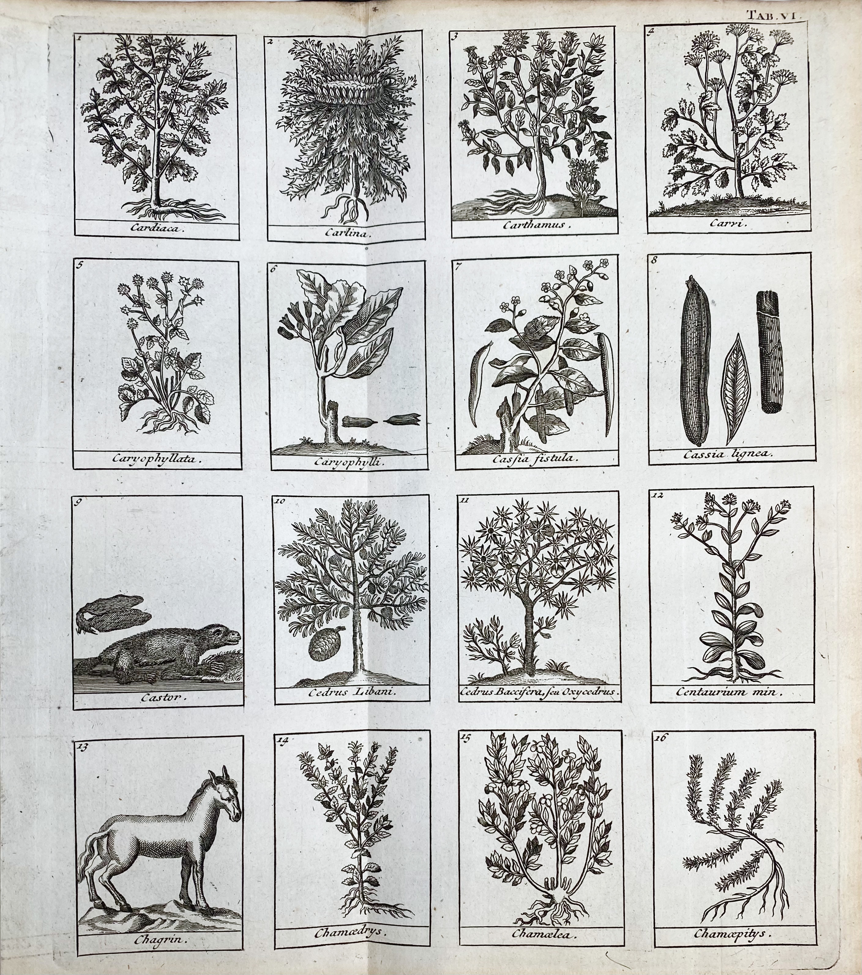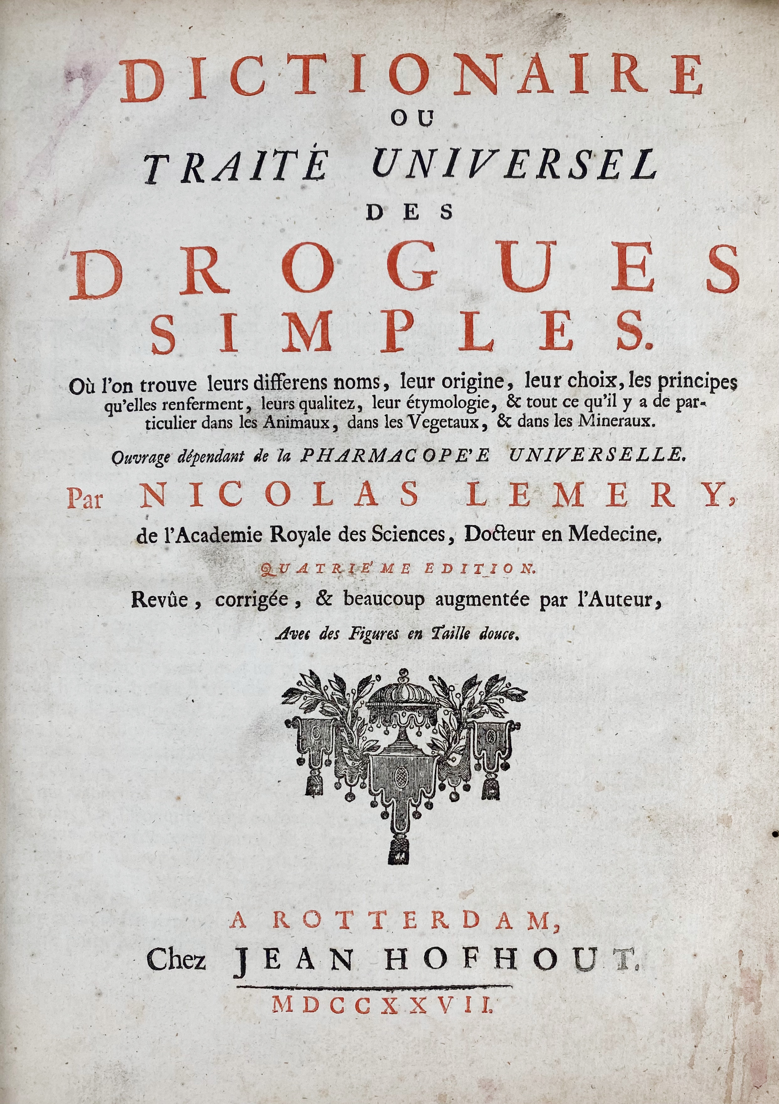 LÉMERY, N. Dictionaire ou traité universel des drogues simples. 4me éd. Revue, corr., & beaucoup augm. Rott., J. Hofhout, 1727. (20), 590, (58) pp. W. 25 engr. fold. plates. 4°. Old hcf. (Spine dam./partly gone, back cover loose, corner & board edges worn, lower margin a bit stained in places, tiny wormhole in outer margin, age-toned, a used but complete copy).