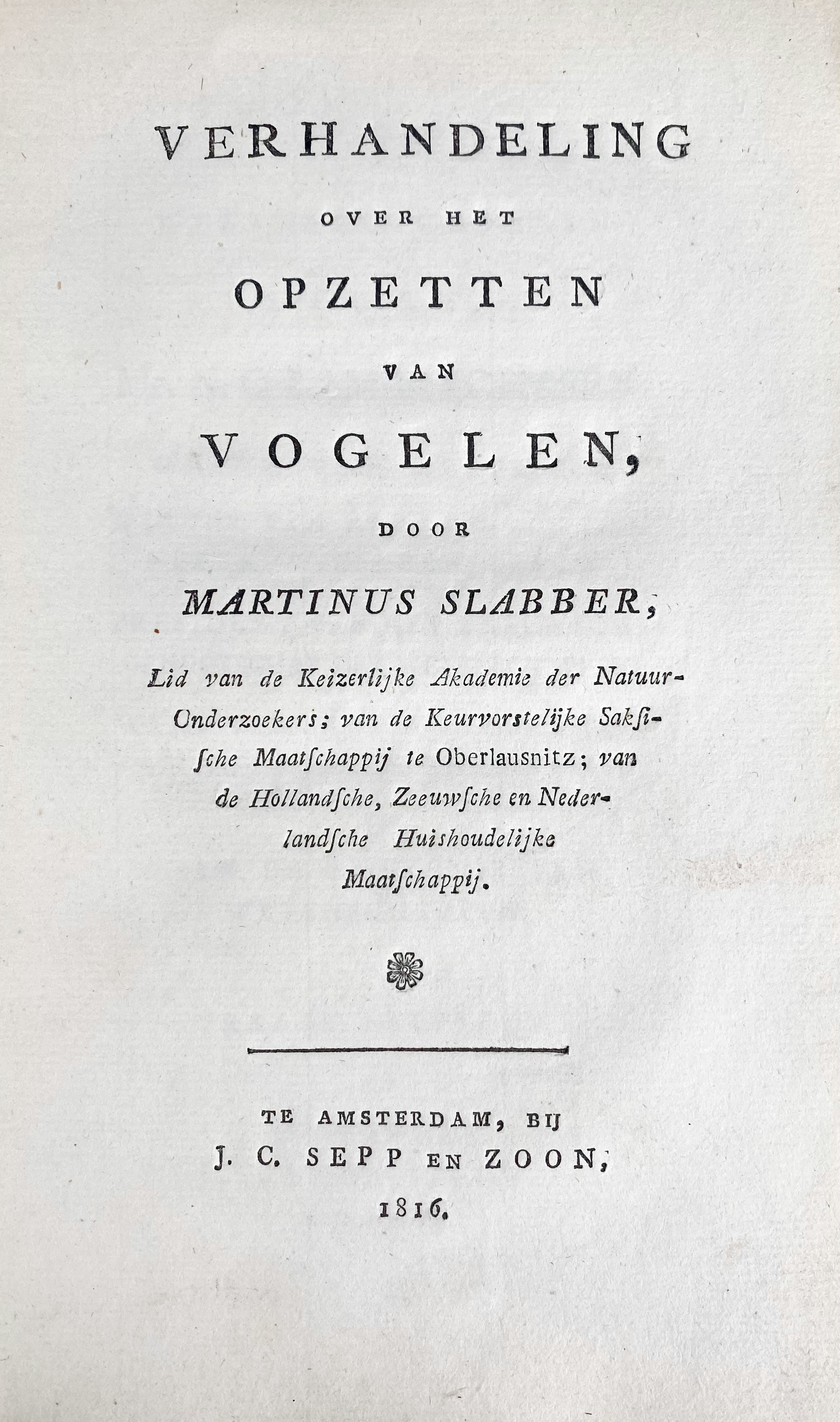 TAXIDERMY -- SLABBER, M. Verhandeling over het opzetten van vogelen. Amst., J.C. Sepp & Zn., 1816. (6), x, 64 pp. Or. printed brds., uncut. (Spine a bit worn, but a good and clean copy).
