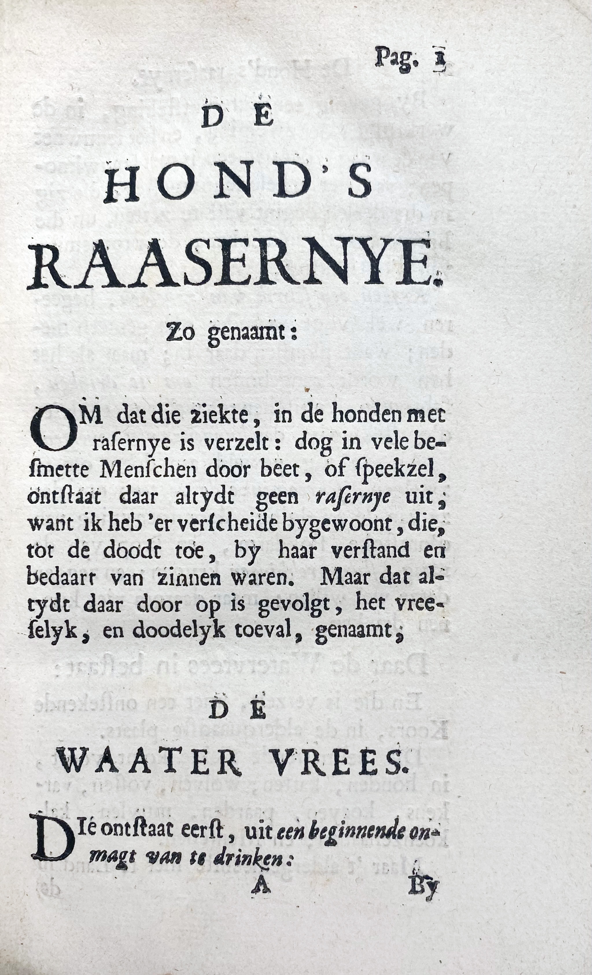 Extremely rare early work on rabies, only three copies in NCC (not in KB!). Subtitle: "In drie trappen onderscheyden, waar van den eersten geneeslyk, den tweden twyffelagtig, en den derden ongeneeslyk wordt gestelt, met de kentekenen waar aan die zyn te onderscheiden en de hulpmiddelen daar toe dienende."
