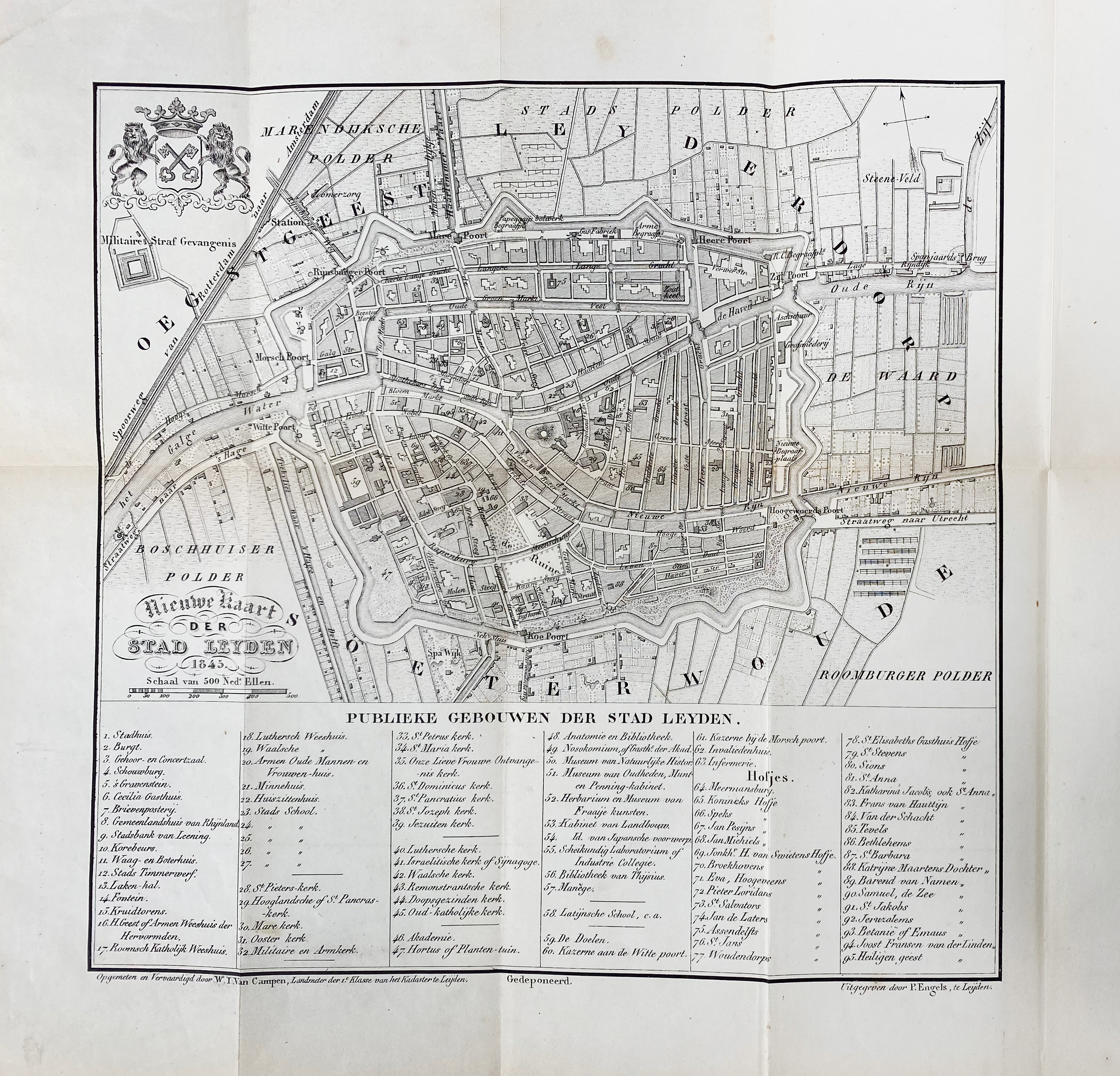 LEIDEN -- DISSEL, S. v. Verkorte beschrijving & geschiedenis der Stad Leyden. Een leesboek ten dienste der jeugd. Leyden, P. Engels, 1845. W. engr. front. fold. plan of the city. Sm-8°. Obrds. (Back rep.). -- Added: LEYDENS OMSTREKEN wandelend geschetst. Leyden, De Breuk & Smits, 1859. W. 1 fold. map at end. Sm-8°. Old clothbacked brds. (Small corner from map replaced in photostat, annot. on v° map). -- (2).