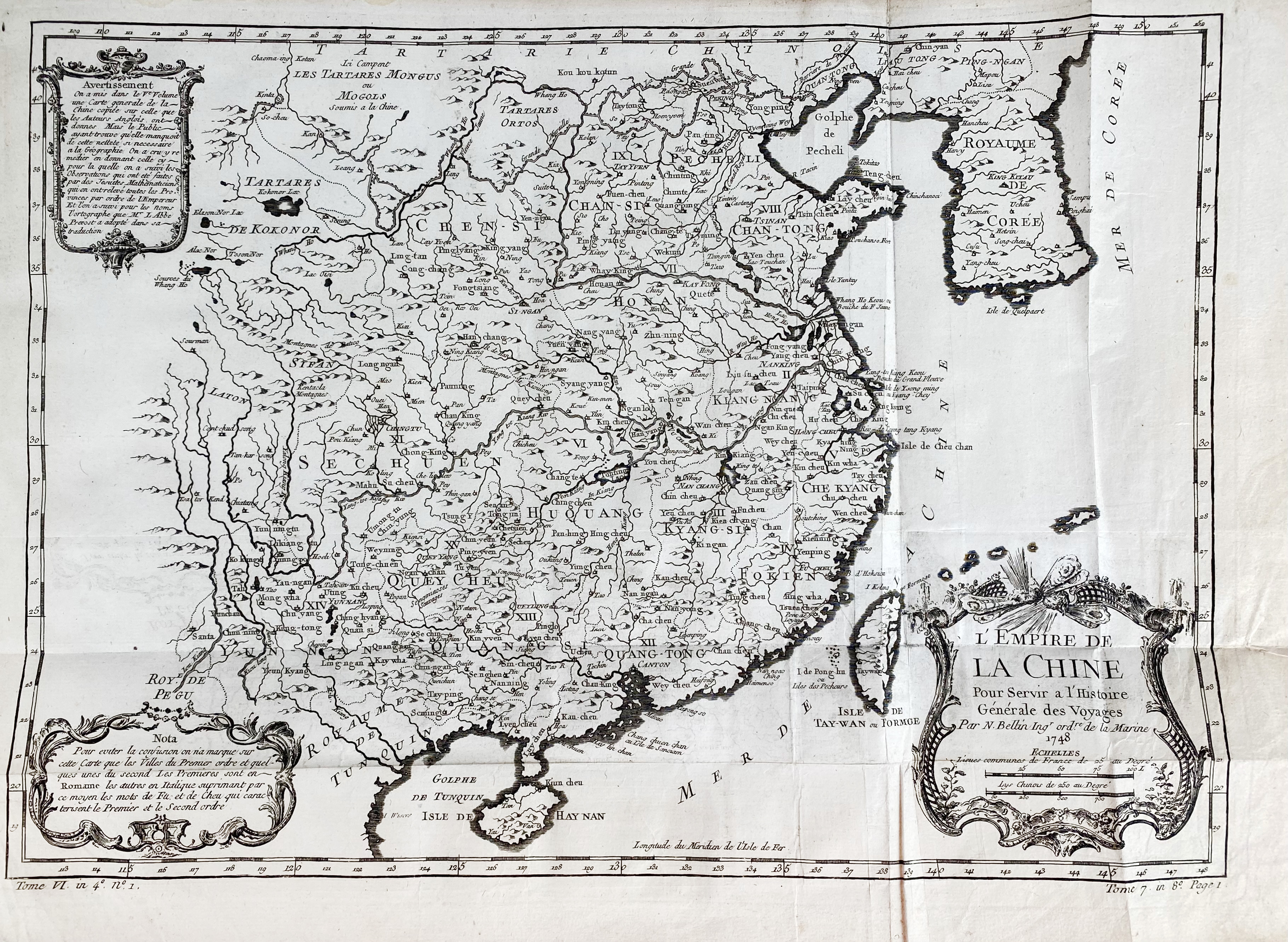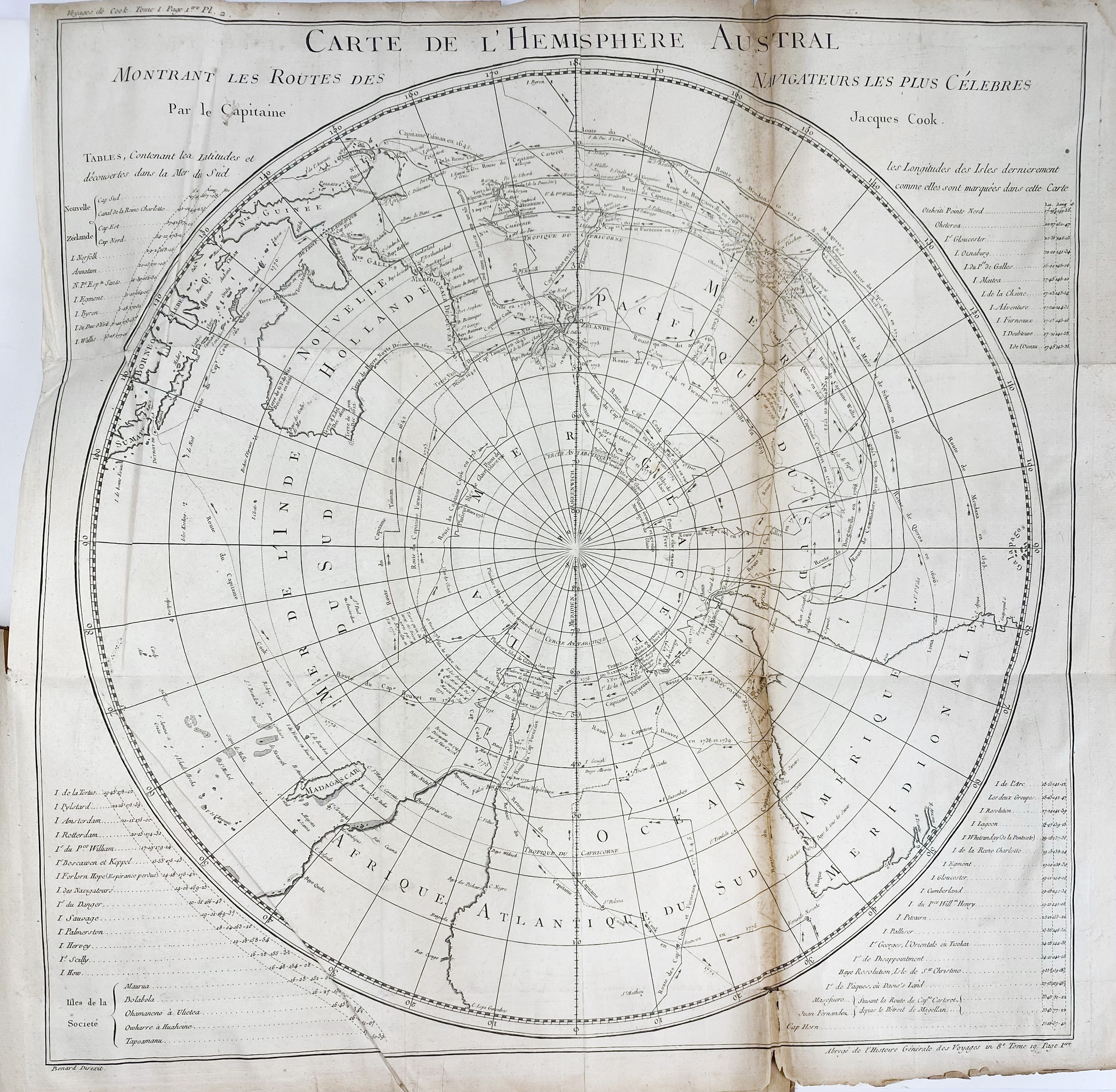 Atlas of 73 engraved maps, mostly after Bellin, to accompany the "Histoire générale des voyages, ou Nouvelle collection de toutes les relations de voyages par mer et par terre" by Abbé Antoine François Prévost. This atlas covers a vast geographical area, encompassing the African, Asian, American, and Oceanian continents.