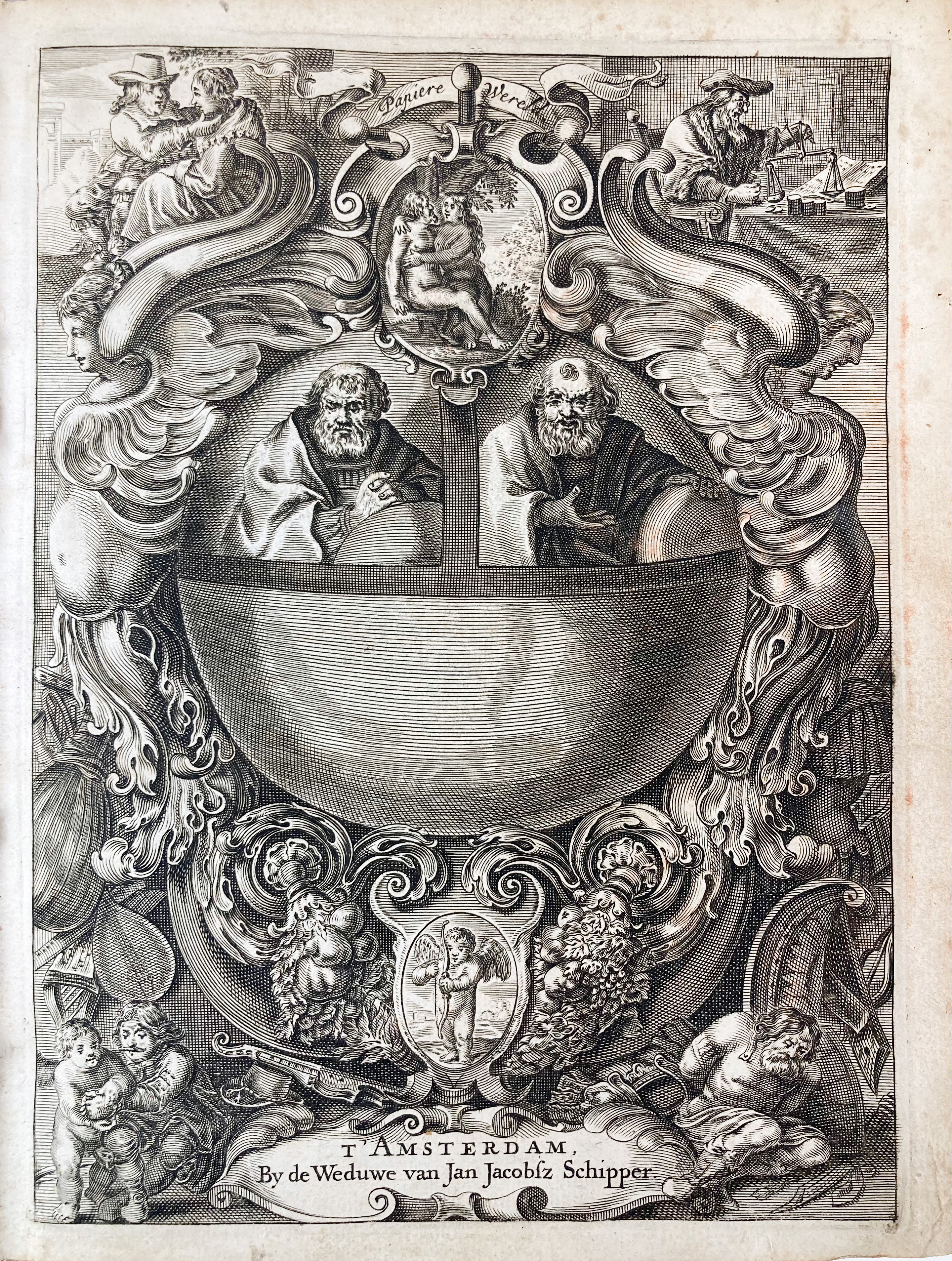 EMBLEM BOOKS -- KRUL, J.H. Pampiere wereld Ofte Wereldsche Oeffeninge, Waer in begrepen zijn meest alle de Rijmen en Werken. Amst., (Wed. v. J.J. Schipper), 1681. 4 parts in 1 vol. (12), 320, 447, (4) pp. W. engr. front., 1 engr. attr. to F. Bol (formerly attr. to Rembrandt) & 92 engrs. in text, for the greater part emblematical. 4°. Fine cont. blind tooled vellum. (Slightly browned/age-toned as always, outer margin first 3 lvs. (incl. front.) a bit dam.).