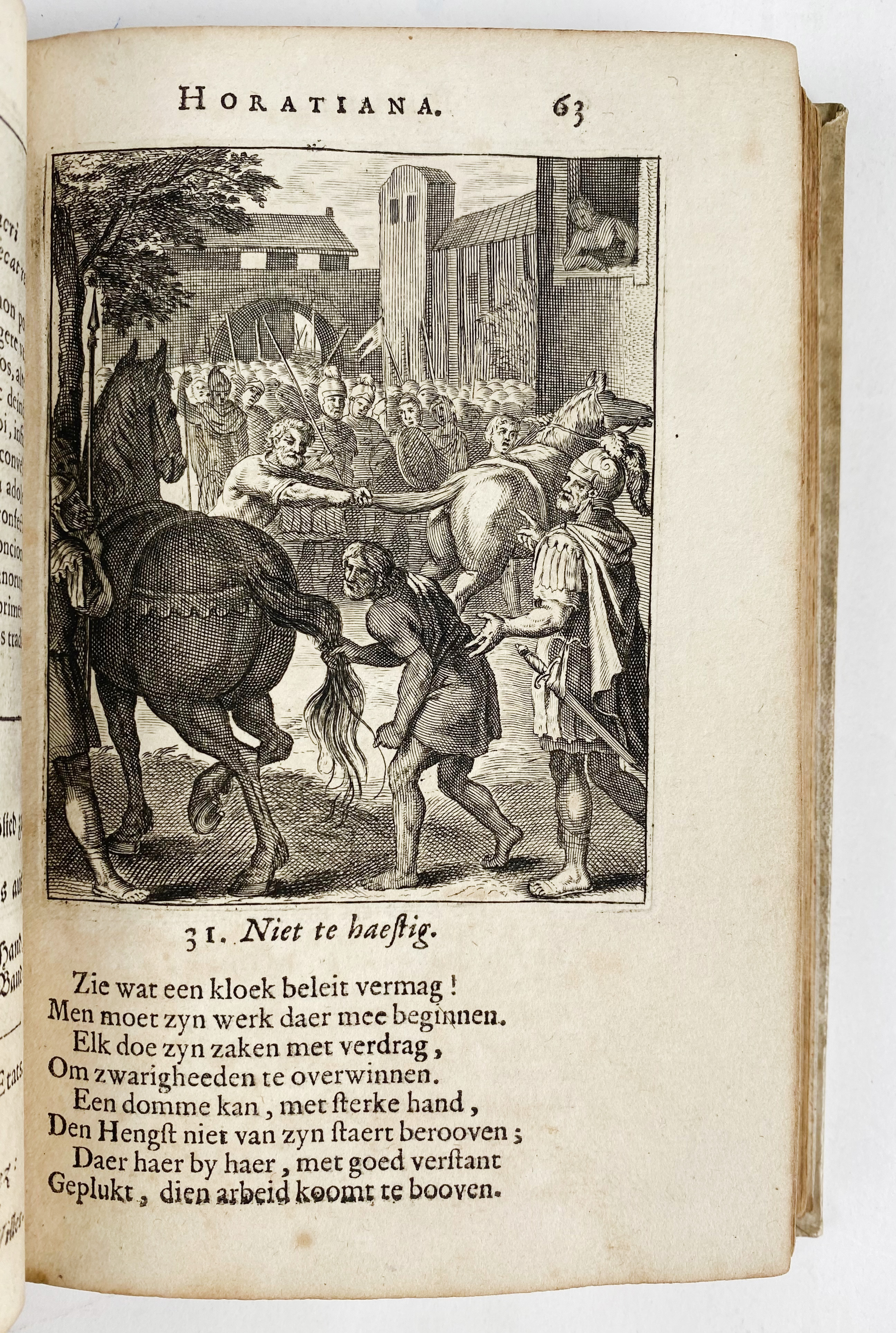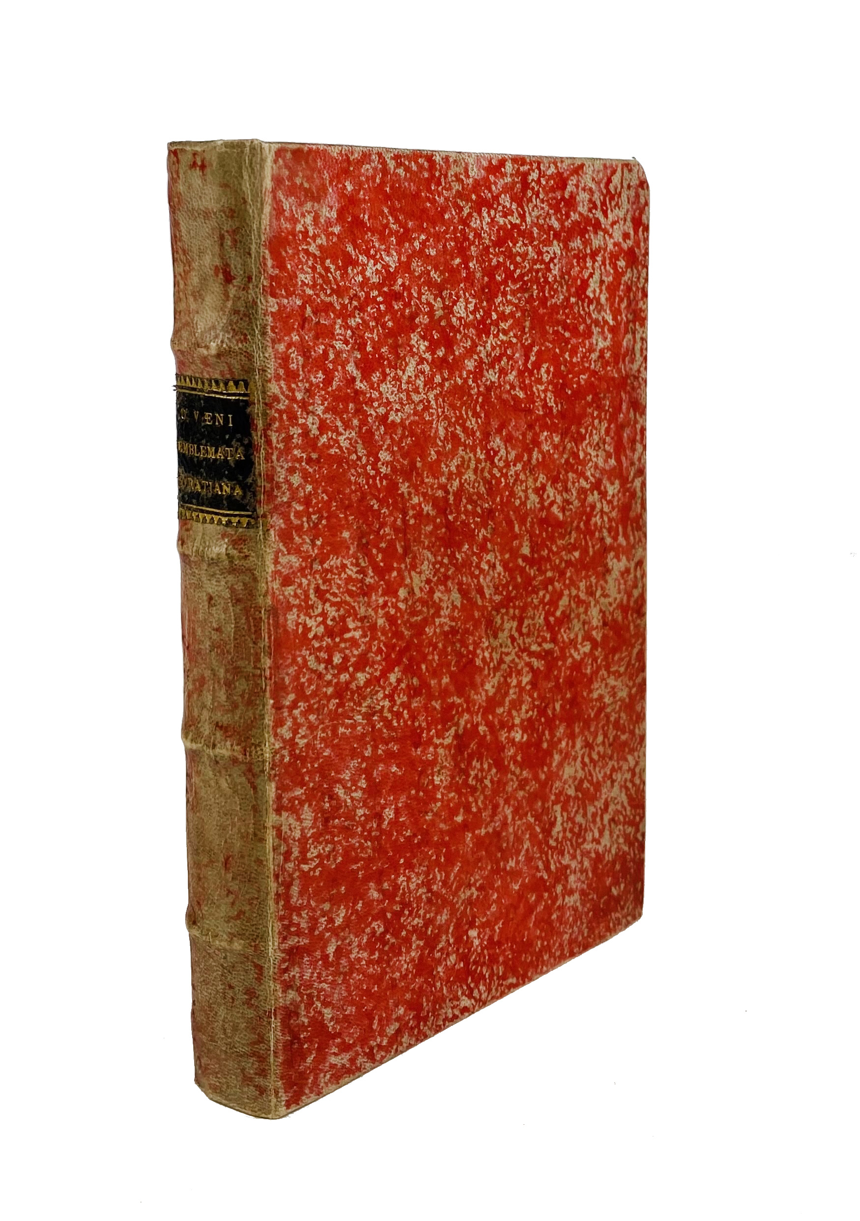 EMBLEM BOOKS -- VÆNIUS, O. Emblemata Horatiana, imaginibus in æs incisis atque Latino, Germanico, Gallico et Belgico carmine illustrata. Amst., H. Wetstenius, 1684. (16), 207, (9) pp. W. engr. ti. after G. de Lairesse, and 103 very fine engr. emblems in text after O. Vænius. Sm-8°. Later red mottled vellum w. raised bands & black label. (A bit age-toned).