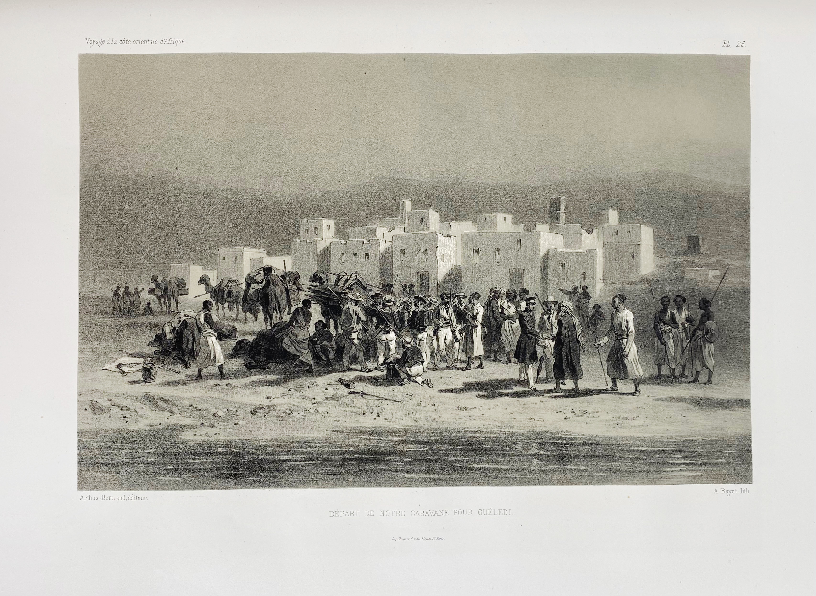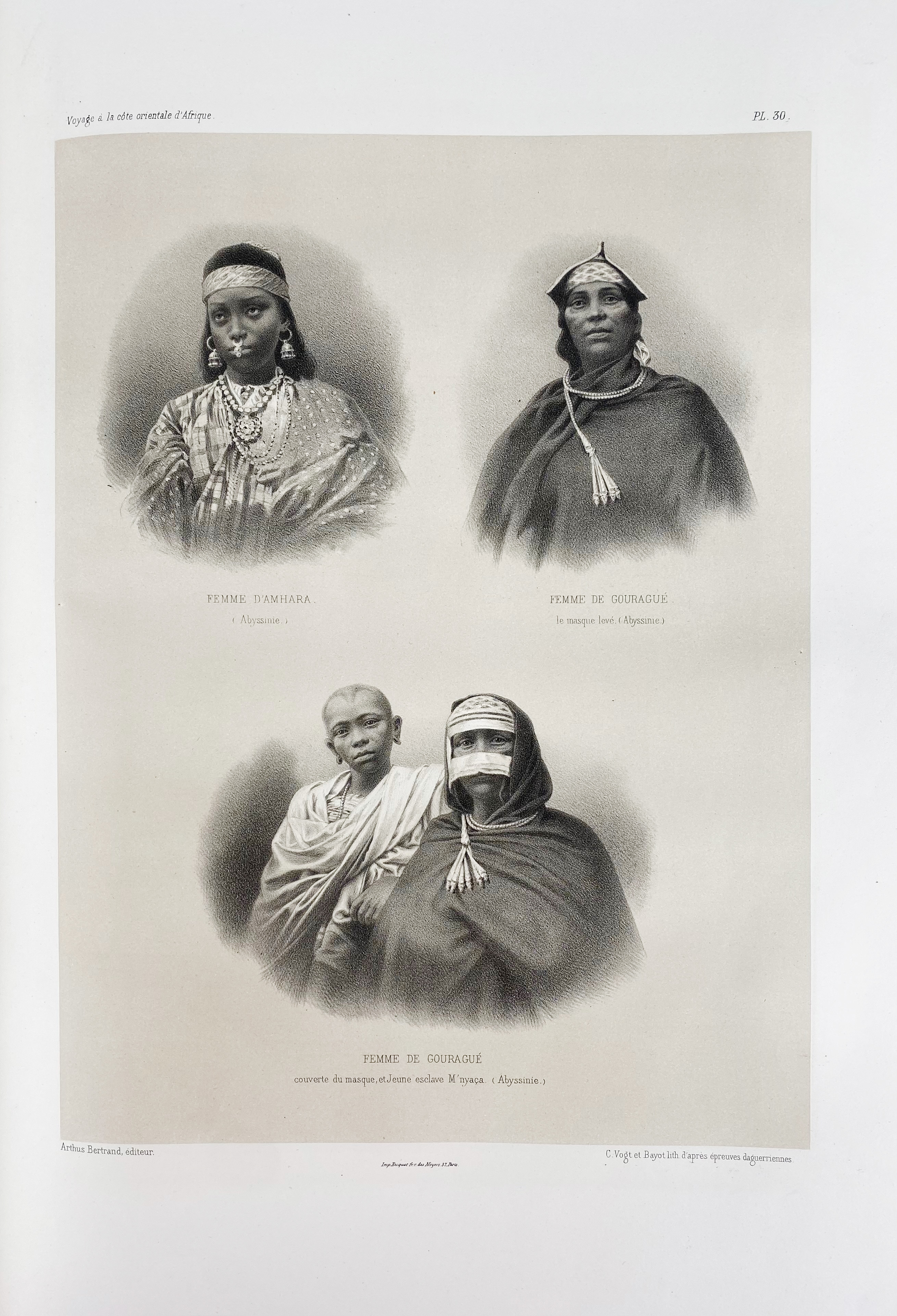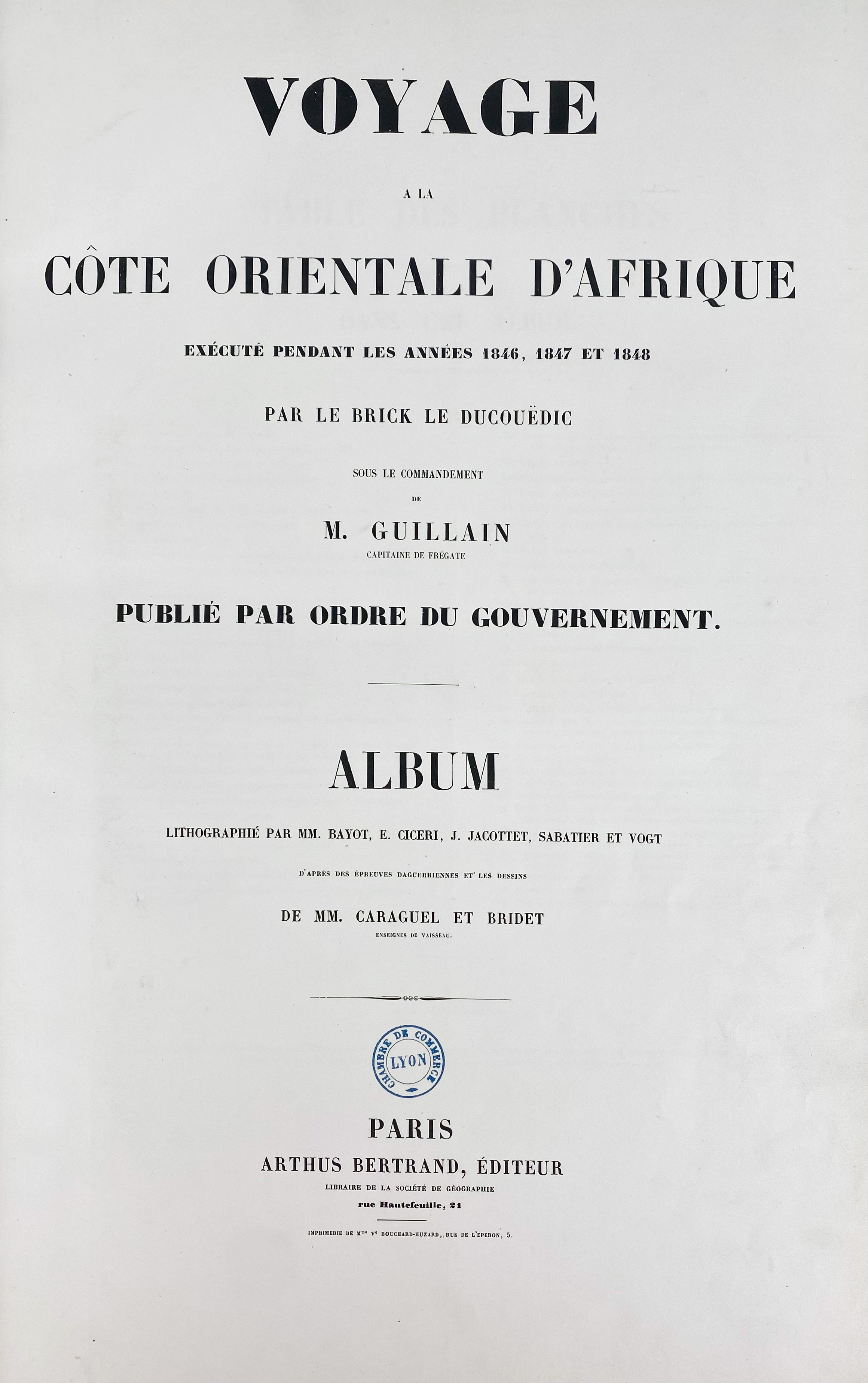 MARITIME HISTORY - TRAVELLING -- GUILLAIN, C. Voyage à la Coté orientale d'Afrique exécuté pendant les années 1846, 1847 et 1848 par le brick Le Ducouëdic. (Atlas only). Paris, A. Bertrand, (1857). W. ti-p., list of plates, 11 (fold./double-p.) lithogr. maps/plans and 45 lithogr. plates. Lge-fol. Cont. red h. mor. (Spine a bit chafed, small stamp on ti., without text-vols., lower outer margin a bit stained in places, else a fine and clean copy).