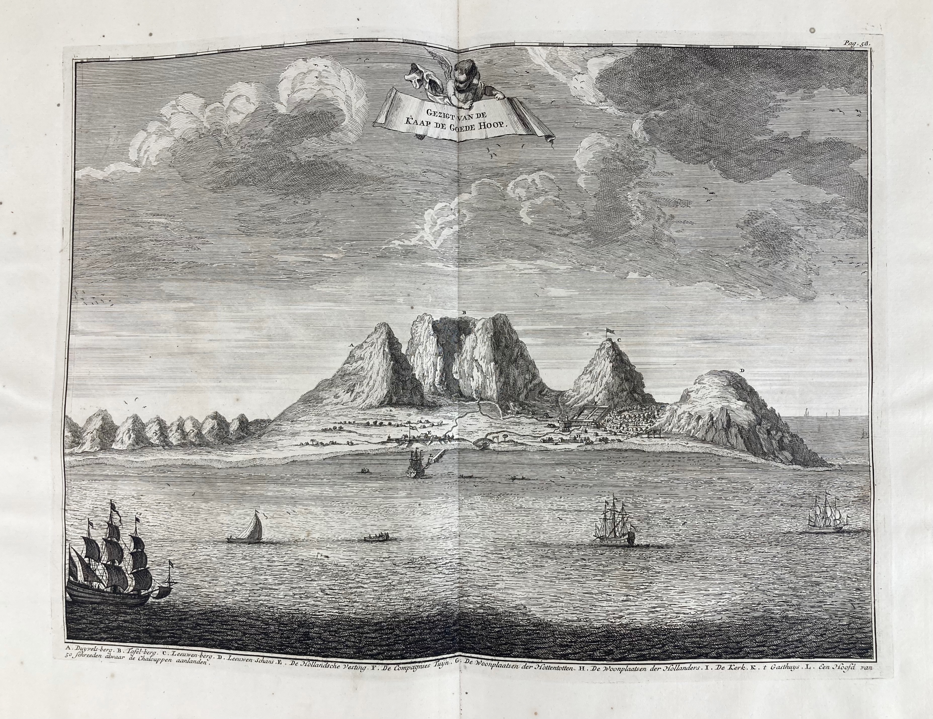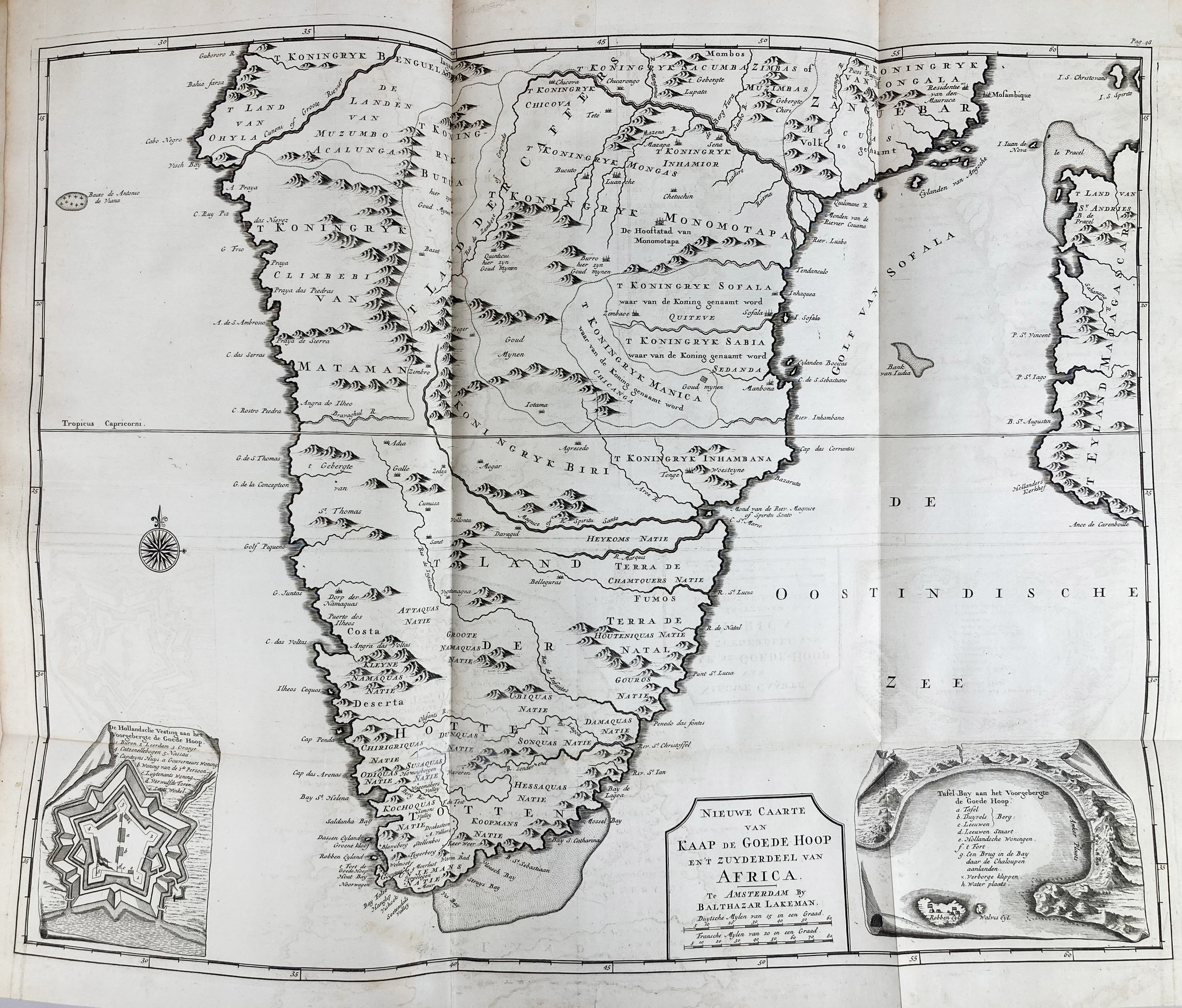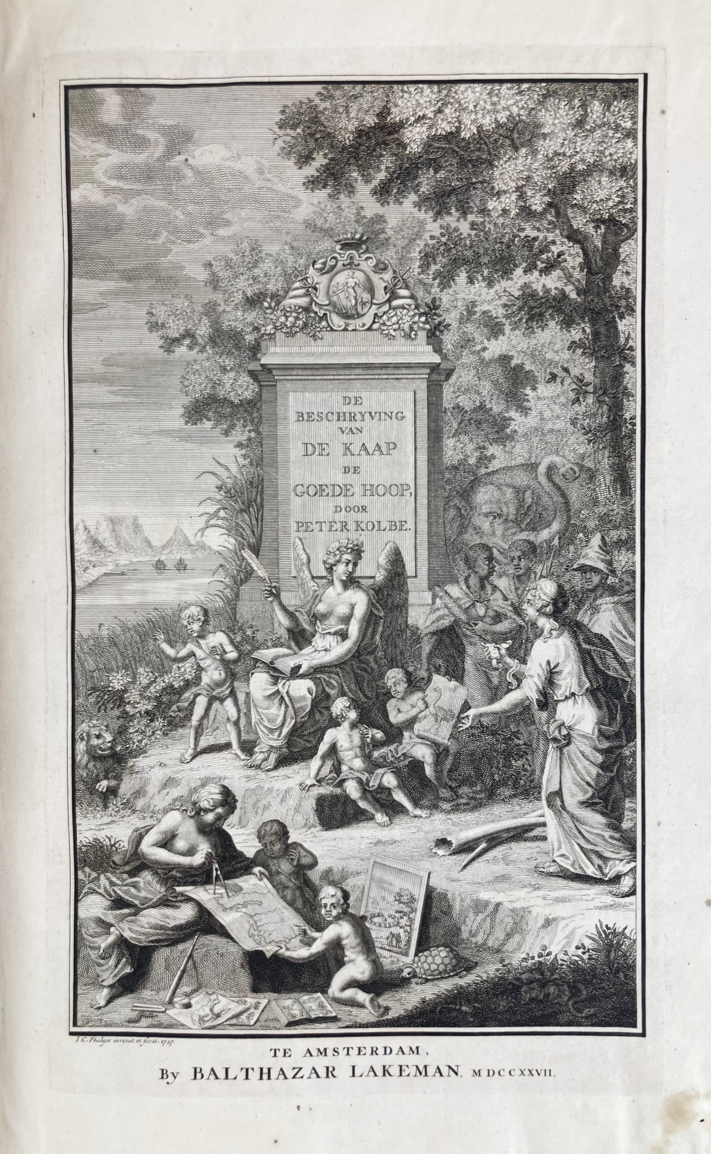 MARITIME HISTORY - TRAVELLING -- KOLBE, P. Naaukeurige en uitvoerige beschryving van de Kaap de Goede Hoop; (...); Nevens een geleerde beschryving van het klimaat en aart van dat landschap; (...); Waar bij nog komt een (...) beschryving van den oorsprong der Hottentotten. Amst., B. Lakeman, 1727. 2 vols. (16), 529, (2); (4), 449, (87) pp. W. ti.-engr. by Philips, engr. portr. of the author by Houbraken, 1 lge-fold. map, 5 double-p. maps, 1 double-p. engr. view & 45 full-p. engr. plates by Wandelaar, Philips, Elgersma, Pool & Zeeman. Fol. Restored cont. cf. binds. (Libr. stamps on both title-p., lower margin stained throughout both vols. (not affecting text, nor plates)).
