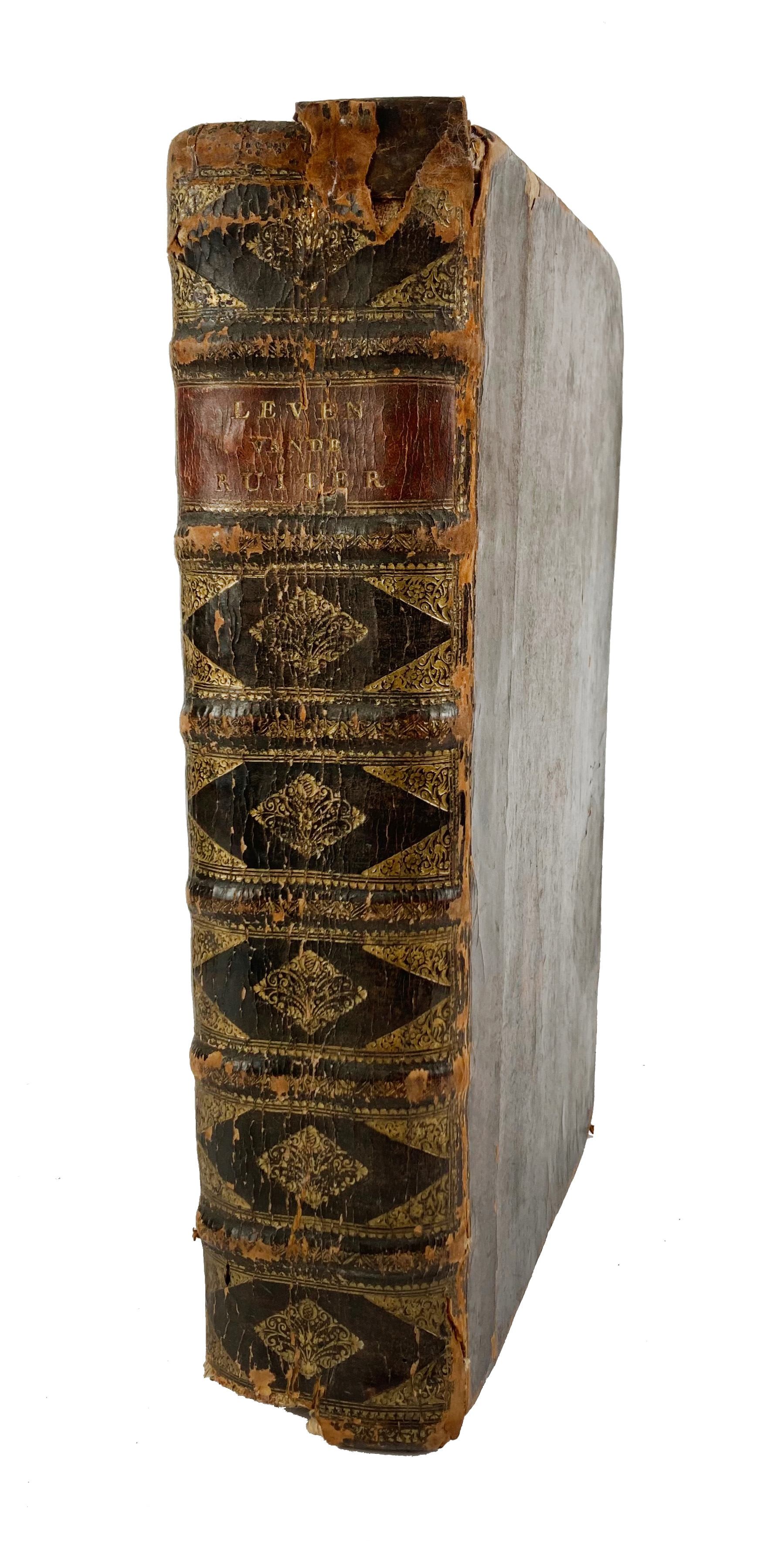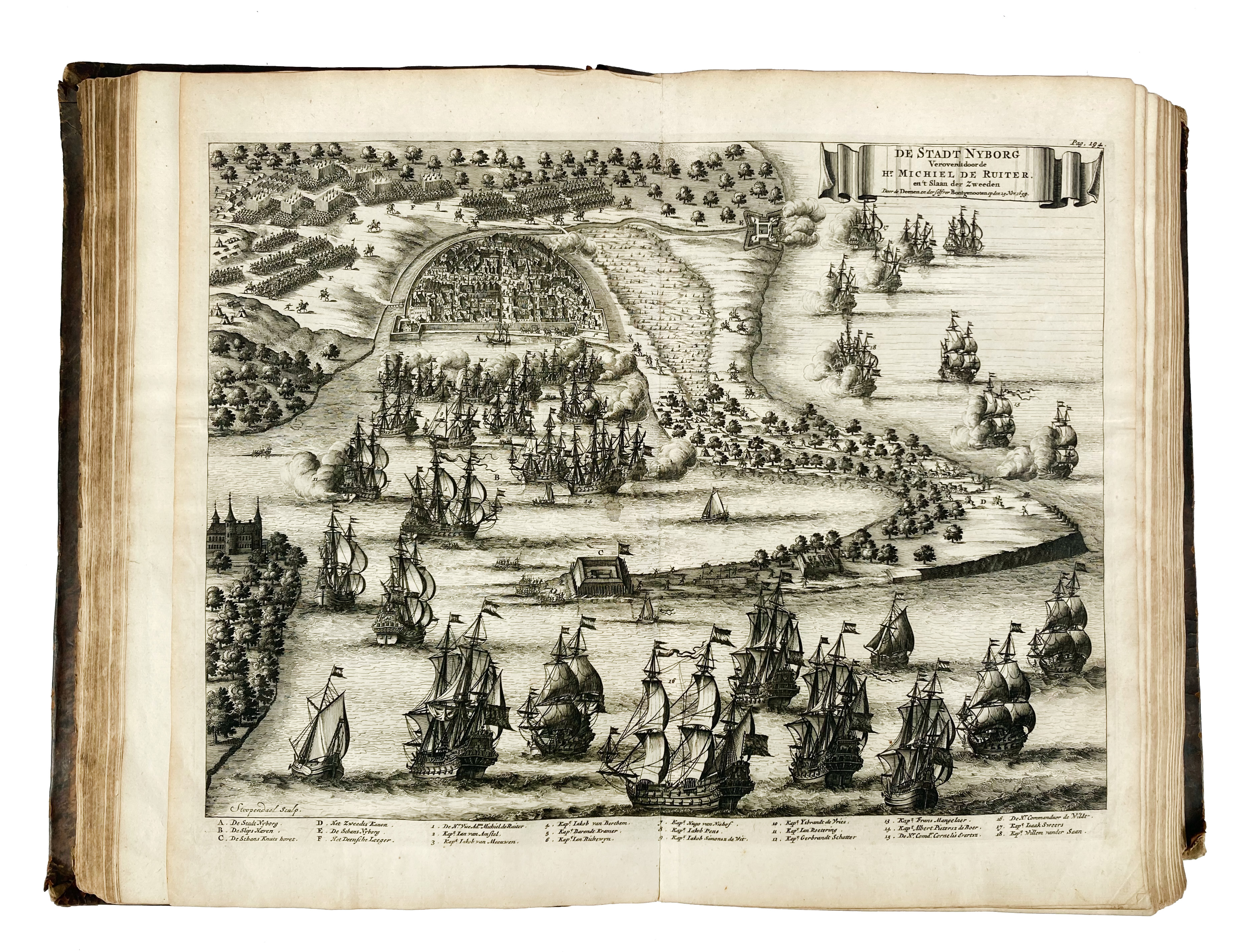 MARITIME HISTORY - TRAVELLING -- RUYTER -- BRANDT, G. Het leven en bedryf van den Heere Michiel de Ruiter. Amst., Voor Waasberge, Boom en Goethals, 1701. (10), 1065, (23) pp. W. engr. front., engr. portr. of De Ruyter and 8 (7 double-p.) engr. by B. Stoopendael (6 of which depict naval battles and 2 relating to De R.'s funeral). Fol. Cont. cf., spine w. raised bands & gilt dec., brown label. (Dam. to spine ends, upper hinge split, first free end-p. lacks, print near p. 574 w. a spot in the image, otherwise a very clean, neat, well-bound copy of this classic biography).
