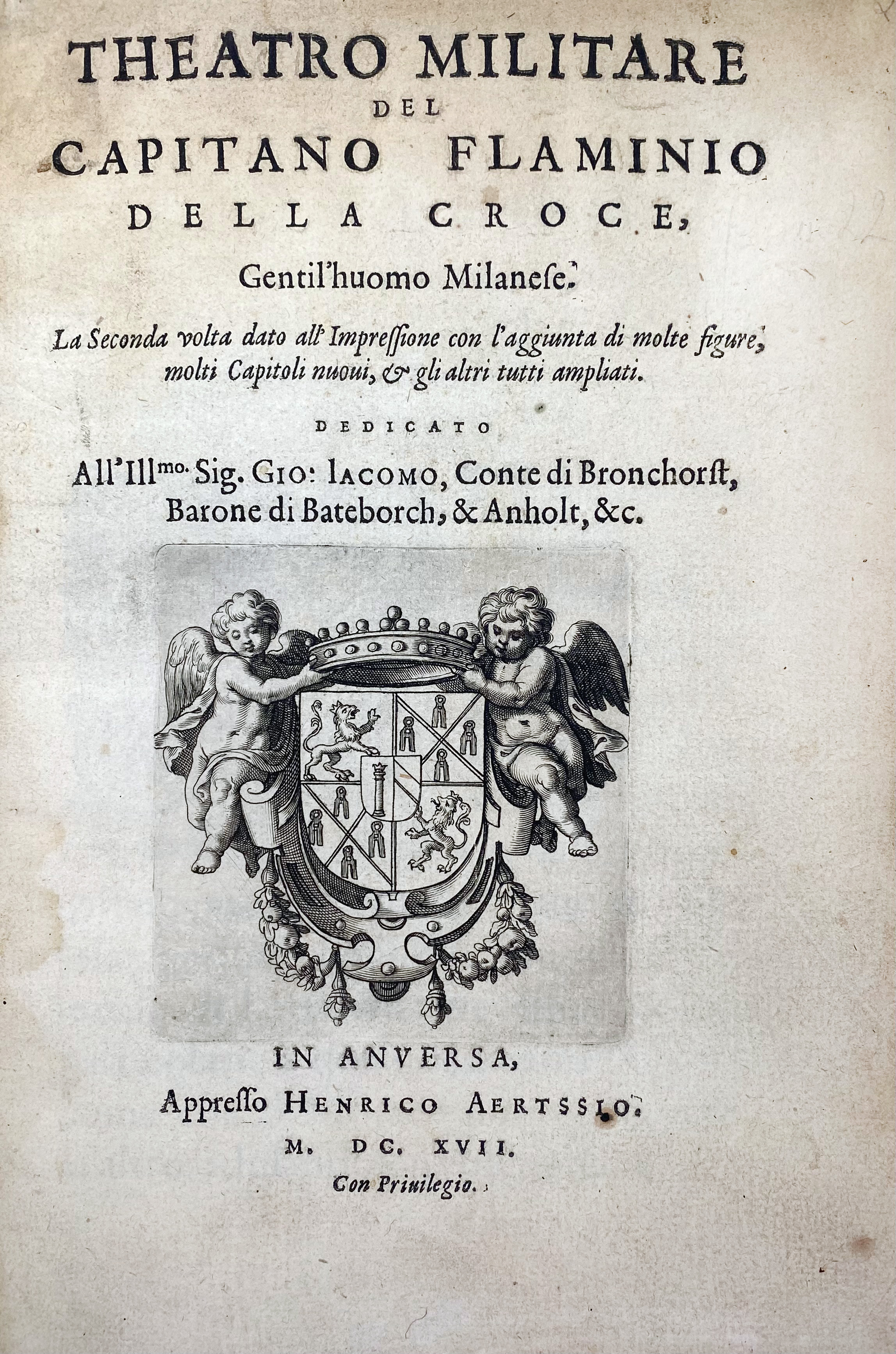 MILITARIA -- CROCE, F. della. Theatro militare. (2a ed.). Antw., H. Aertsens, 1617. (24), 343 pp. W. engr. coat of arms of a member of the van Bronckhorst-Batenburg (Anholt) family on ti-p., 15 (full-p.) engrs. 4°. Mod. vellum. (Margins waterstained at beginning and end).
