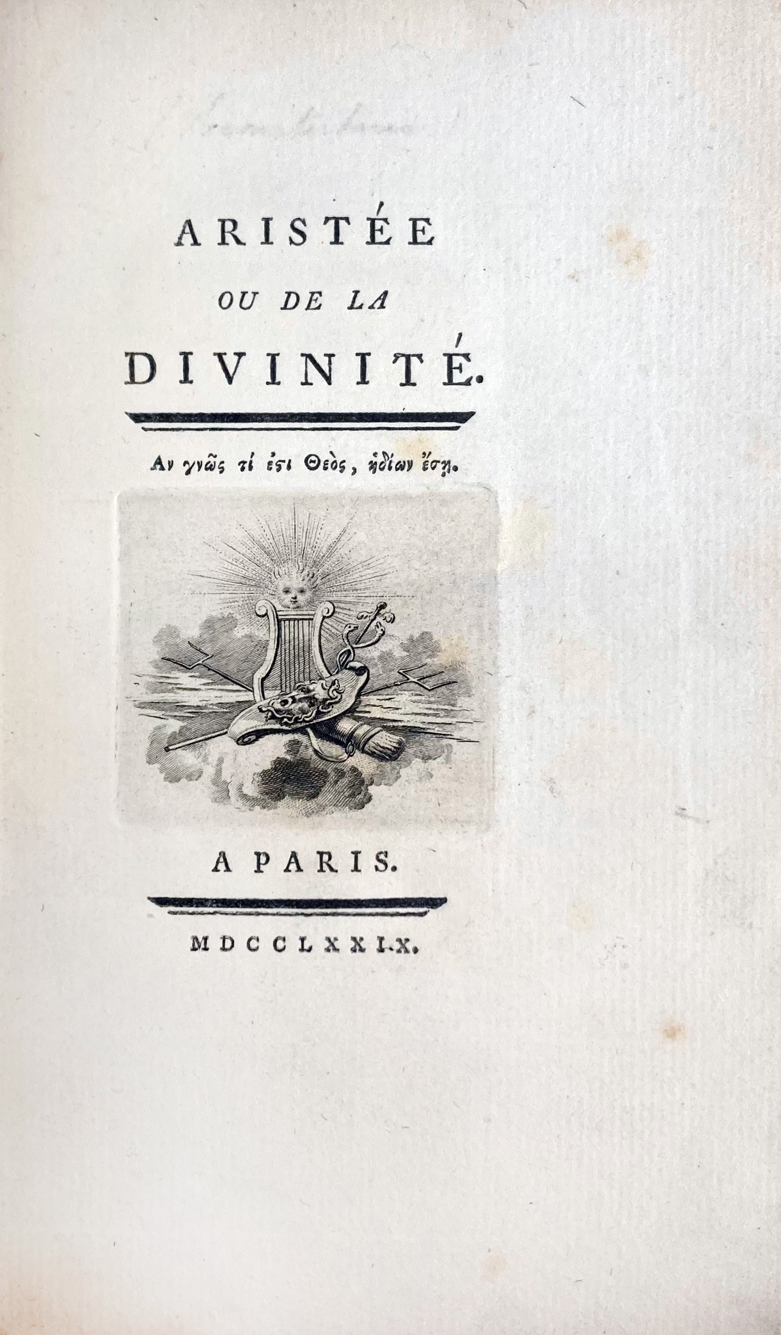 "In 'Aristée' Hemsterhuis, who originally believed in a personal God, is converted to a clear pantheism. God's omnipresence is the basis of man's relation with him, and it is mainly thanks to the moral principle, as the "moral organ" is called in later years, that man is able to come nearer to God." Encycl. of Phil. III, p. 474. - First edition, printed for private circulation only. Stoddard 9.