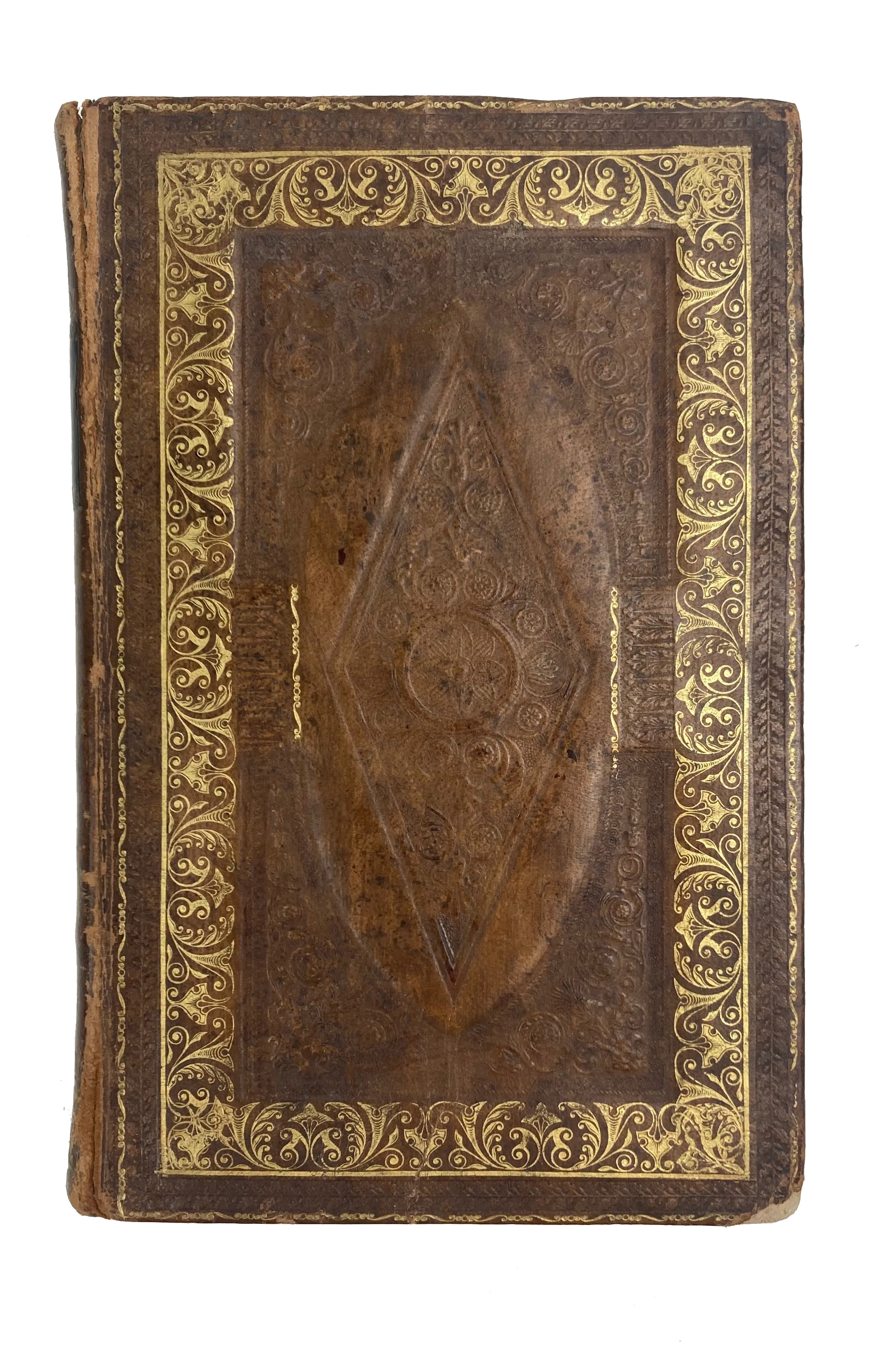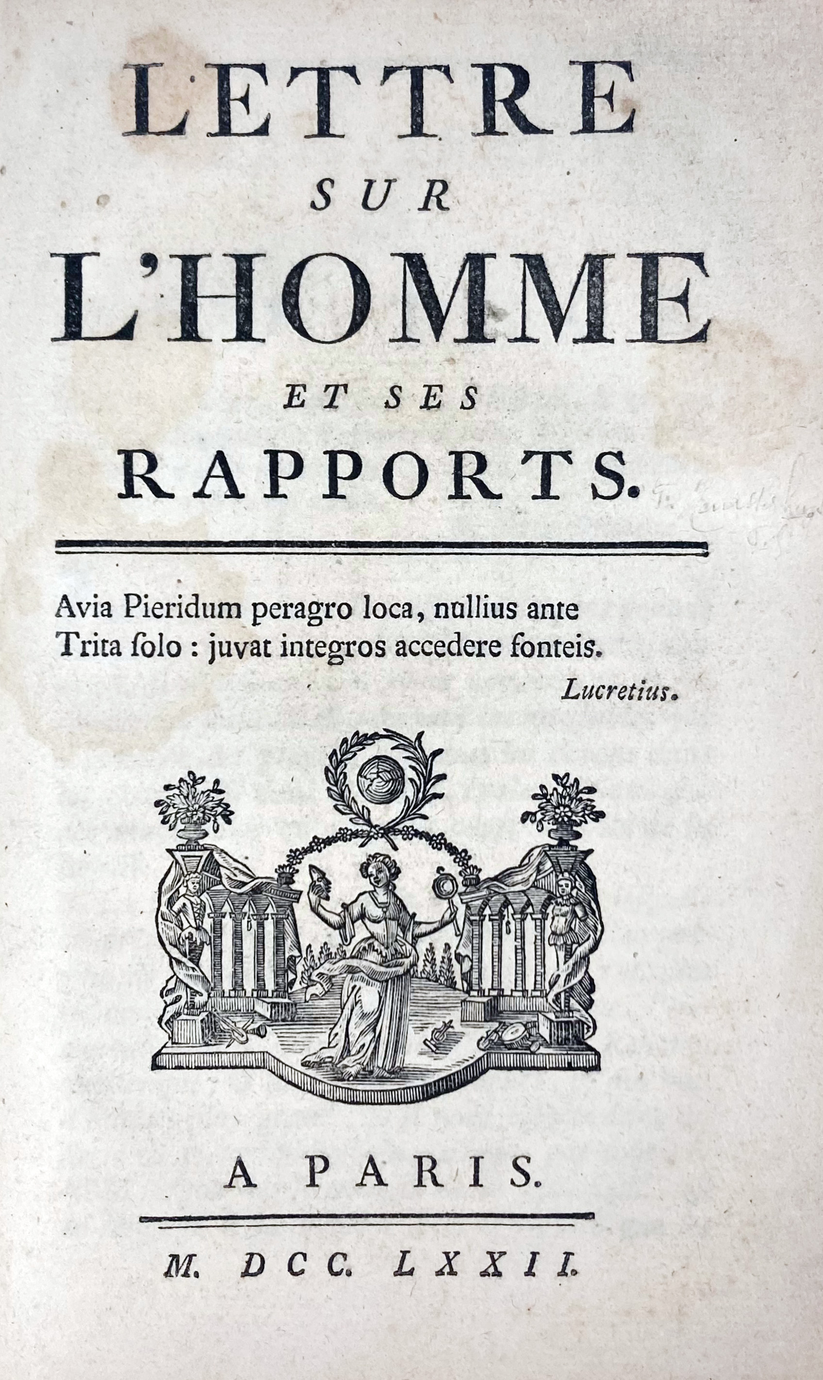 PHILOSOPHY -- (HEMSTERHUIS, F.). Lettre sur l'homme et ses rapports. Paris, (no publ.), 1772. 68 pp. W. title-vign. - Bound with: Th. PAINE. Théorie et pratique des droits de l'Homme. Paris, 1792. 251 pp. - And 2 o. works, tog. 4 works in 1 vol. 8°(!). 19th c. cf. w. gilt dec. spine w. black letterpiece, blind tooled & gilt stamped sides w. great central lozenge, gilt dec. edges, inside dentelles, marbled endpapers, all edges yellow. (Joints partly split at higher end, corners bumped, insides clean & tightly bound).