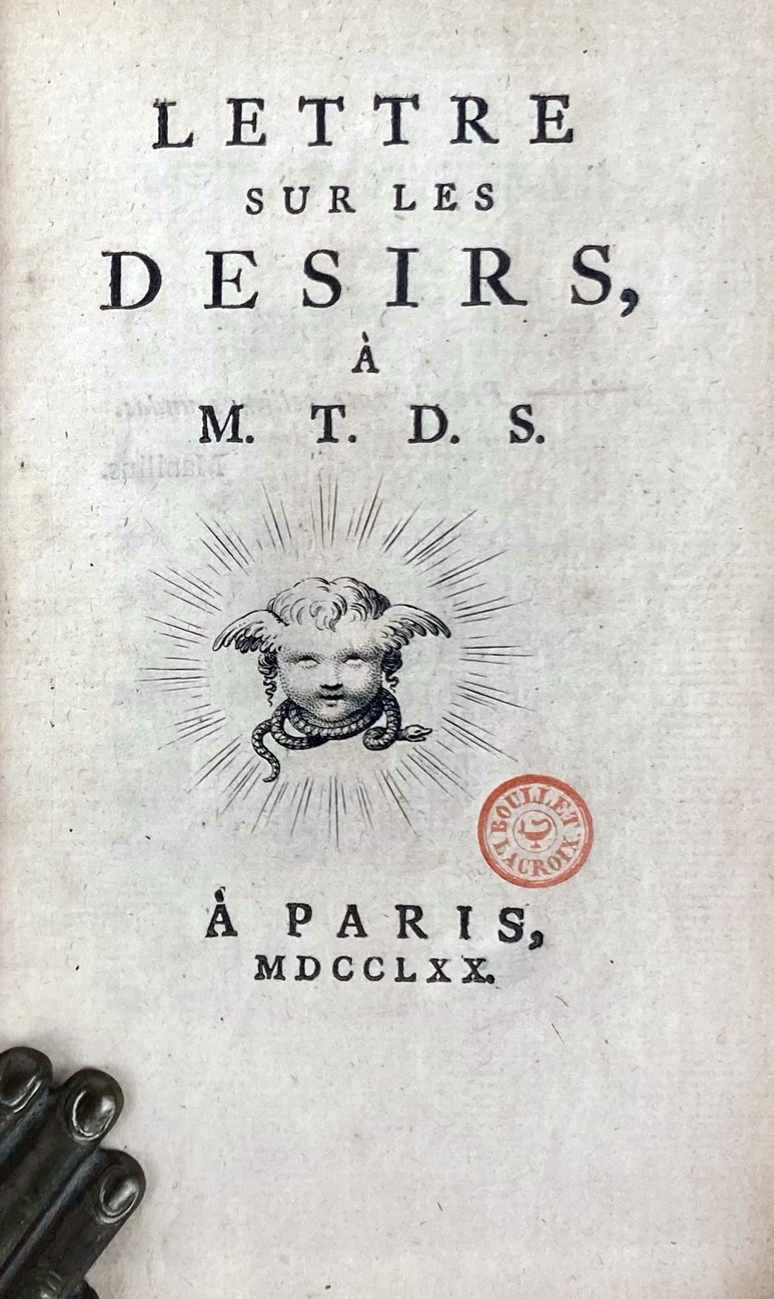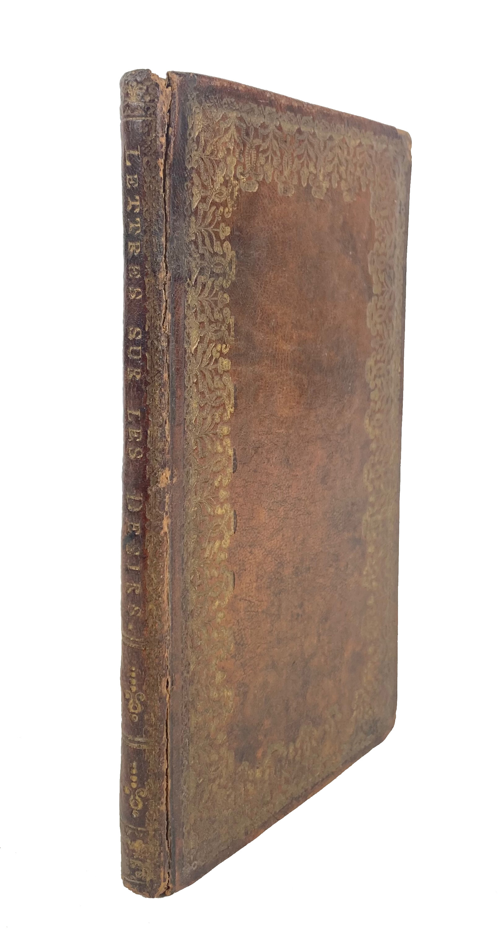 PHILOSOPHY -- (HEMSTERHUIS, F.). Lettre sur les Desirs, à M. T(heodoor) D(e) S(meth). Par., (=Haarlem), 1770. 53 pp. W. engr. ti-vign. & 2 small engr. in the text. Sm-8°. Cont. brown cf. w. spine & sides dec. in gilt, gilt dec. edges & inside dentelles, a.e.g. (Joints slightly split at head & foot, wear to extremities, w. annot. in old hands in ink on v° endpaper & discreet owner's stamp "Boullet-Lacroix").