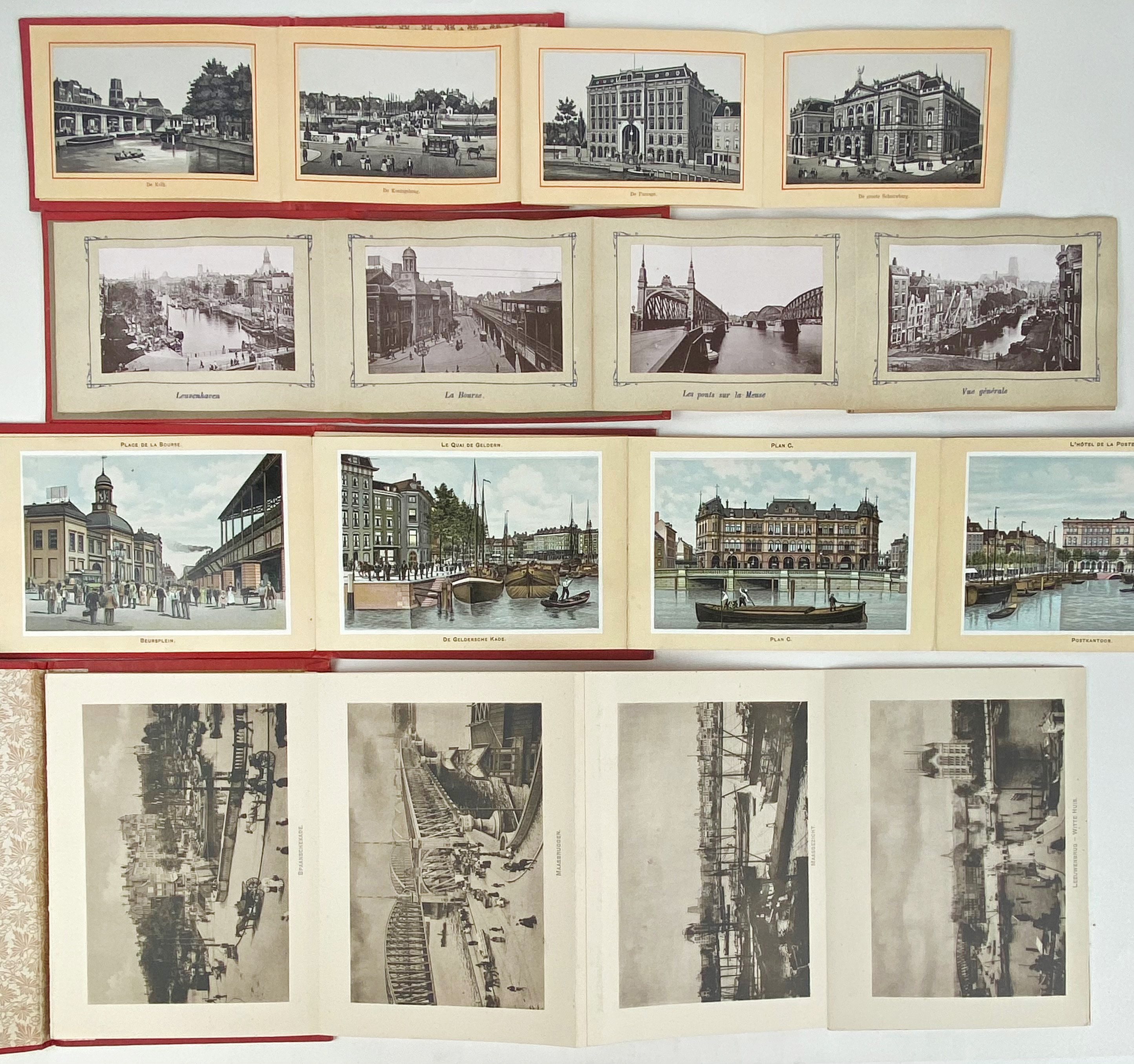 ROTTERDAM -- SOUVENIR de Rotterdam. Frankf., G. Blümlein & Co, (c. 1900). W. 18 cold. photo-lithogr. views. 8°-obl. Or. red cl. leporello album. -- ROTTERDAM. (c. 1888). W. 12 charming photo-lithogr. views. Sm-8°-obl. Ocl. leporello album. -- SOUVENIR de Rotterdam. Amst., J.M. Schalekamp, (c. 1900). W. 10 plates. 8°-obl. Or. lithogr. clothbacked brds. (Brds. a bit soiled, first plate loose). -- SOUVENIR aan Rotterdam. (c. 1915). W. 12 plates. Or. gilt dec. red cl. leporello album. -- And 18 o. souvenir booklets/albums and postcard envelopes. (22).