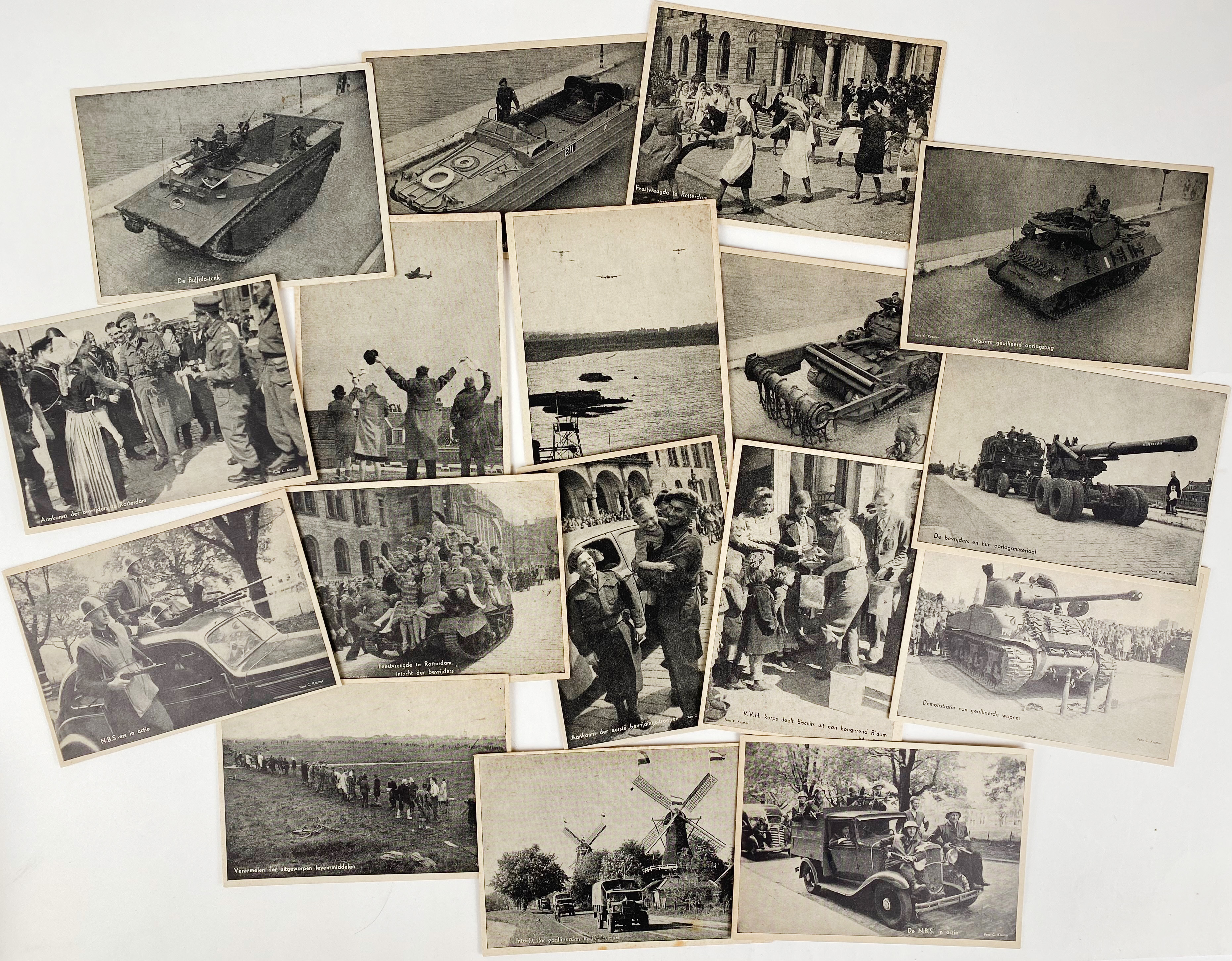 ROTTERDAM -- "VERWOESTING ROTTERDAM". 36 or. photos. (1940). Printed on Ridax paper (Gevaert). 90 x 140 mm each. (Photos a bit warped). Printed in a very small edition. -- COLLECTION of 19 photo cards by Carel Kramer (1883-1957), incl. 2 duplicates. (1945). Printed on 'oorlogspapier'. 102 x 148 mm each. -- VERWOESTE HAVENS Rotterdam. Serie I-III. VERWOESTE PLEKJES in Rotterdam. Serie I-III. ONZE BEVRIJDERS in beeld. BEELDEN uit de bevrijdingstijd (3x). (c. 1945). 10 small or. leporello envelopes w. 8 images each (incl. 2 duplicates). 75 x 105 mm. Or. printed envelopes. -- FOTO'S VAN ROTTERDAM. (1950's). 10 or. photo's of Rotterdam. 68 x 90 mm each. In or. printed portfol. w. Zadkine's statue on front side. -- And 2 o. (68).