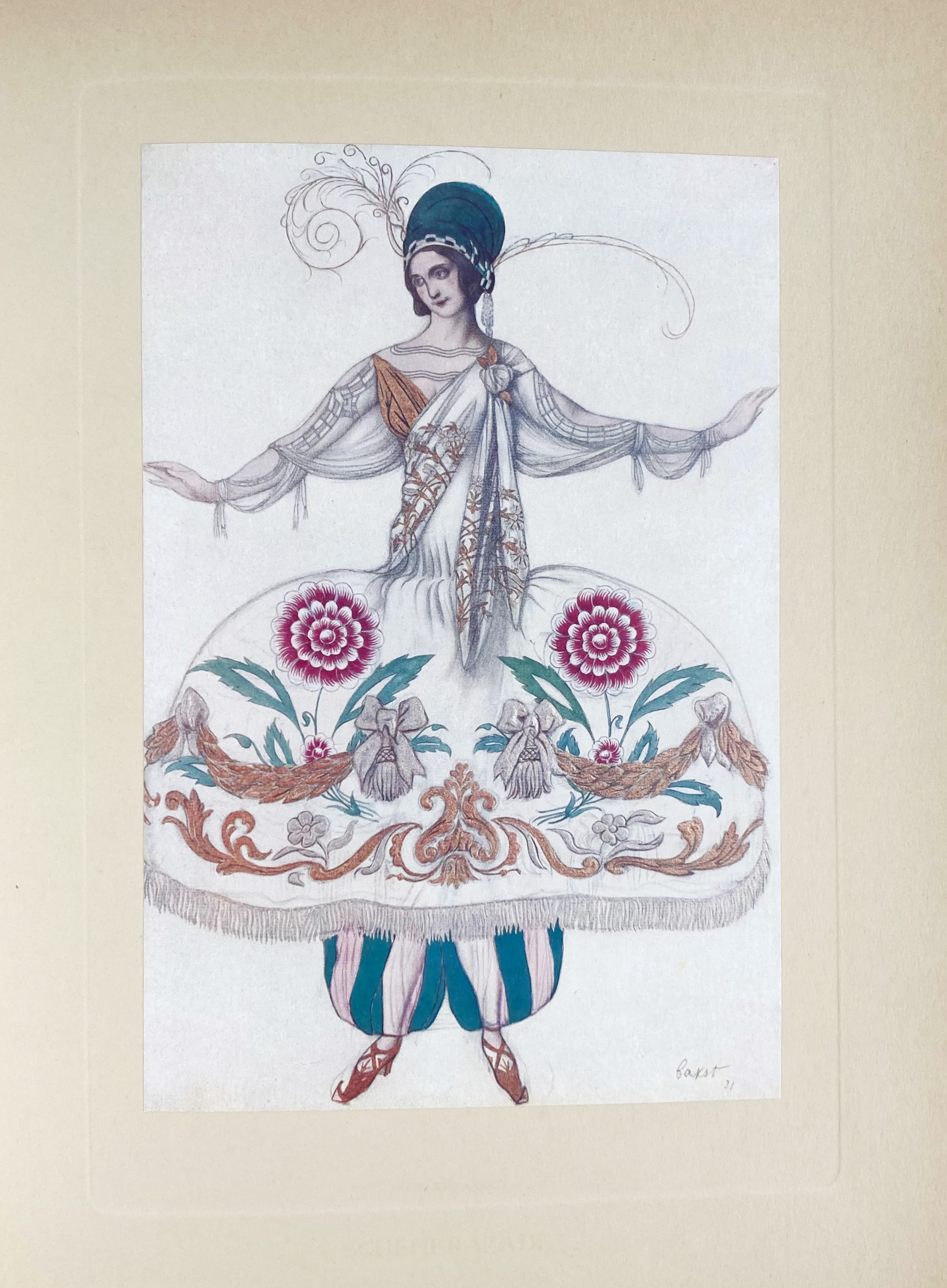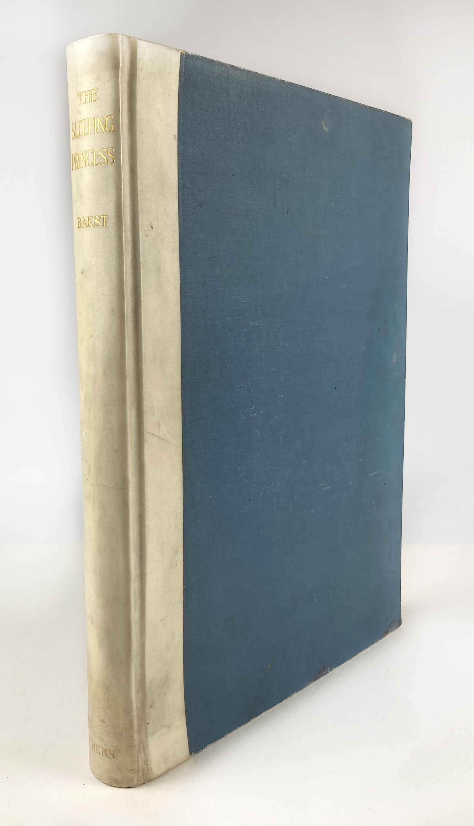 BAKST, L. The designs for the Sleeping Princess. A Ballet in Five Acts after Perrault. Preface by A. Levinson. Lond., Benn Brothers, 1923. 18 pp. W. portrait of Bakst after Picasso, plates on title-p. & content-p. & 54 full-p. cold. plates (1 fold.). Fol. Or. h. vellum w. blue cl. sides & gilt lettering on spine, deckle edges, t.e.g. (Some wear to extremities, slight waterstains to some of the upper margins).