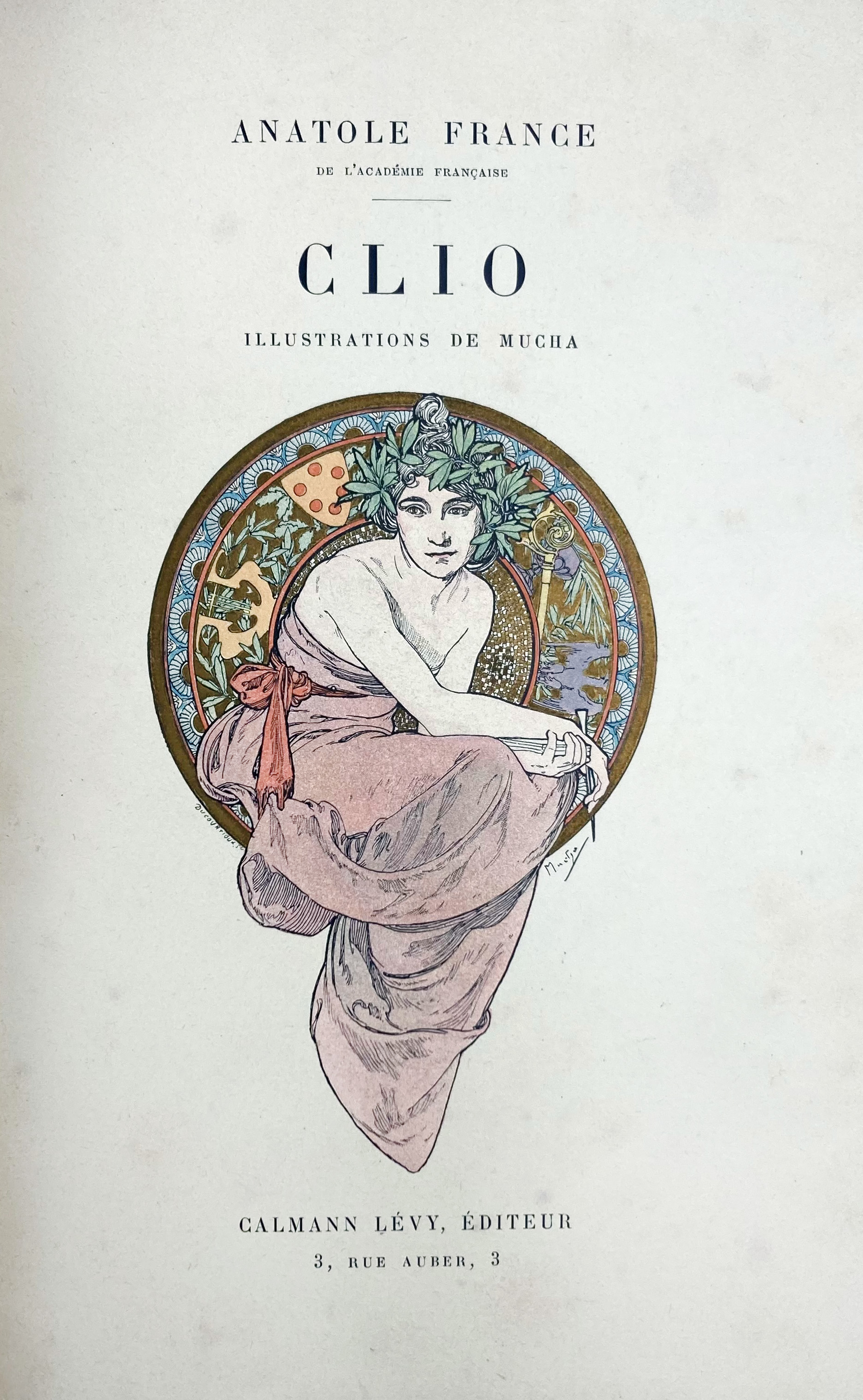 MUCHA -- FRANCE, A. Clio. (Paris), Calmann Lévy, 1900. (10), 188, (4) pp. W. 13 fine cold. illustr. in text by A. Mucha. Elegant cont. light brown mor. w. gilt sides, gilt spine, inside dentelles, t.e.g., signed by the Belgian bindery De Samblanx & J. Weckesser on foot of v° front cover. In marbled paper slipcase. (Spine a bit discold., some very mild foxing to first and last lvs.).