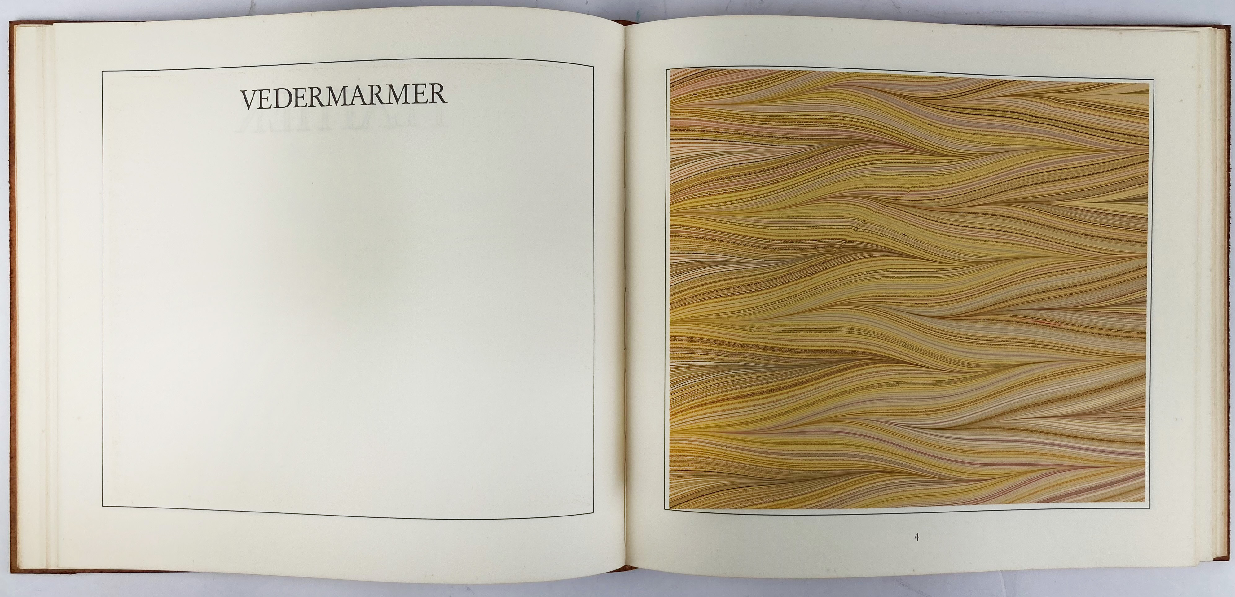 Printed in 100 numbered and signed copies, but our copy numb. 102 (accomp. note explaining that nrs. 1-5 were not numbered). Beautiful samples of marbled paper, showing various types of marbled paper: "Feather. Vedermarmer" (6 samples), "Nonpareil. Kammarmer" (10 samples), "Bouquet. Boeketmarmer" (7 samples) and "Peacock. Pauwstaartmarmer" (6 samples).